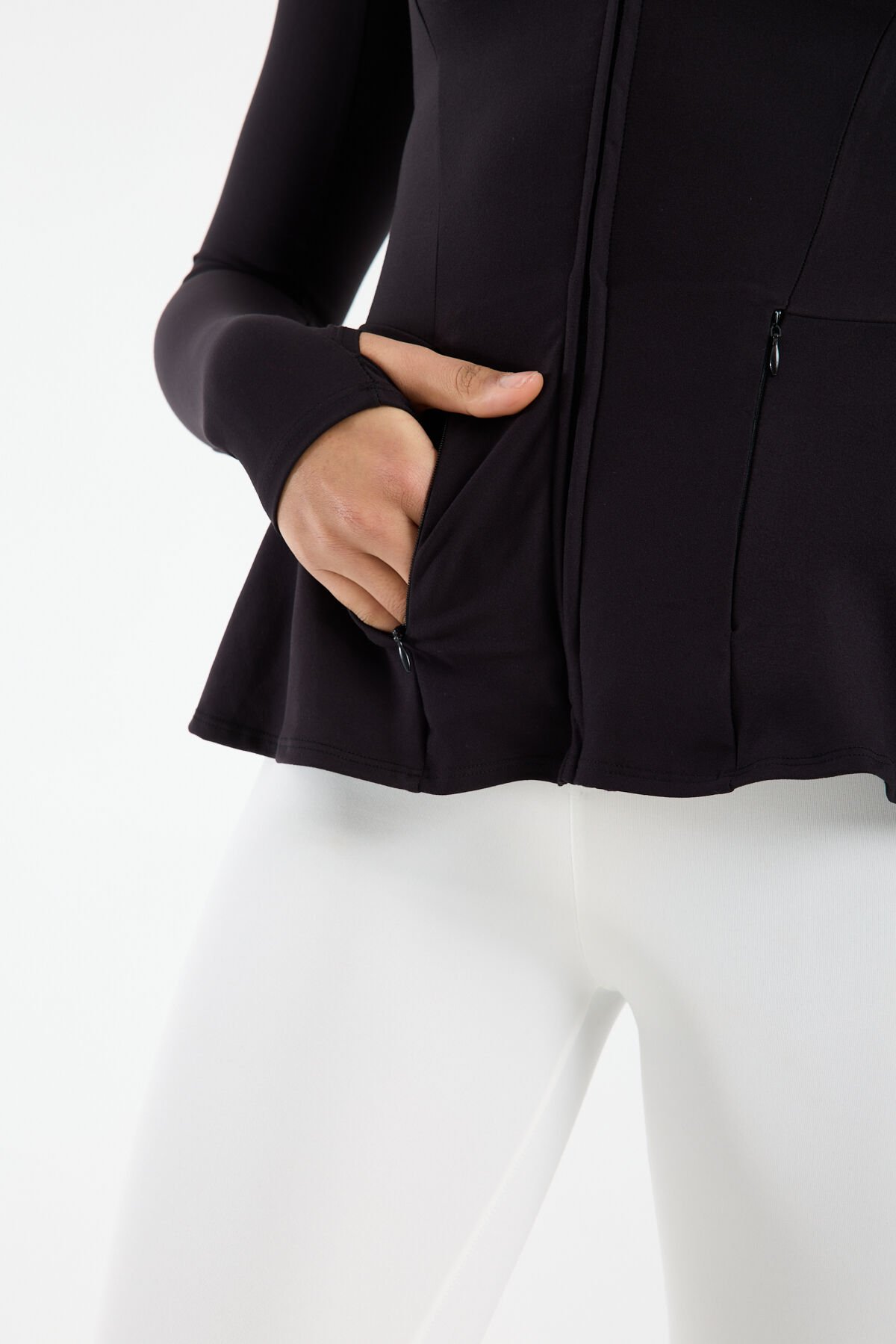 Ter tutmayan kumaş teknolojisiyle üretilen Kadın Dik Yaka Fermuarlı Volan Detaylı Esnek Spor Ceket, spor aktiviteleri, yürüyüş ve günlük kullanım için ideal bir tercihtir. Yan cep yapısı fonksiyonellik kazandırırken uzun silueti sayesinde farklı kombinlerle kolayca uyum sağlar.