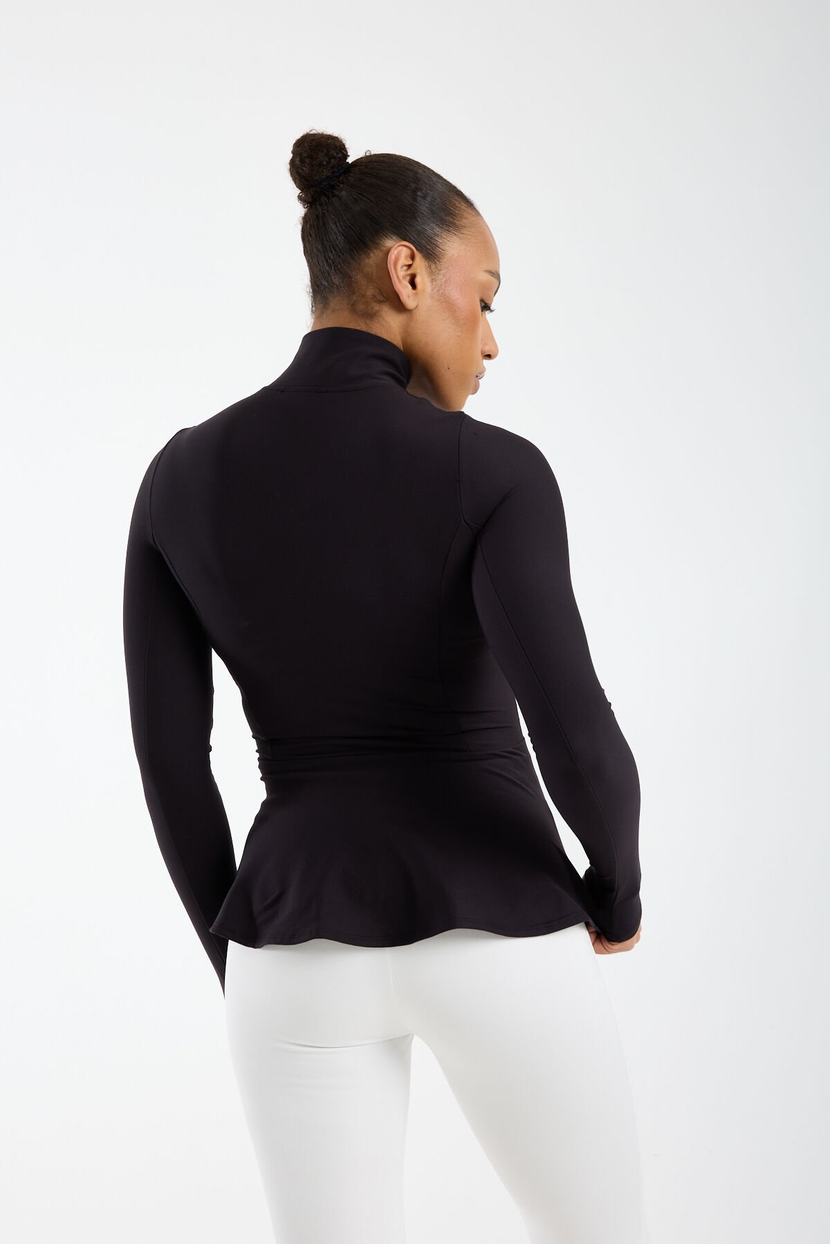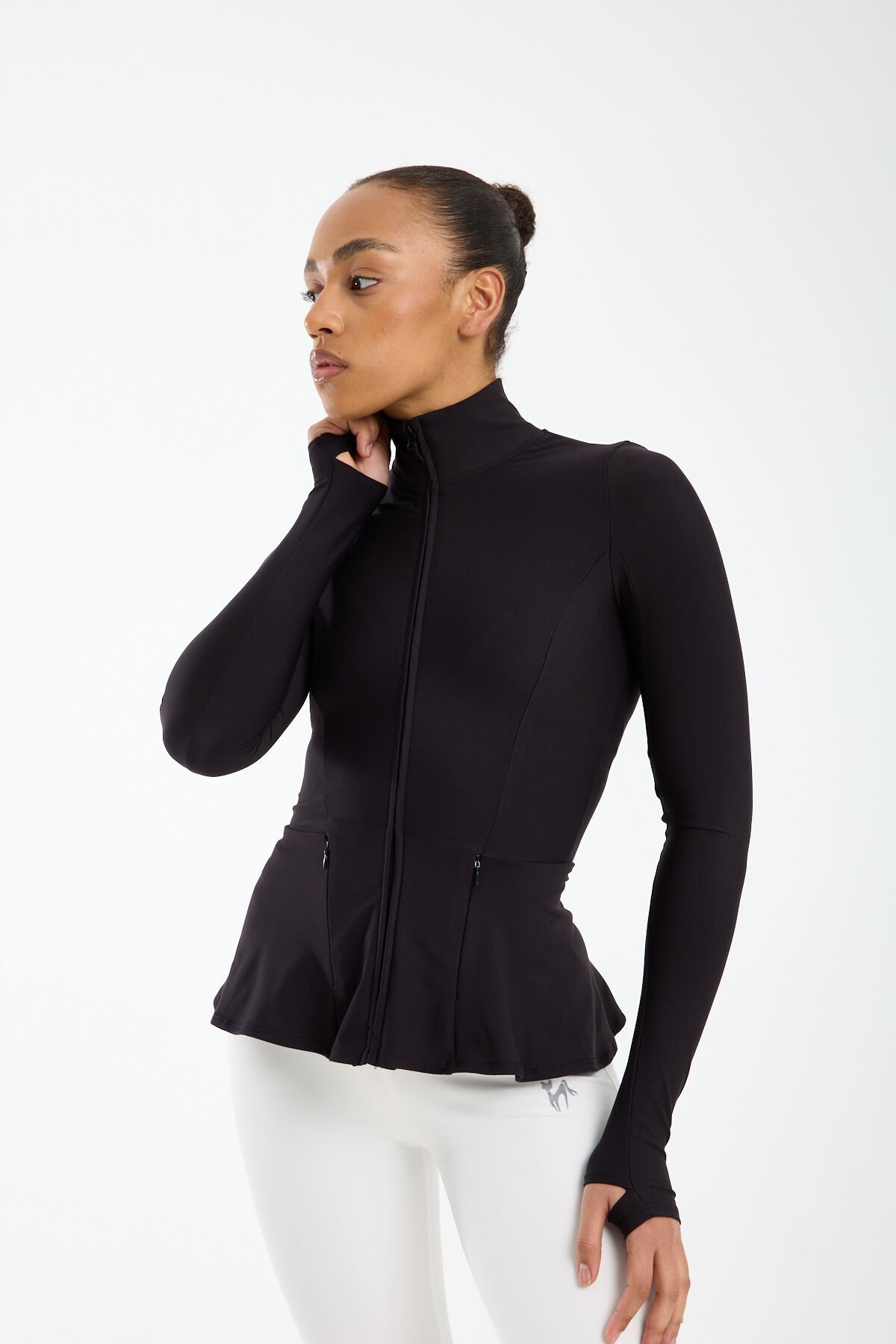 Fitted kalıbı ile vücudu nazikçe saran Kadın Dik Yaka Fermuarlı Volan Detaylı Esnek Spor Ceket, dik yaka ve çene korumalı yapısı sayesinde rüzgâra karşı ekstra koruma sağlar. Tam fermuarlı kapama detayı pratik kullanım sunarken volan detayları sportif şıklığı feminen bir dokunuşla tamamlar.
