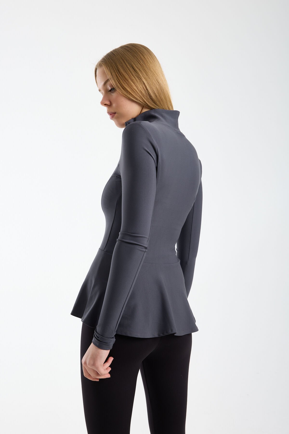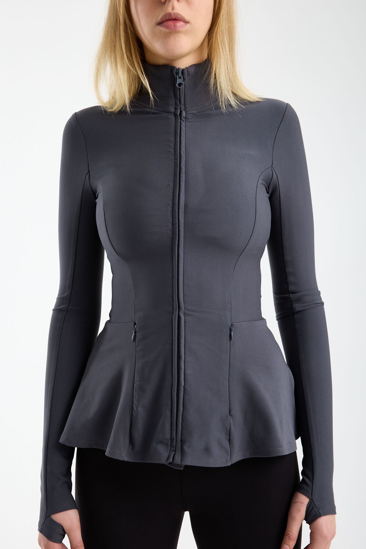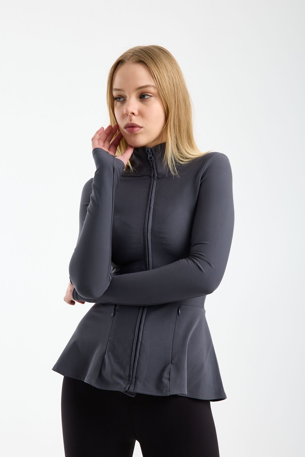 Kadın Dik Yaka Fermuarlı Volan Detaylı Esnek Spor Ceket XL - KOYU GRİ
