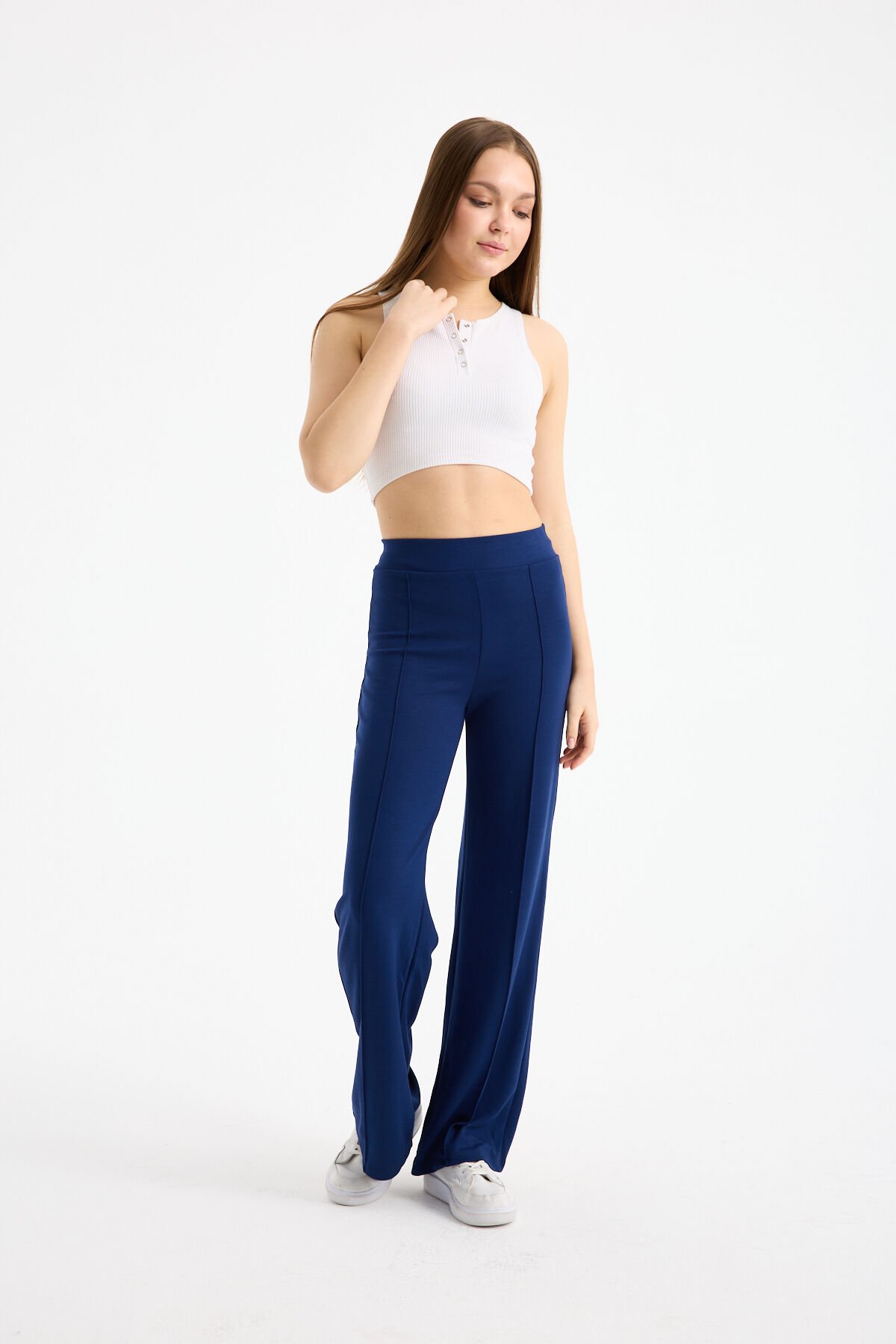 Kadın Dökümlü ve Dokulu Alt Ön Dikişli Esnek Eşofman Altı, gün boyu konforu ve modern görünümü bir arada sunmak üzere tasarlanmıştır. Yüksek bel formu bel bölgesini toparlarken, beli lastikli yapısı rahat bir kullanım sağlar. Viskon karışımlı yumuşak kumaşı dökümlü bir duruş kazandırır ve ciltle temas ettiğinde hafif bir his sunar.