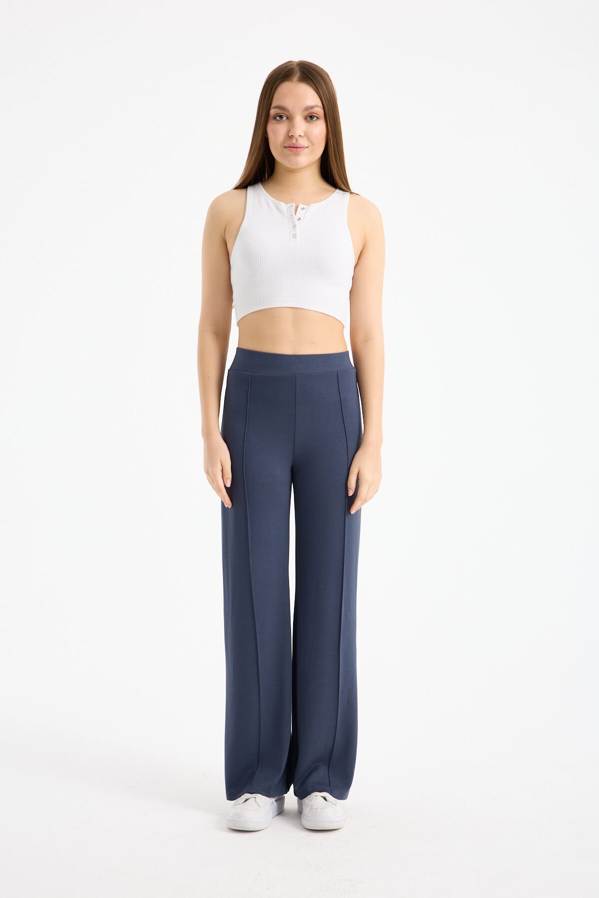 Kadın Dökümlü ve Dokulu Alt Ön Dikişli Esnek Eşofman Altı, gün boyu konforu ve modern görünümü bir arada sunmak üzere tasarlanmıştır. Yüksek bel formu bel bölgesini toparlarken, beli lastikli yapısı rahat bir kullanım sağlar. Viskon karışımlı yumuşak kumaşı dökümlü bir duruş kazandırır ve ciltle temas ettiğinde hafif bir his sunar.