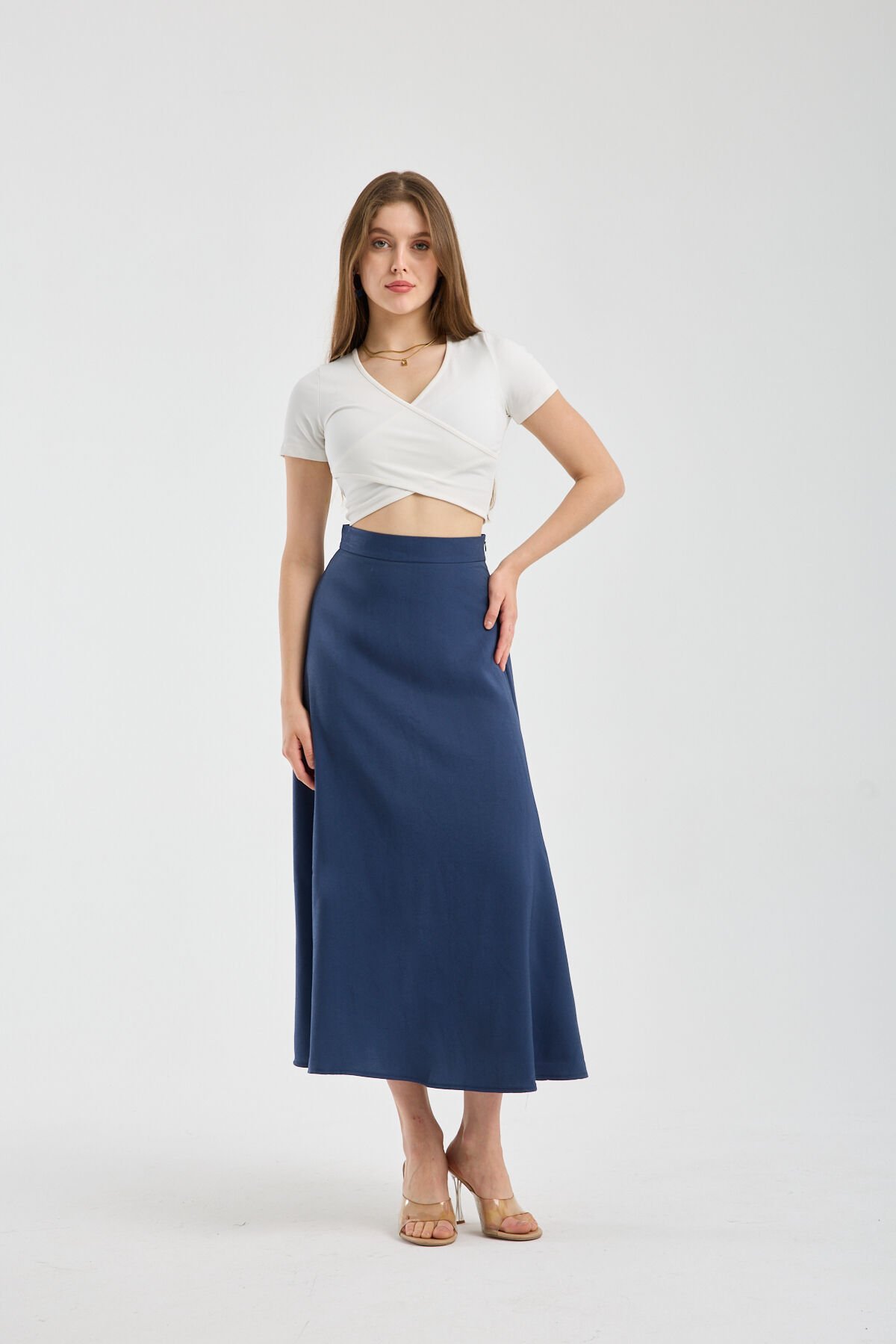 Yüksek bel formu ile konforlu bir kullanım sağlayan Kadın Dökümlü Yandan Fermuarlı Tesettür Uyumlu Uzun Kloş Etek, yandan fermuarlı yapısıyla pratiklik sunar. İç göstermeyen dokusu günlük kullanımda güven verirken gabardin kumaşı tok duruş sağlar.