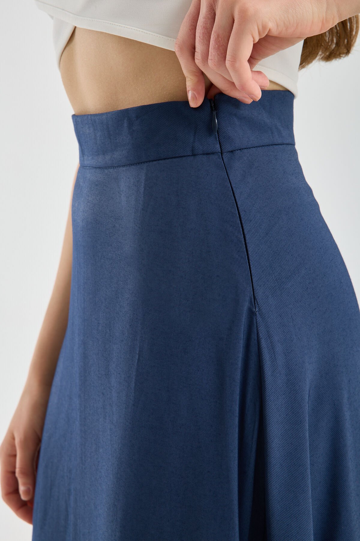 Ofis kombinlerinden günlük tesettür stiline kadar geniş kullanım alanı sunan Kadın Dökümlü Yandan Fermuarlı Tesettür Uyumlu Uzun Kloş Etek, tunik, gömlek ve uzun ceketlerle kolayca kombinlenebilir.