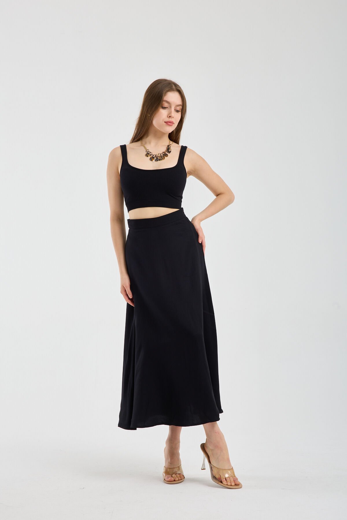 Ofis kombinlerinden günlük tesettür stiline kadar geniş kullanım alanı sunan Kadın Dökümlü Yandan Fermuarlı Tesettür Uyumlu Uzun Kloş Etek, tunik, gömlek ve uzun ceketlerle kolayca kombinlenebilir.