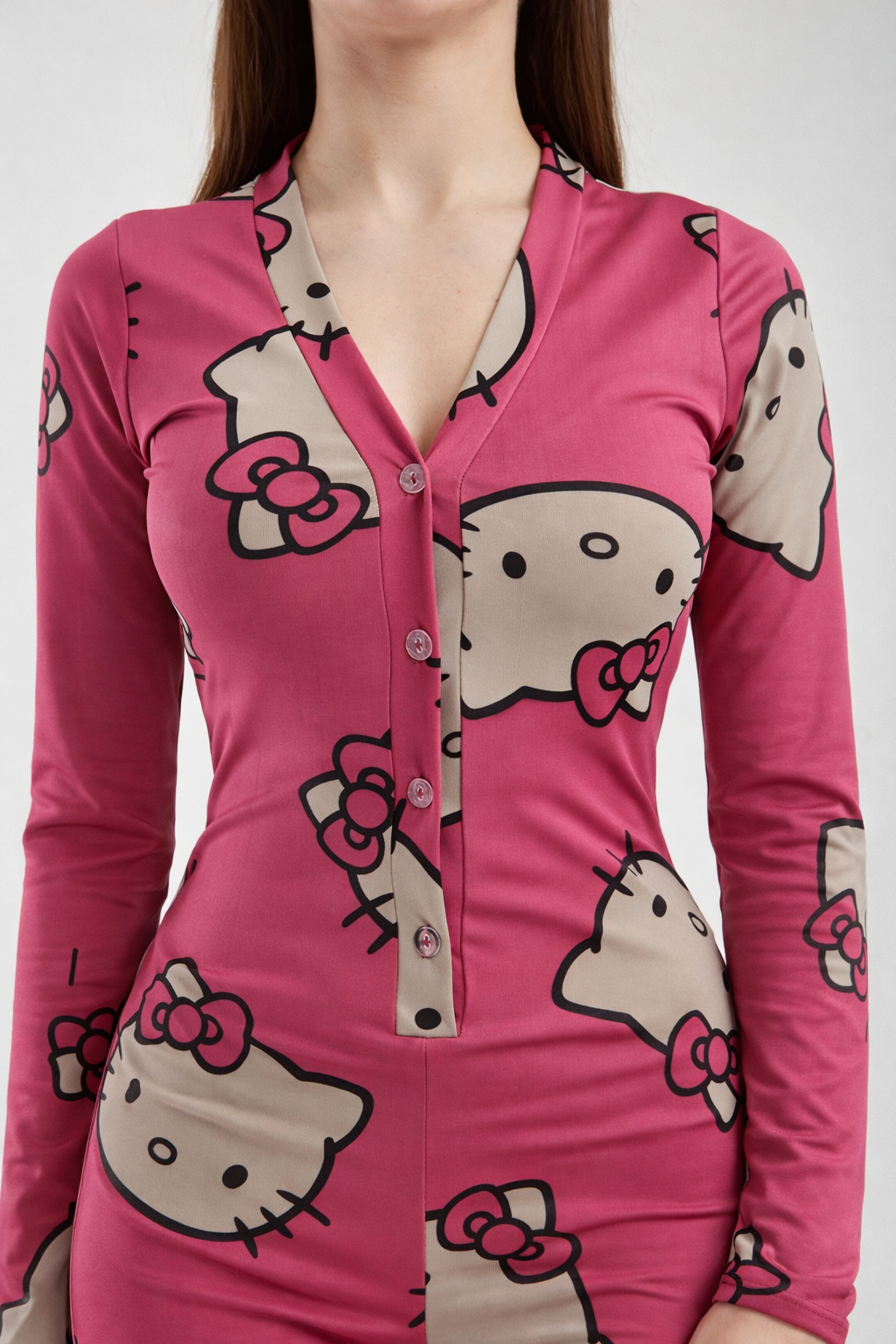 Kadın Düğmeli Esnek Uzun Kol Dalgıç Kumaş Pijama Tulum T4 XS - KİTY DESENLİ