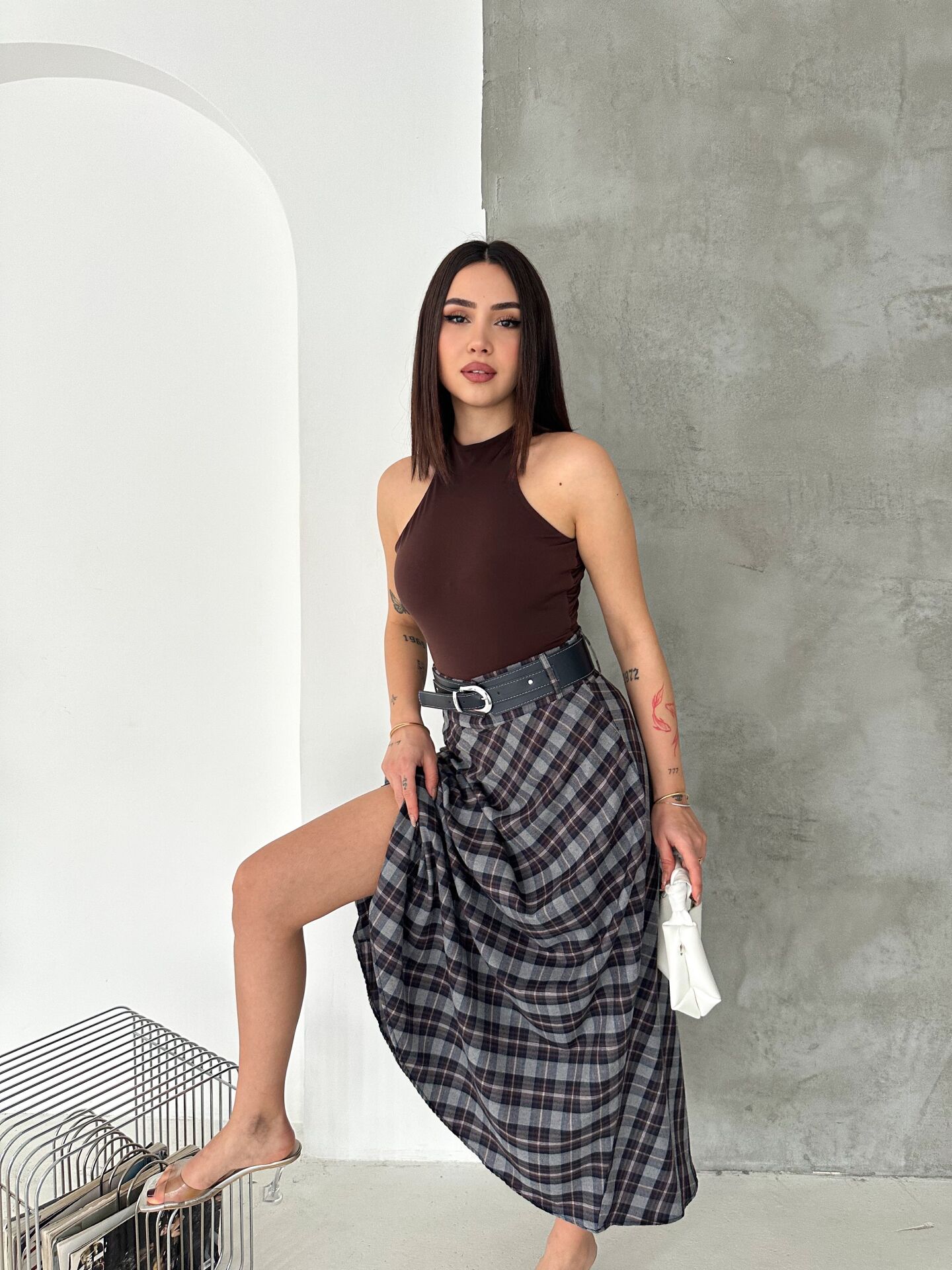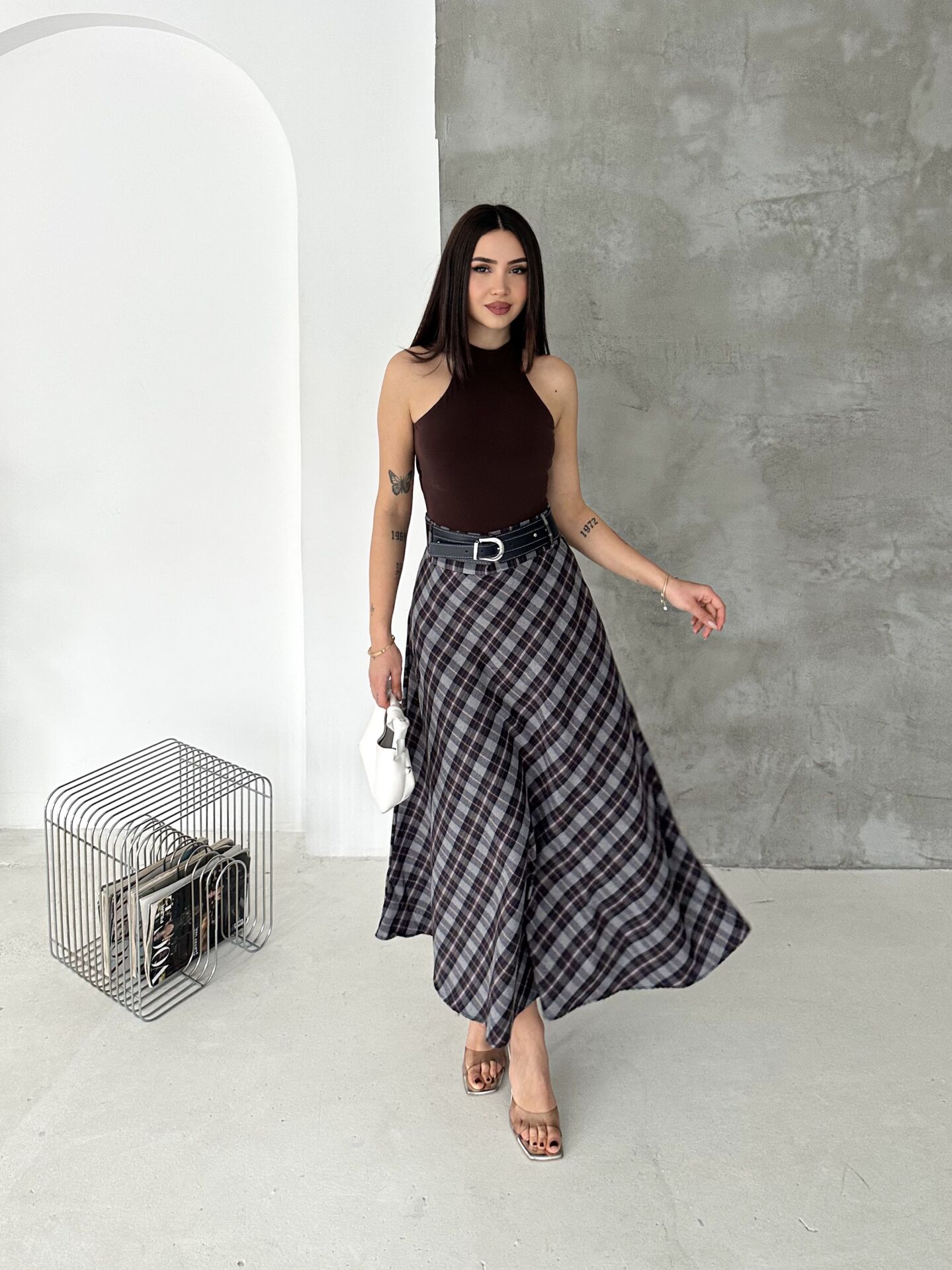 Kadın ekose kemerli uzun etek, tesettür giyim stilinde hem şıklığı hem de konforu bir arada sunmak isteyen kadınlar için özel olarak tasarlanmıştır. Kloş kalıbı sayesinde vücut hatlarını belli etmeden zarif bir duruş oluşturur. Günlük kullanımdan ofis kombinlerine kadar geniş bir kullanım alanı sunan bu model, zamansız ekose deseniyle klasik şıklığı modern çizgilerle buluşturur.