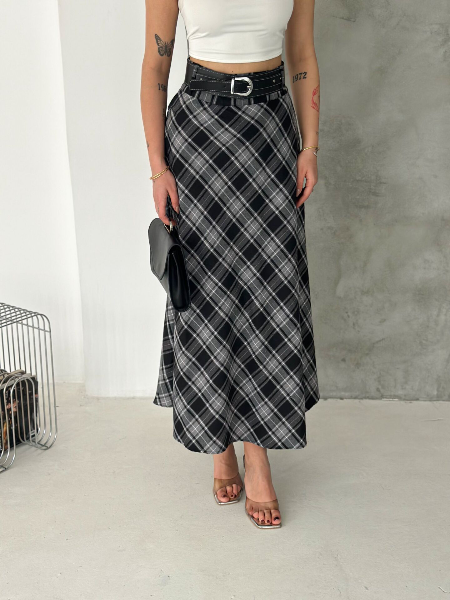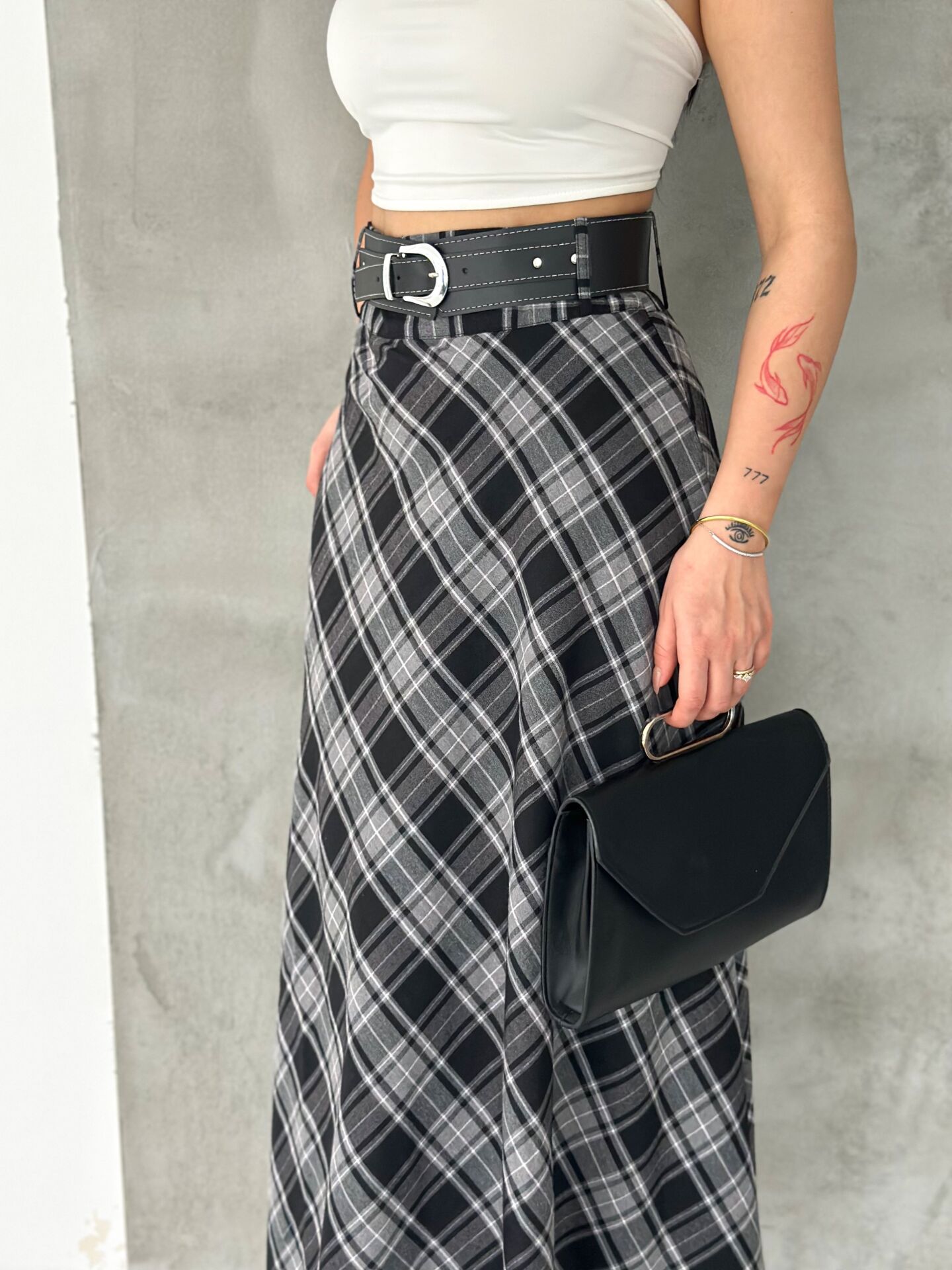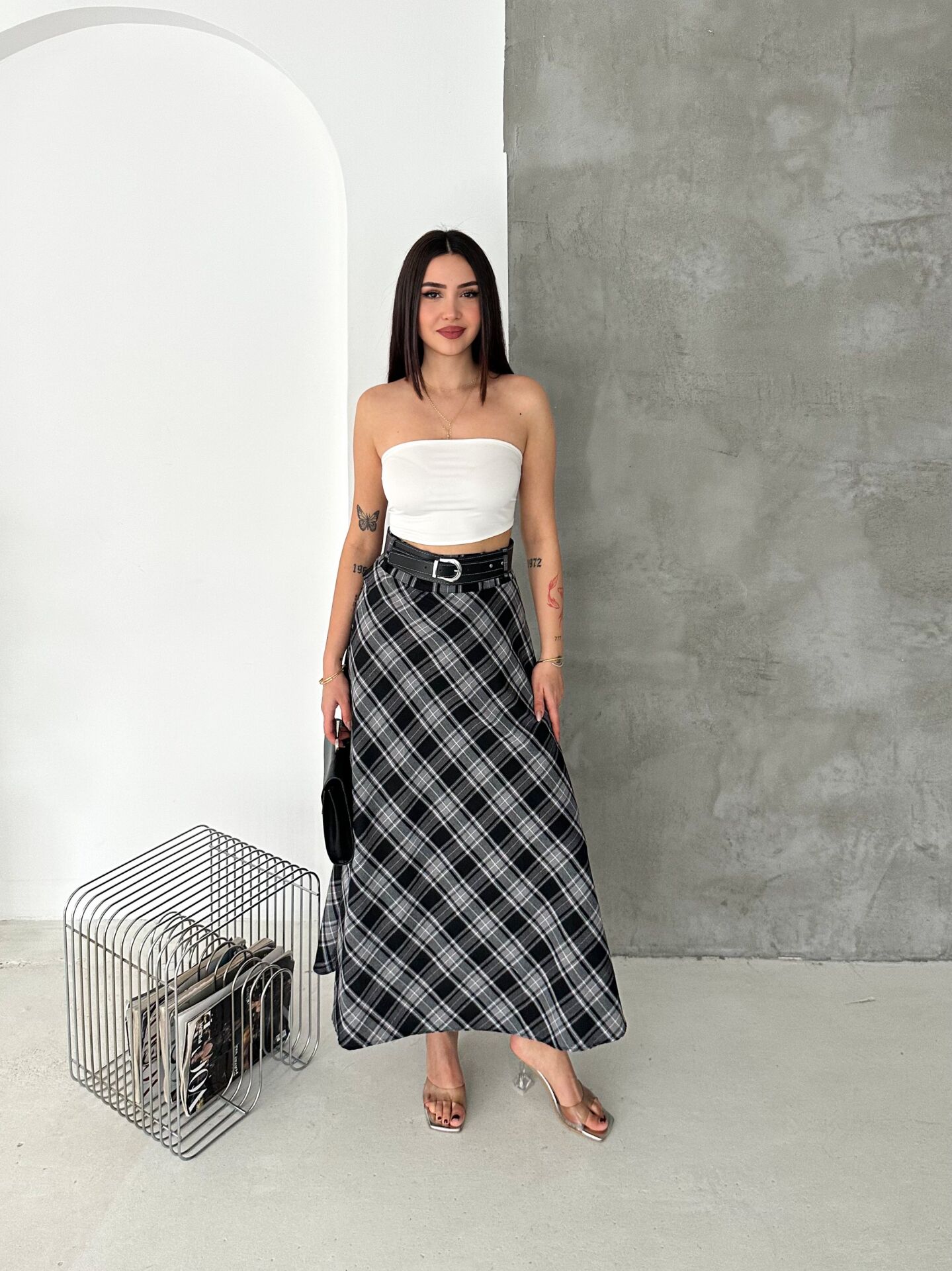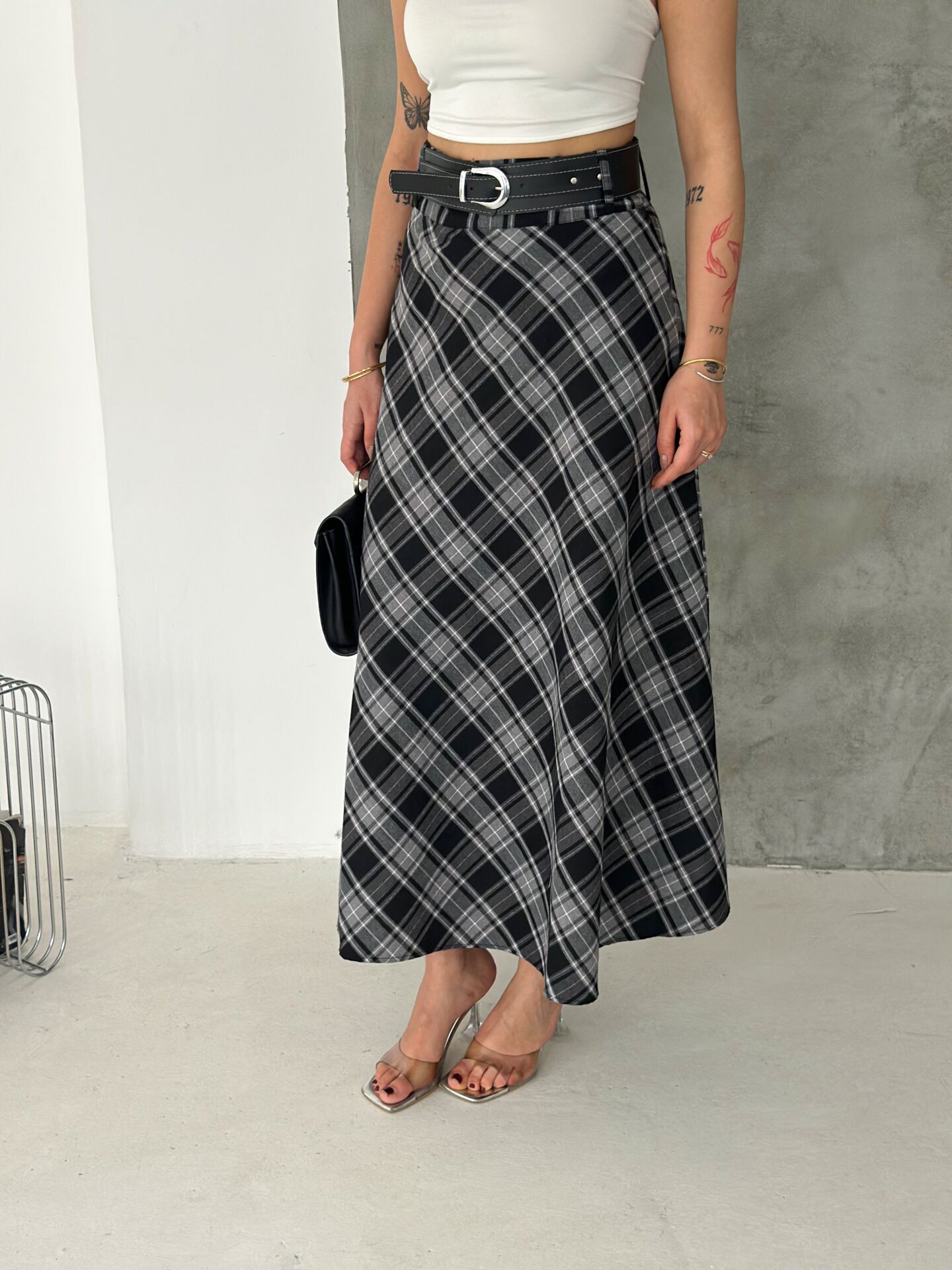Kadın ekose kemerli uzun etek, tesettür giyim stilinde hem şıklığı hem de konforu bir arada sunmak isteyen kadınlar için özel olarak tasarlanmıştır. Kloş kalıbı sayesinde vücut hatlarını belli etmeden zarif bir duruş oluşturur. Günlük kullanımdan ofis kombinlerine kadar geniş bir kullanım alanı sunan bu model, zamansız ekose deseniyle klasik şıklığı modern çizgilerle buluşturur.