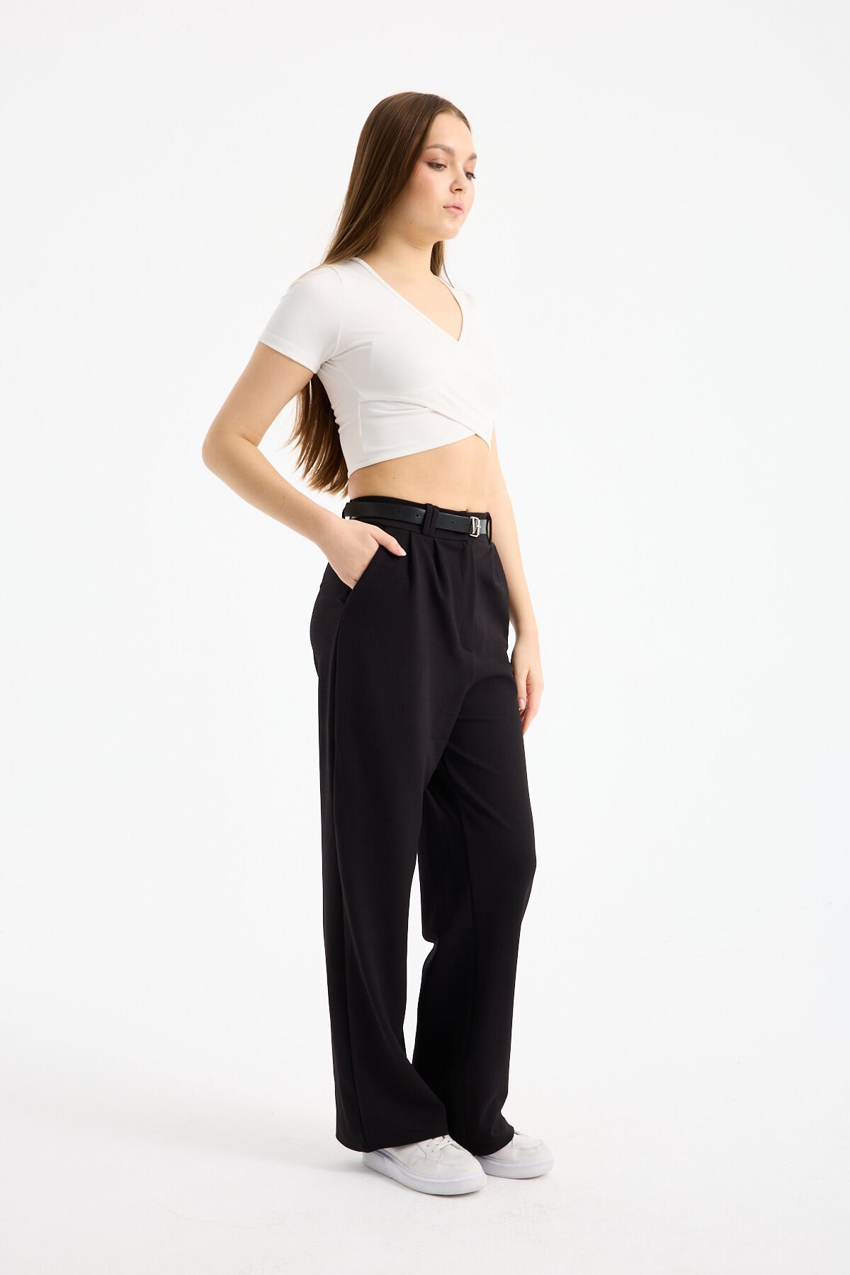 Kadın Esnek Ön Kemerli Ağaç Kabuğu Kumaş Pantolon 2461 L - SİYAH