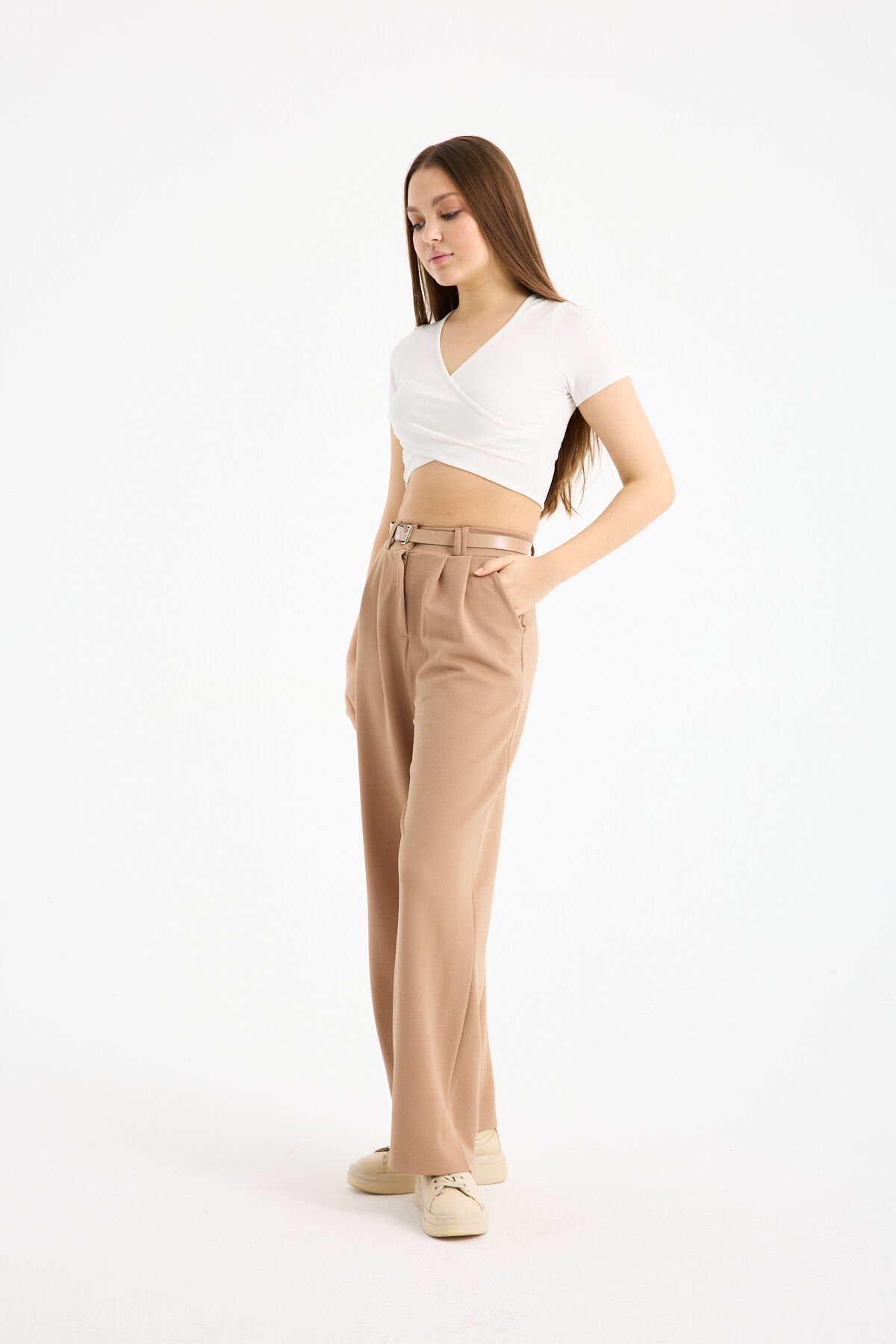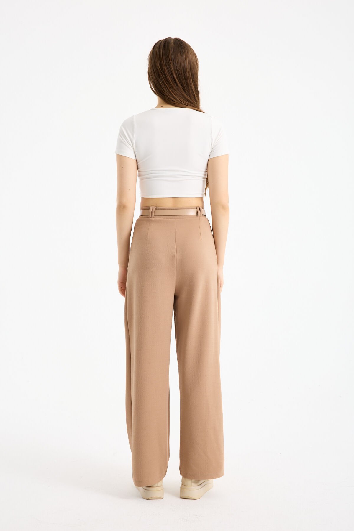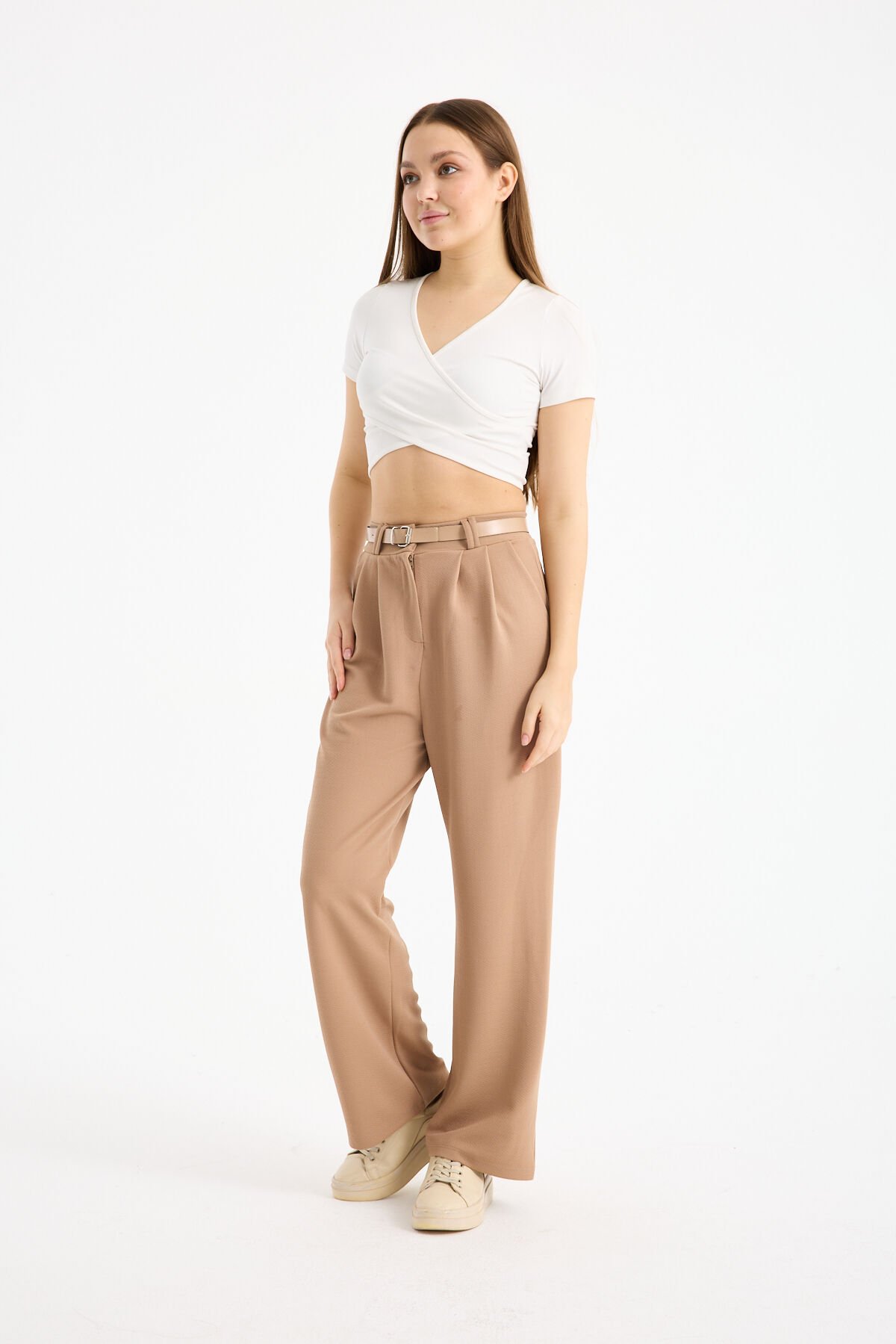Kadın Esnek Ön Kemerli Ağaç Kabuğu Kumaş Pantolon 2461 M - BEJ