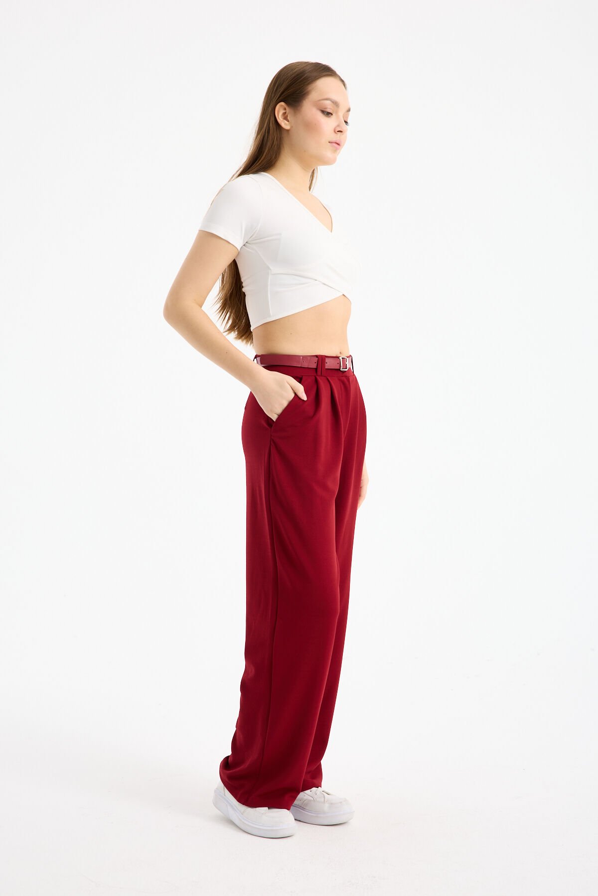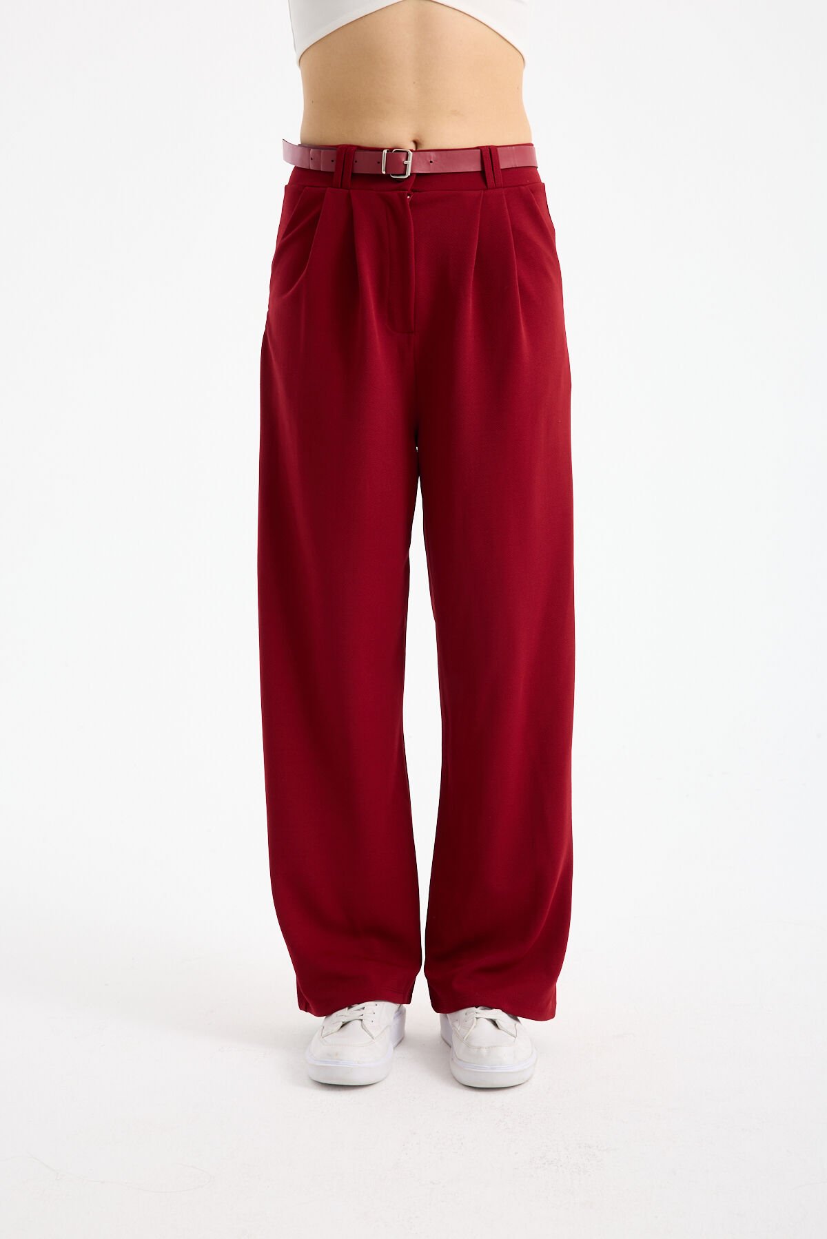 Kadın Esnek Ön Kemerli Ağaç Kabuğu Kumaş Pantolon 2461 S - BORDO