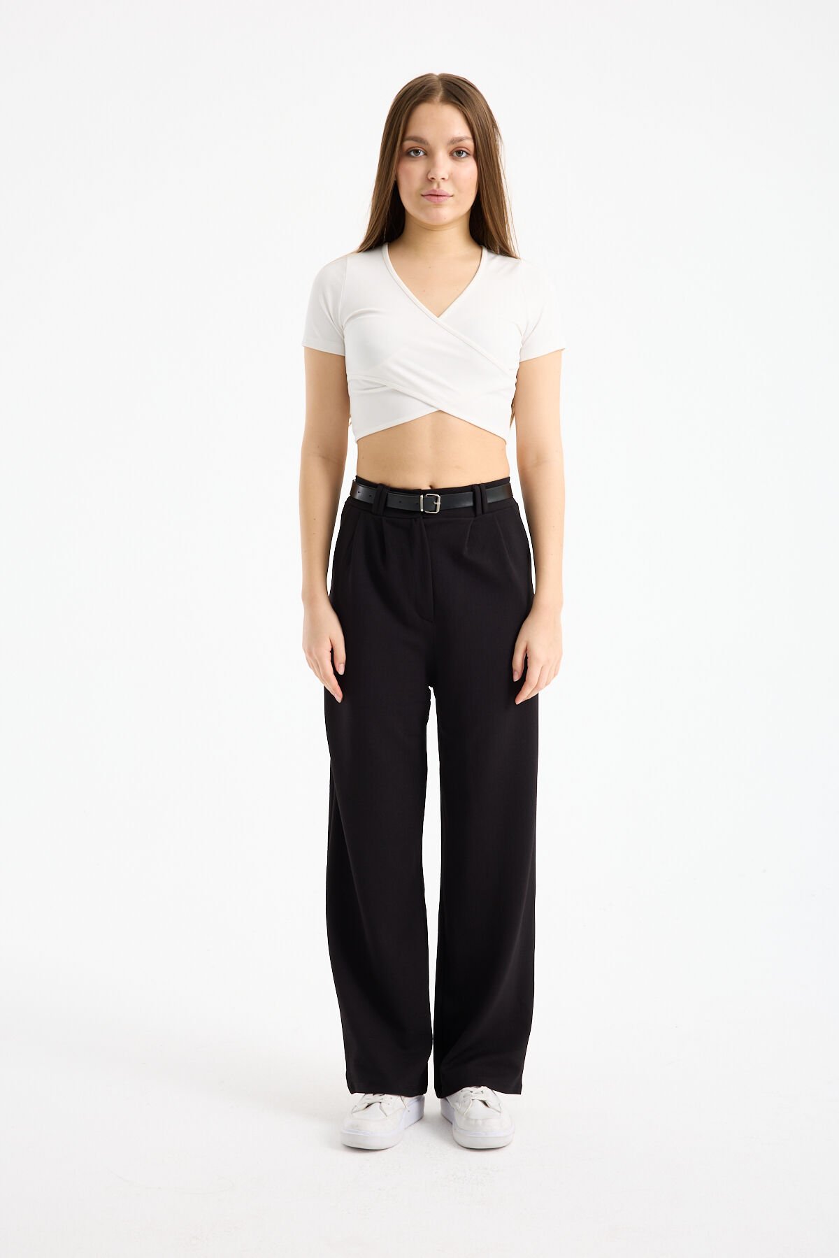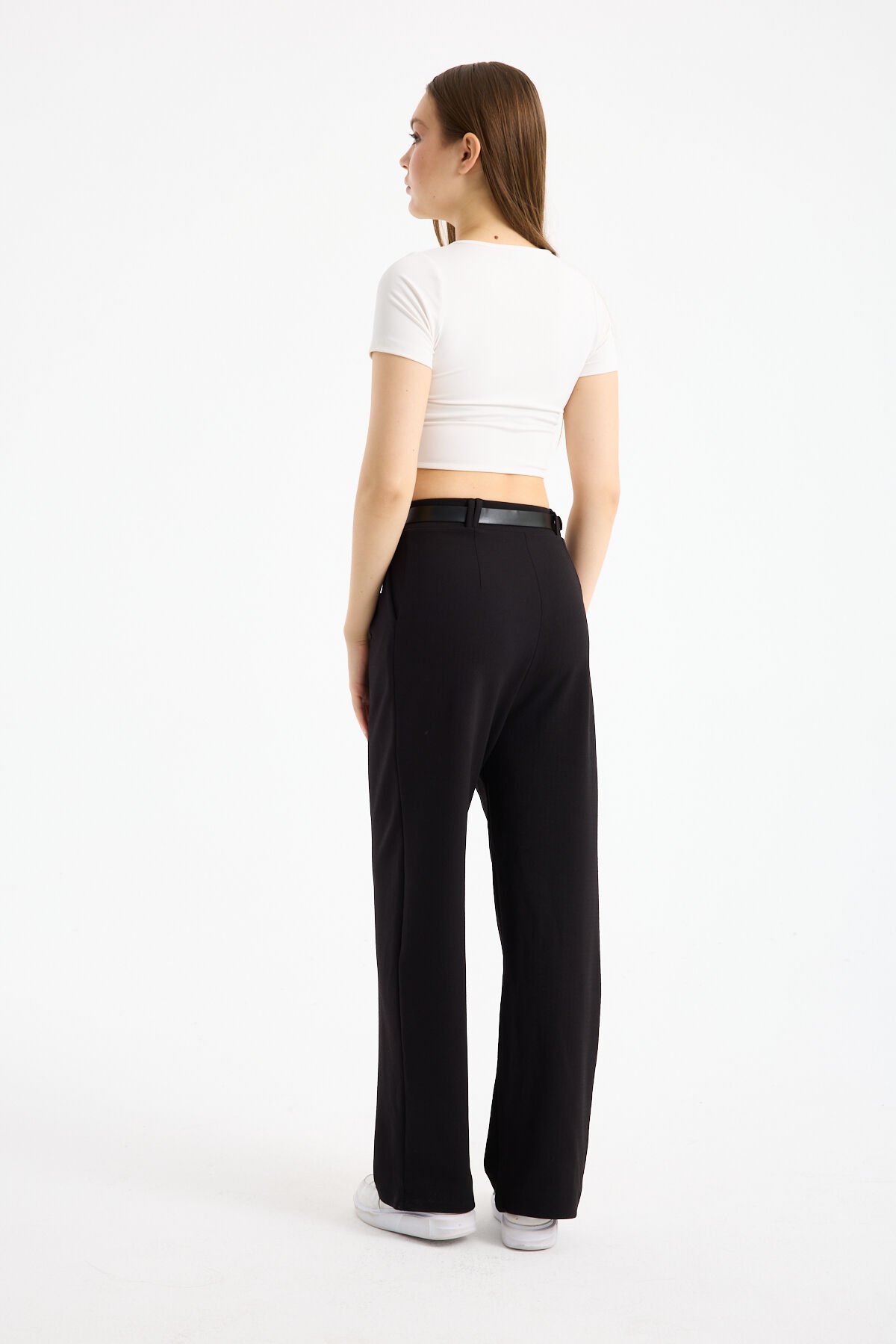Esnek Kumaş Pantolon modelleri arasında Yüksek Bel tasarımı ve şık Ön Kemerli detayıyla öne çıkan ürün, bel bölgesinde zarif bir vurgu oluşturur. Yarım Pat Fermuar kapama şekli ve astarsız iç yapısı, orta kalınlıktaki kumaşıyla birleşerek tüm sezonlar boyunca kullanım avantajı sağlar. Fonksiyonel iki adet cep detayı ve geniş paça kesimi, Fashion Forward personasına uygun modern bir estetik yaratır.