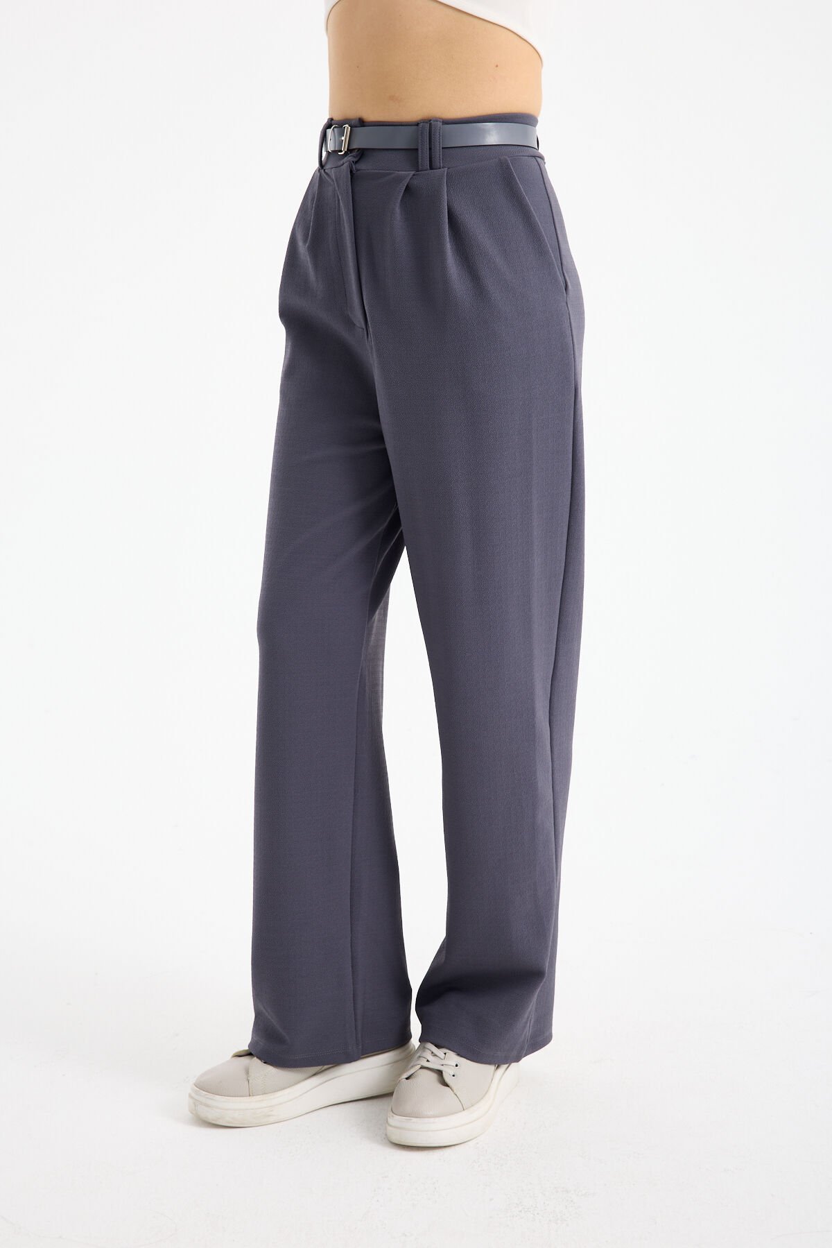 Esnek Kumaş Pantolon modelleri arasında Yüksek Bel tasarımı ve şık Ön Kemerli detayıyla öne çıkan ürün, bel bölgesinde zarif bir vurgu oluşturur. Yarım Pat Fermuar kapama şekli ve astarsız iç yapısı, orta kalınlıktaki kumaşıyla birleşerek tüm sezonlar boyunca kullanım avantajı sağlar. Fonksiyonel iki adet cep detayı ve geniş paça kesimi, Fashion Forward personasına uygun modern bir estetik yaratır.