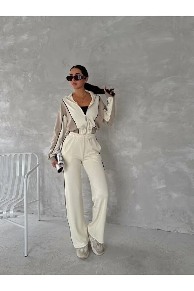 Modal kumaştan özel olarak üretilmiş olan bu takım, hem sweatshirt hem pantolonun ayrı ayrı da kullanılabilmesi sayesinde yüksek işlevsellik sunar. Biyeli detayları ve çizgili modern görünümü ile zamansız bir stil oluşturur.