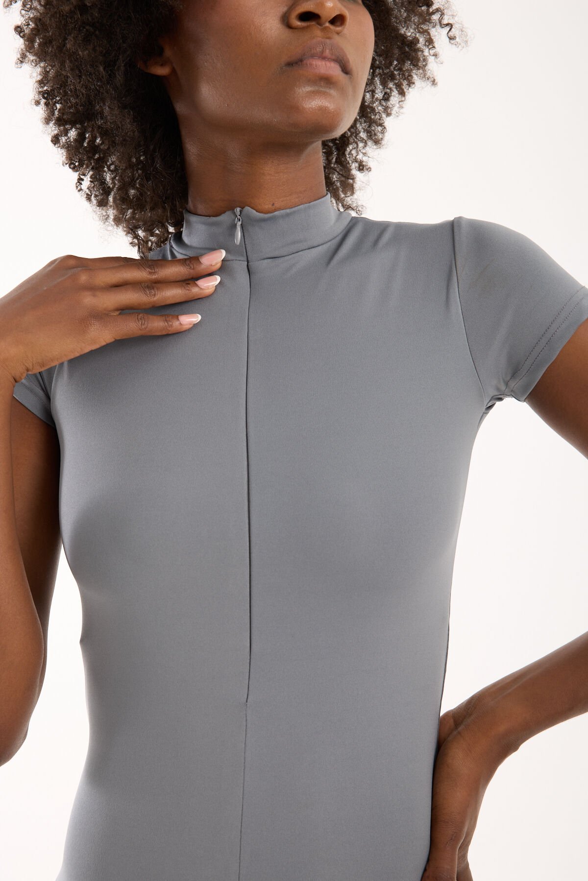 Polyester ve likra karışımlı materyal bileşeni sayesinde dayanıklılık ve esneklik bir arada sunulur. Fermuarlı kapama şekli ve kemersiz yapısı, giyim sırasında kullanım kolaylığı yaratır. Günlük ortamlar için uygun olan bu tulum, kısa boyu ve cepsiz tasarımıyla fonksiyonelliği estetik bir çizgide buluşturur.