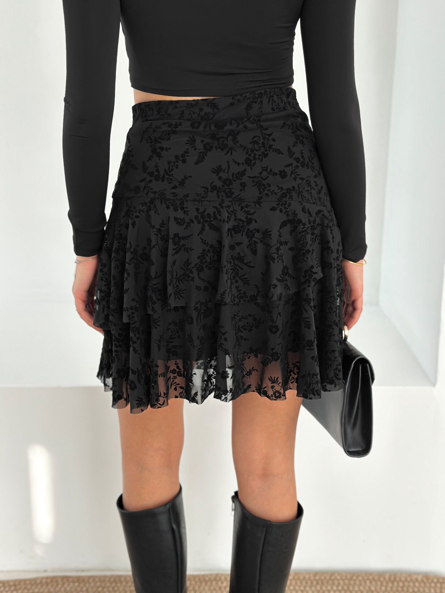 Kadın Flok Baskılı İçi Astarlı Tül Mini Etek S - SİYAH