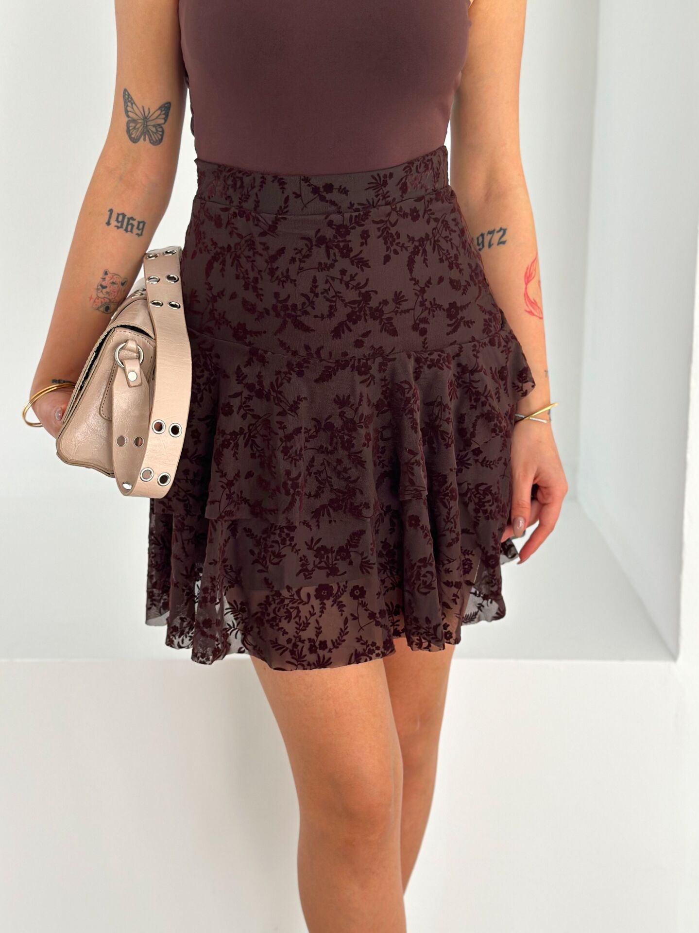 Kadın Flok Baskılı İçi Astarlı Tül Mini Etek XL - KAHVERENGİ
