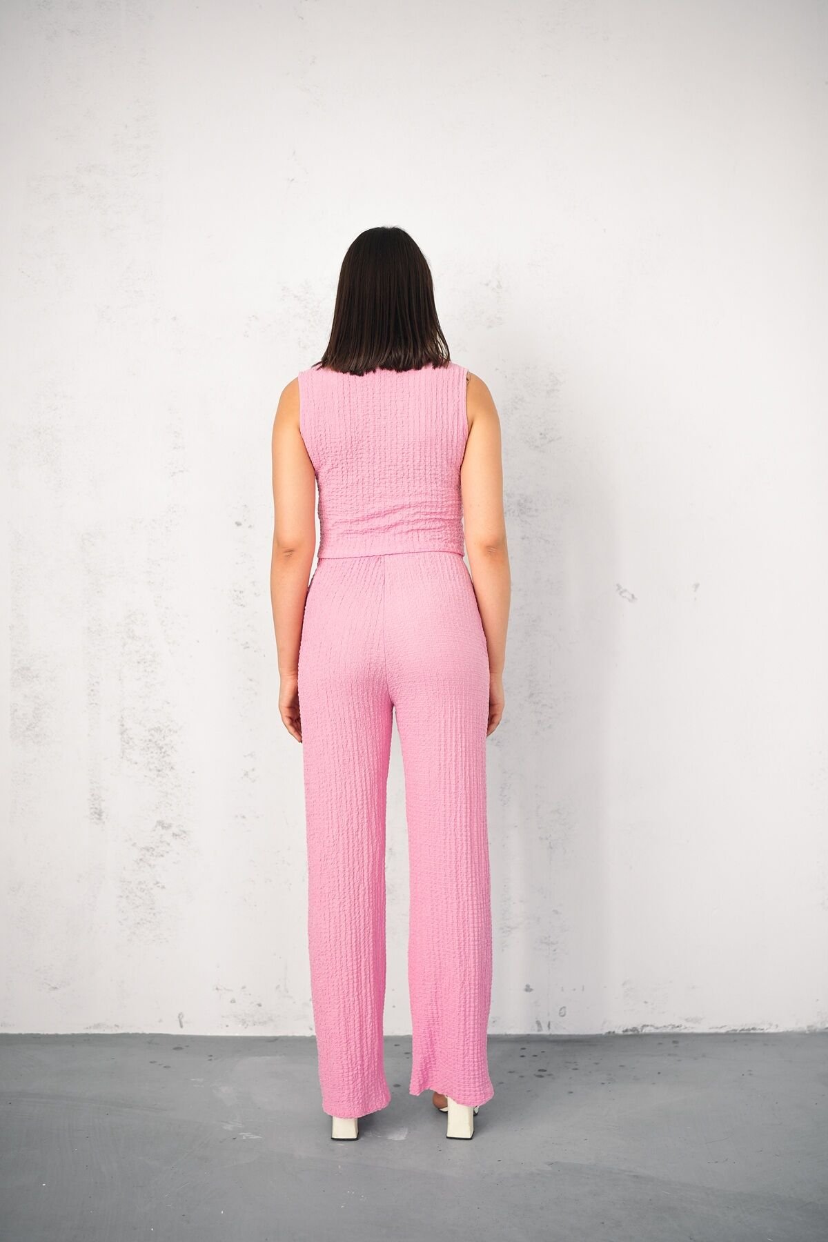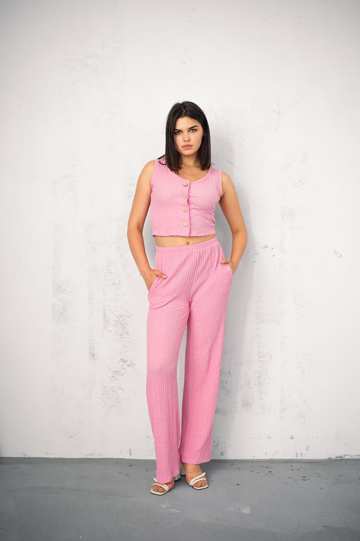 Kadın Yazlık Gofre Yelek ve Pantolon Takım L - PEMBE
