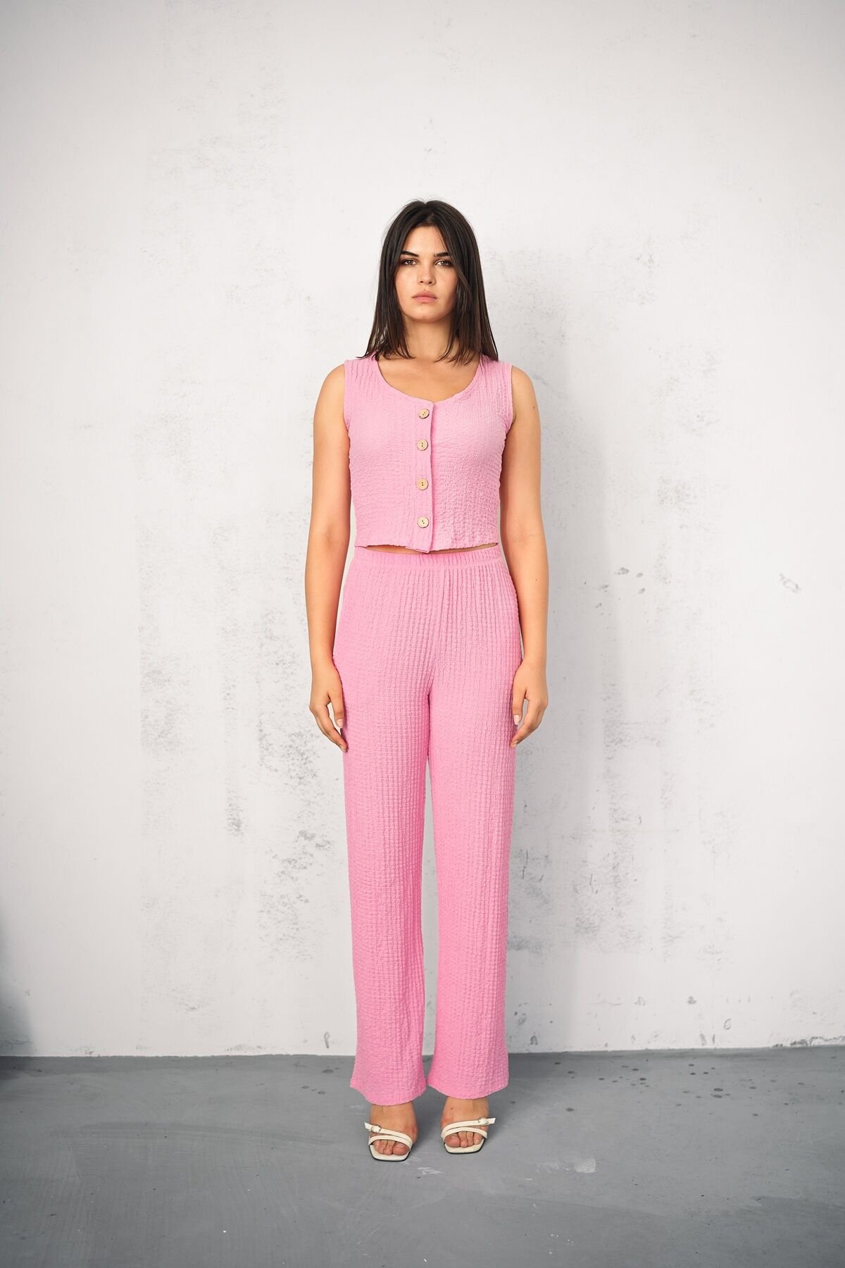 Kadın Yazlık Gofre Yelek ve Pantolon Takım XL - PEMBE