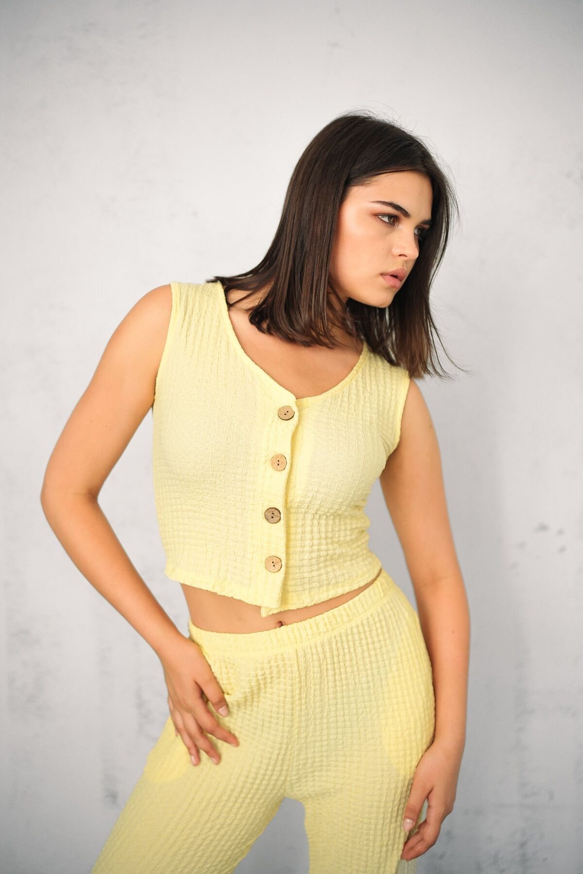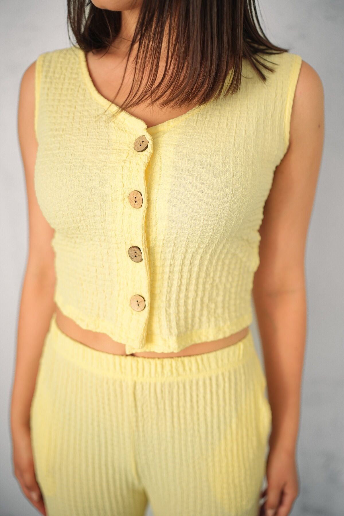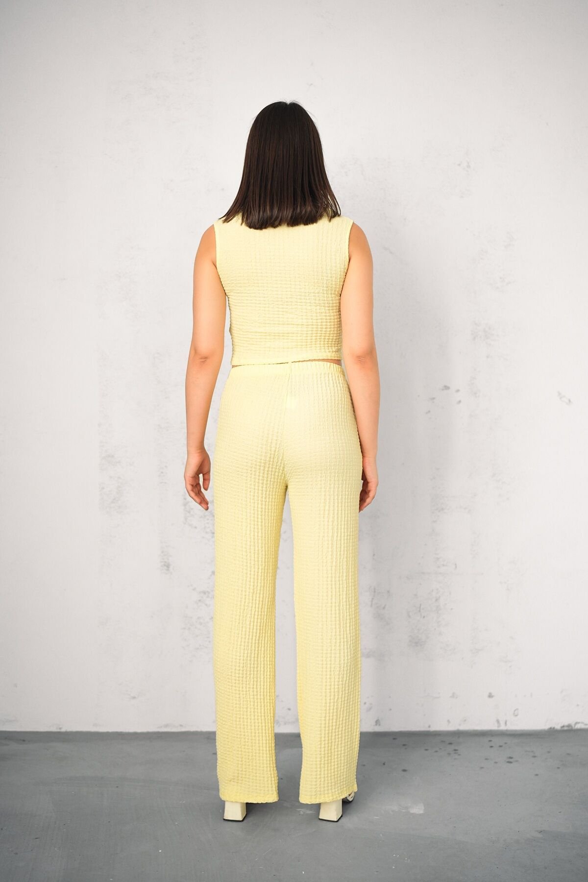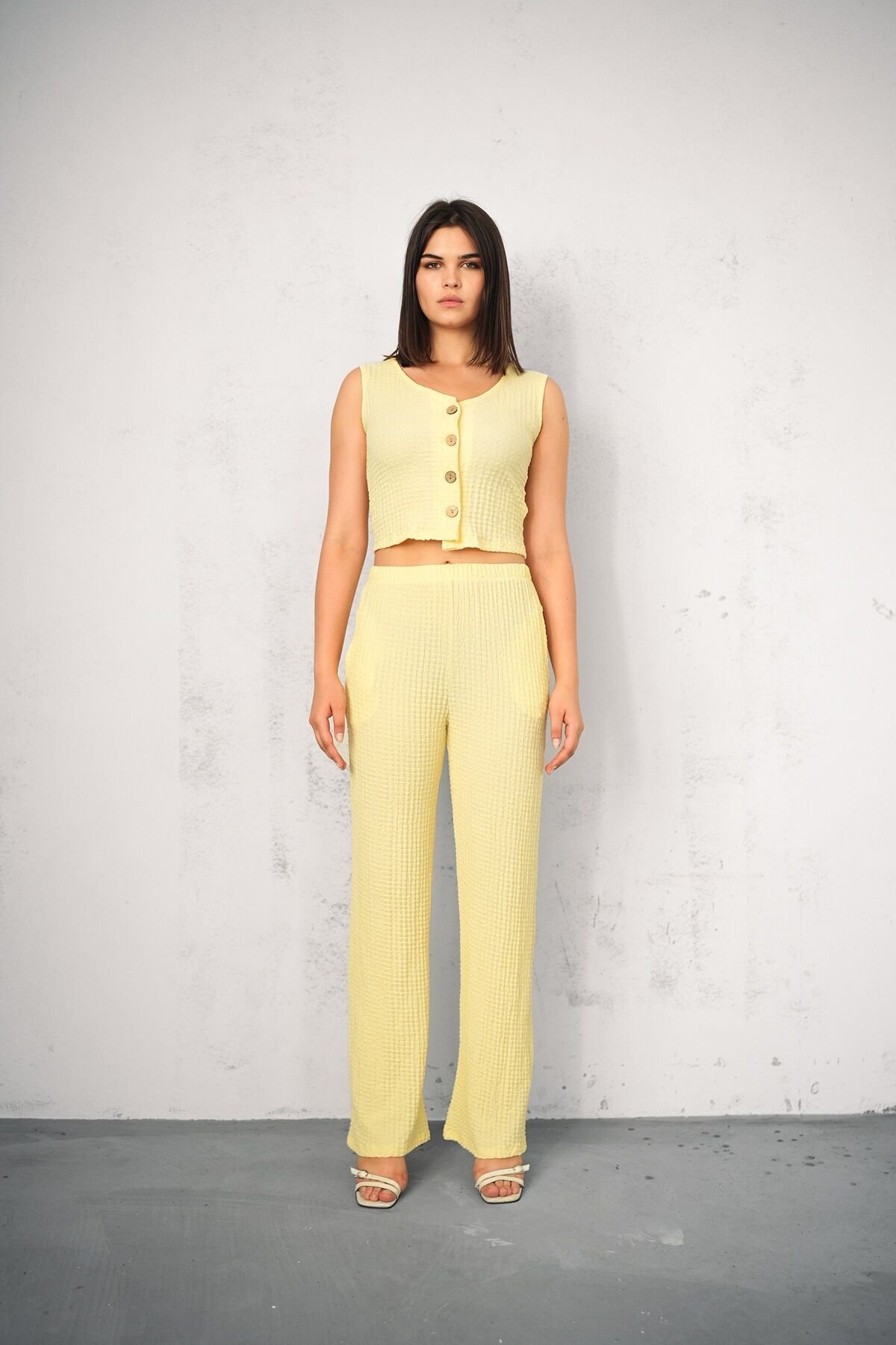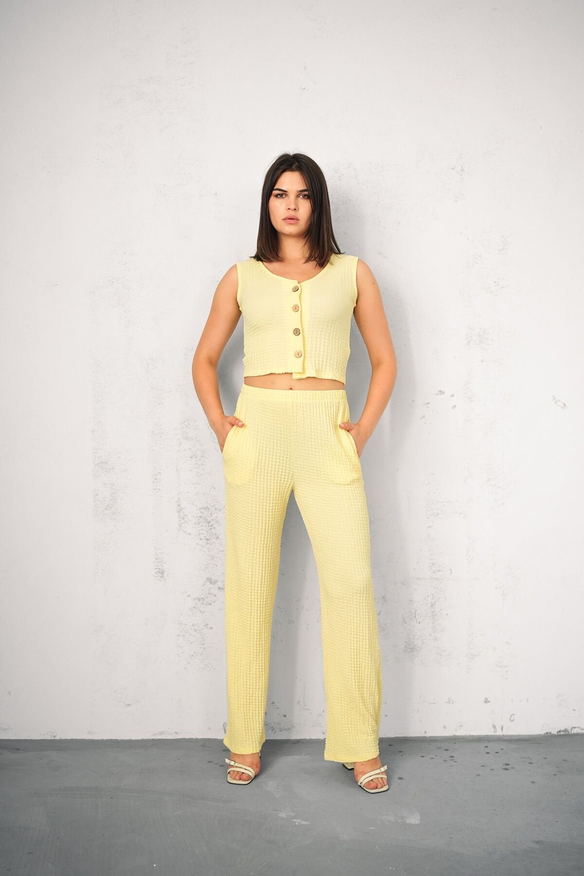 Kadın Yazlık Gofre Yelek ve Pantolon Takım XL - SARI