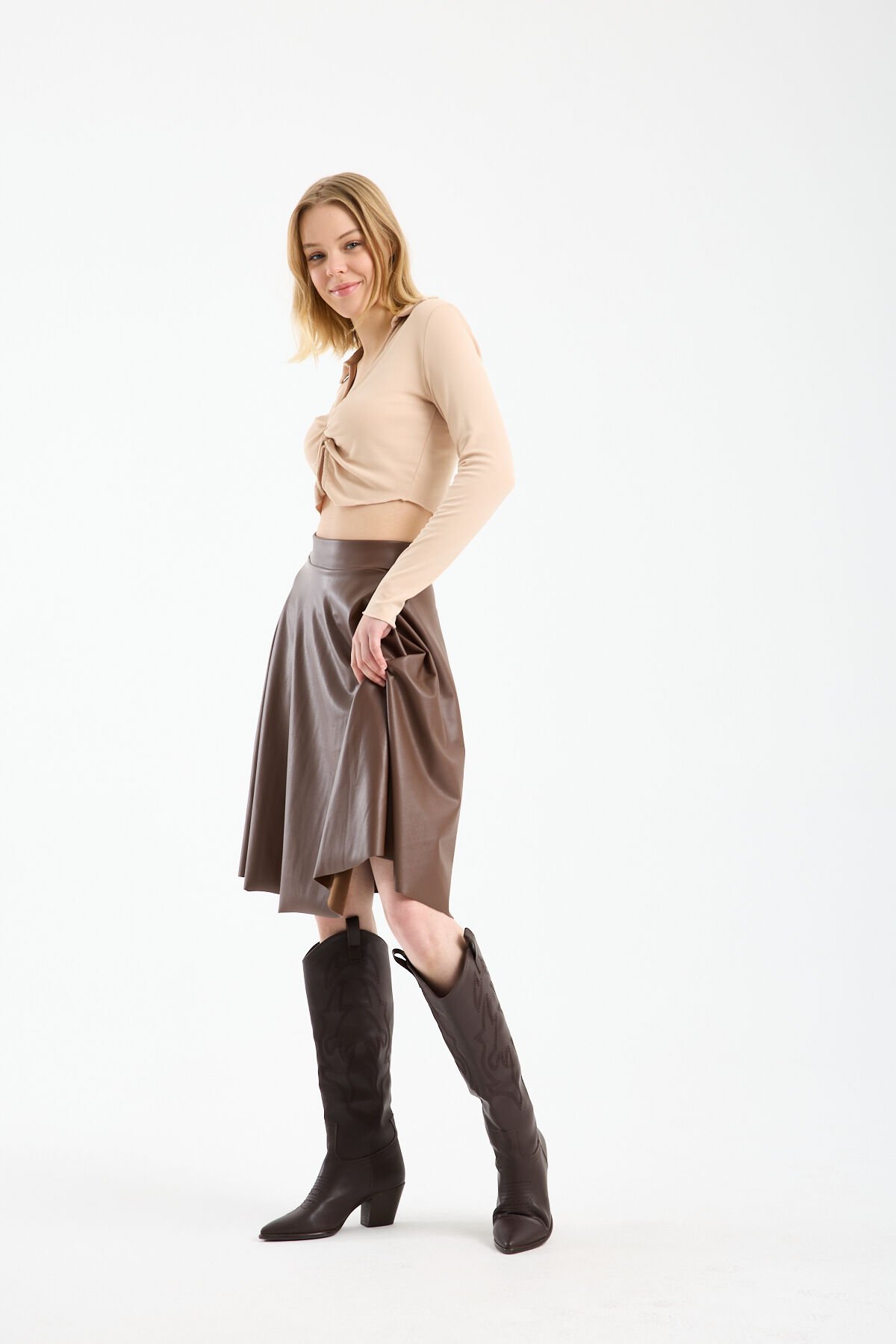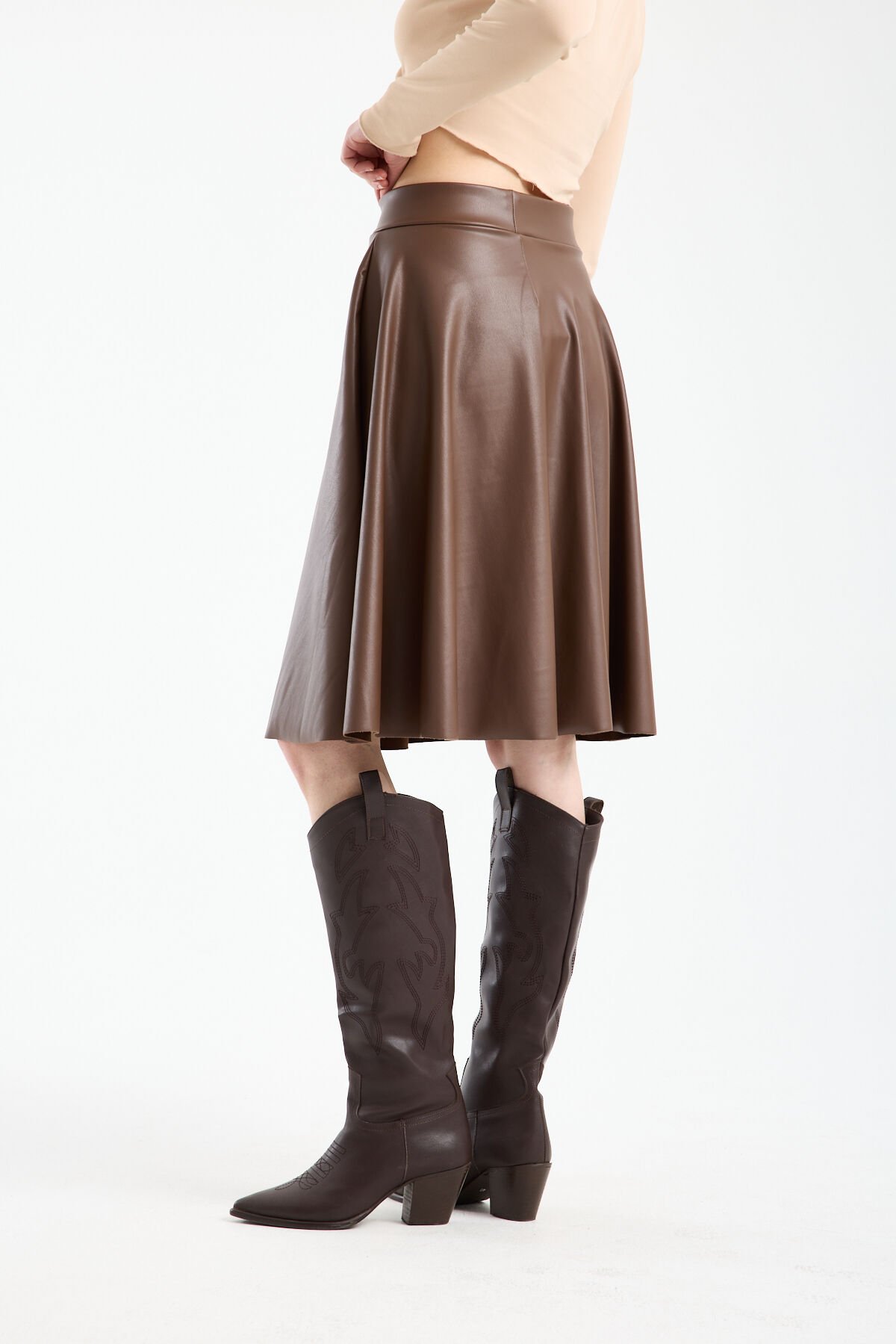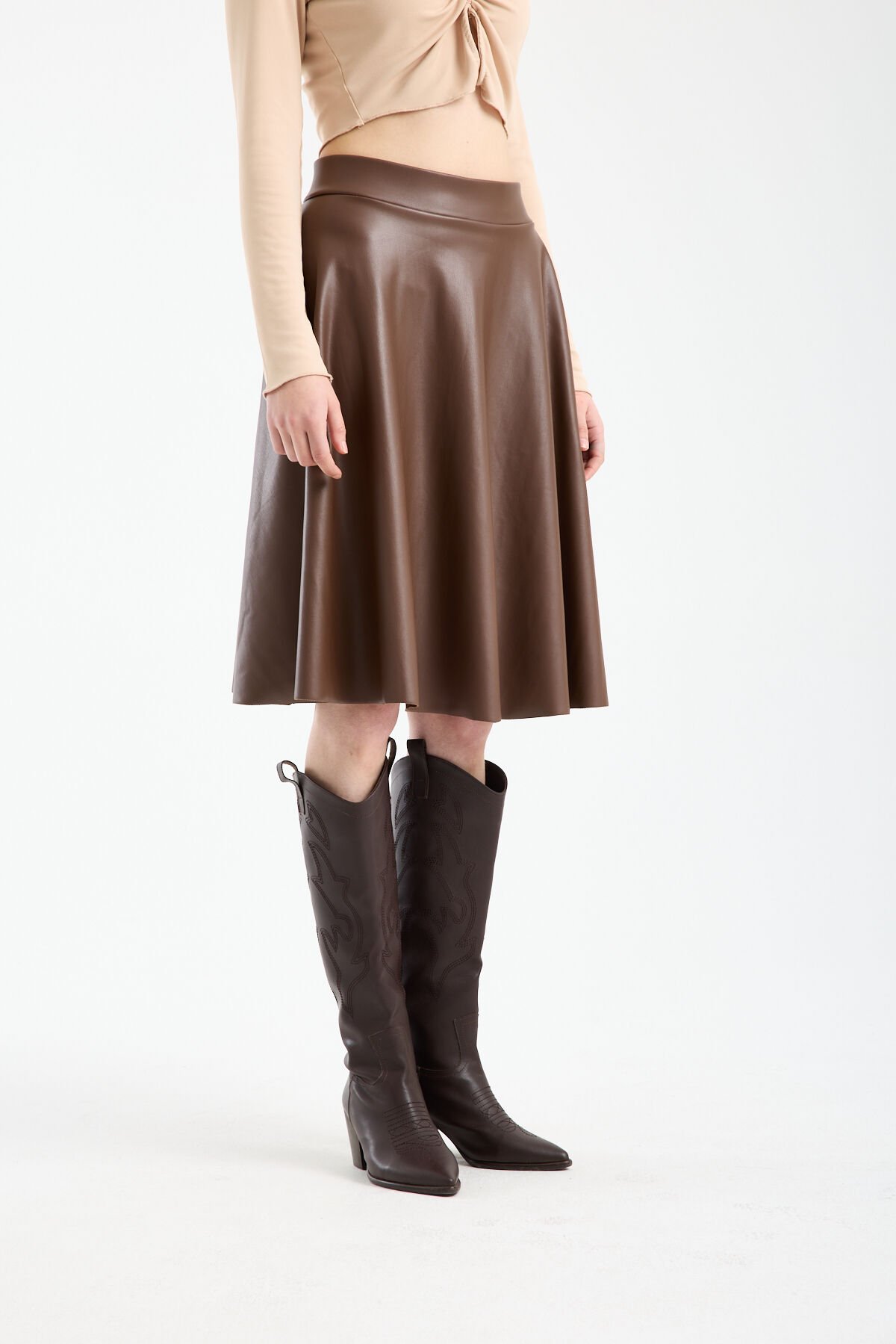 Kadın İçi Kadife Beli Lastikli Suni Deri Diz Boyu Çan Etek 1998 L - KAHVERENGİ