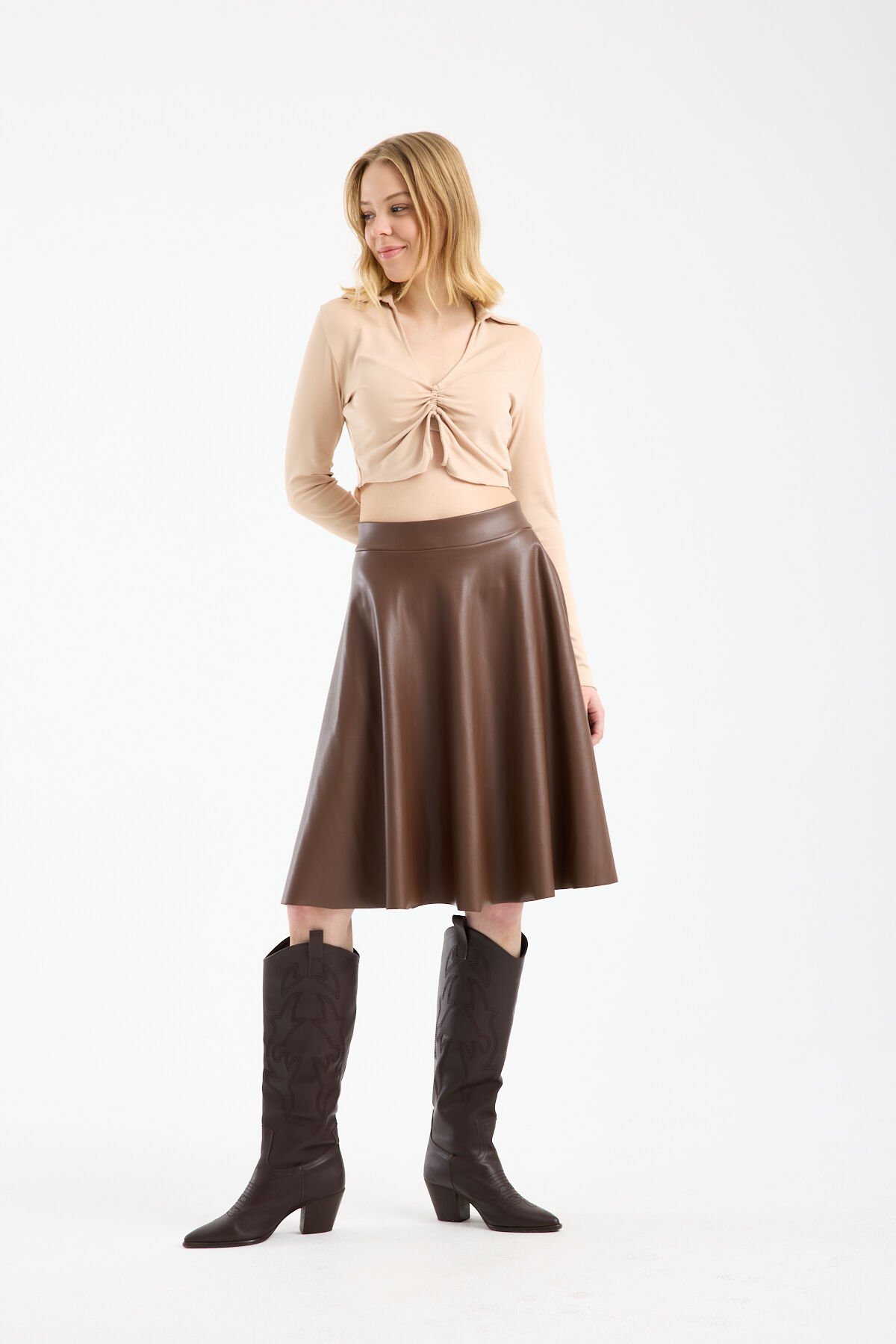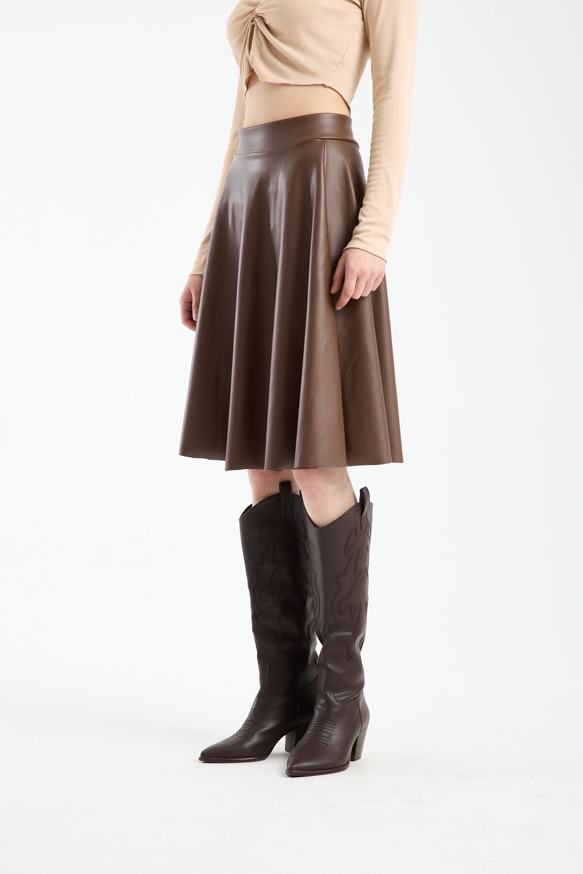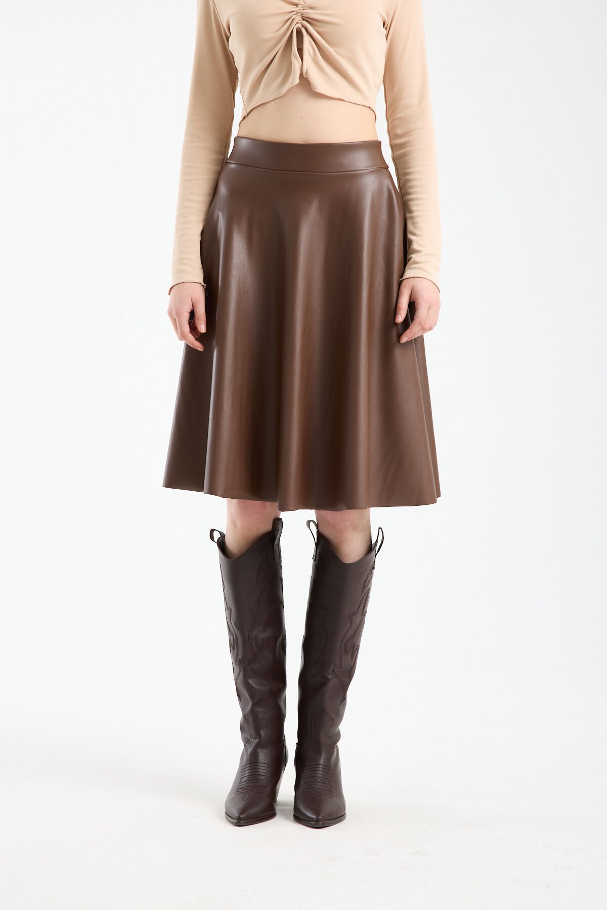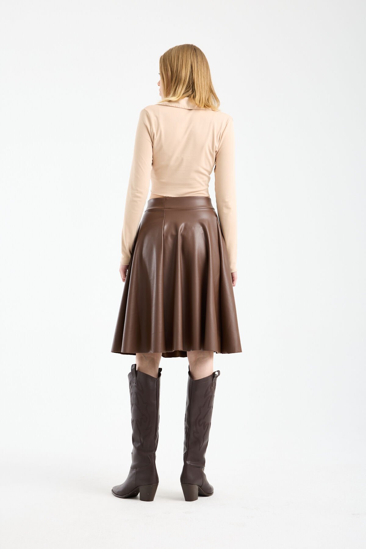 Kadın İçi Kadife Beli Lastikli Suni Deri Diz Boyu Çan Etek 1998 S - KAHVERENGİ