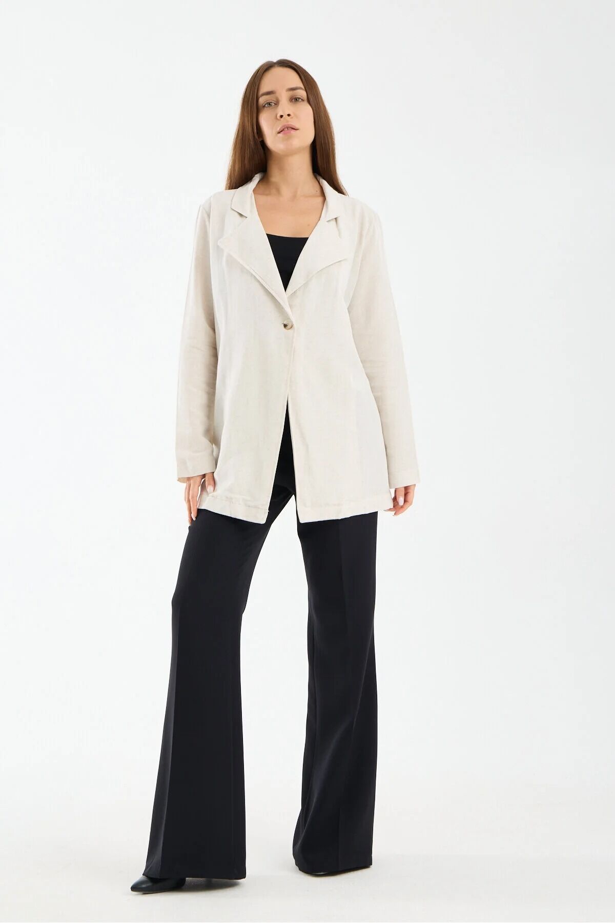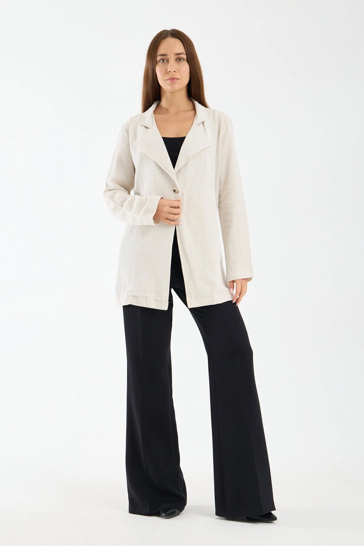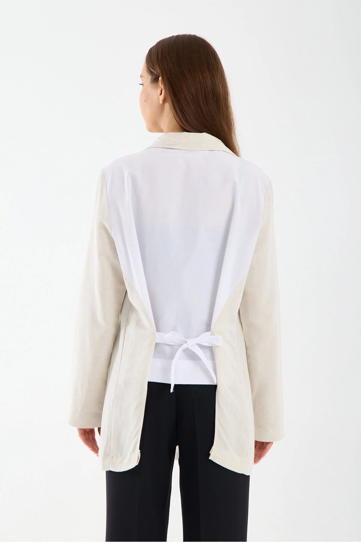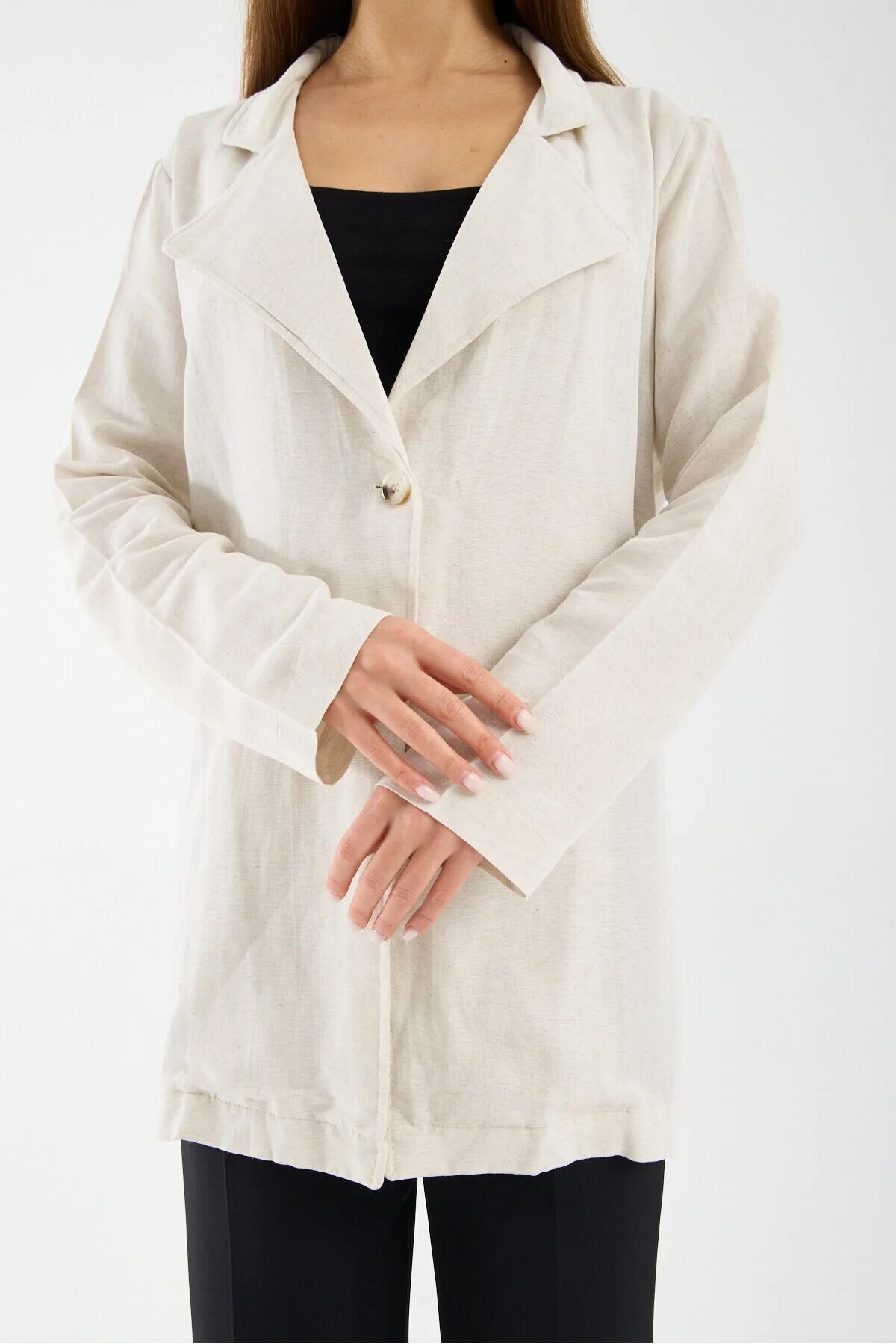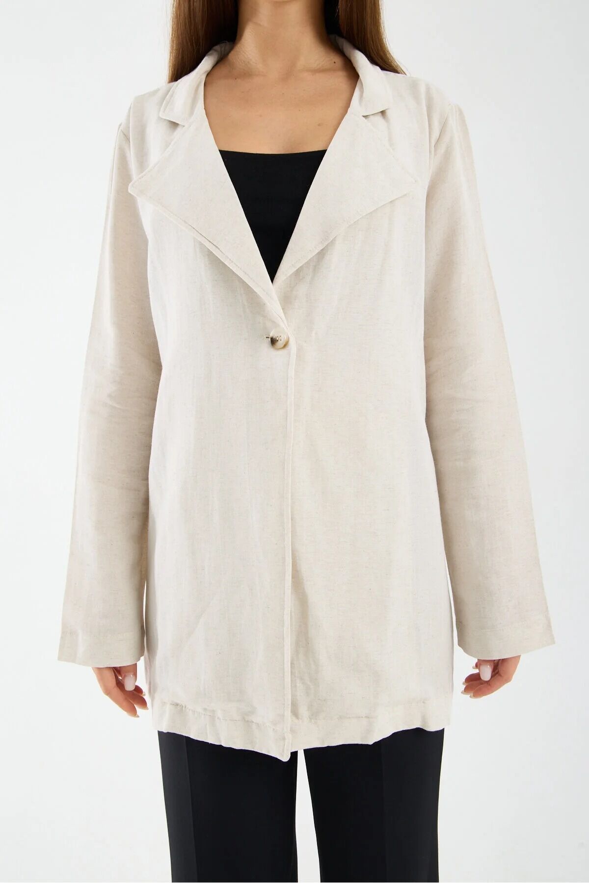 Kadın Keten Garnili Ceket Arka Dokuma Detaylı Tek Düğmeli Modern Şehir Ceketi, modern şehir stilini yansıtan zarif ve rahat tasarımıyla günlük kombinlerin şık tamamlayıcı parçalarından biridir.