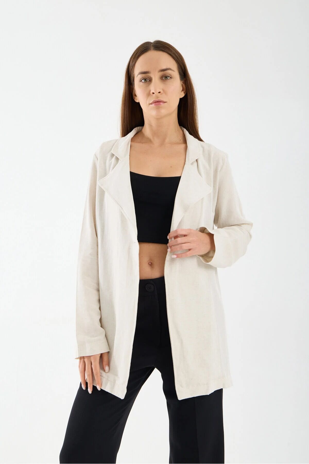 Uzun silueti ve krem rengi sayesinde farklı kombinlerle kolayca uyum sağlayan kadın keten garnili ceket, jean, kumaş pantolon veya elbiselerle rahatlıkla kullanılabilir. Günlük şehir stilinde hem rahat hem de şık bir görünüm elde etmek isteyenler için ideal bir seçimdir.