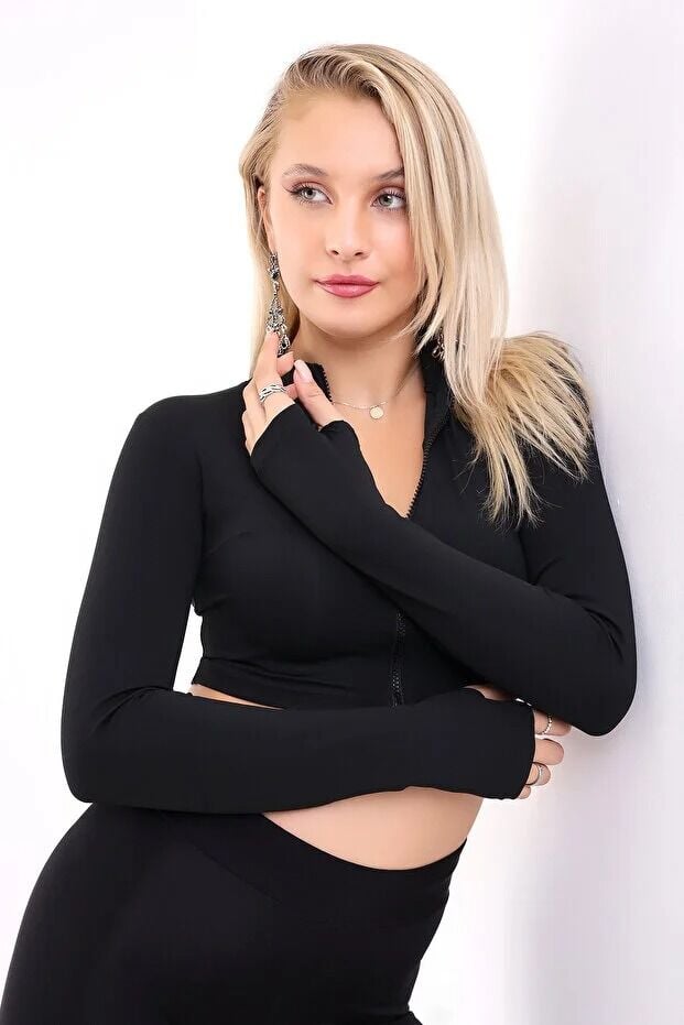 Kadın Kısa Fermuarlı Parmak Geçmeli Uzun Kol Ceket, aktif yaşam tarzına uyum sağlayan modern tasarımıyla konfor ve şıklığı bir arada sunar. Slim fit kalıbı ve bel üstü crop kesimi sayesinde vücudu estetik biçimde sarar.