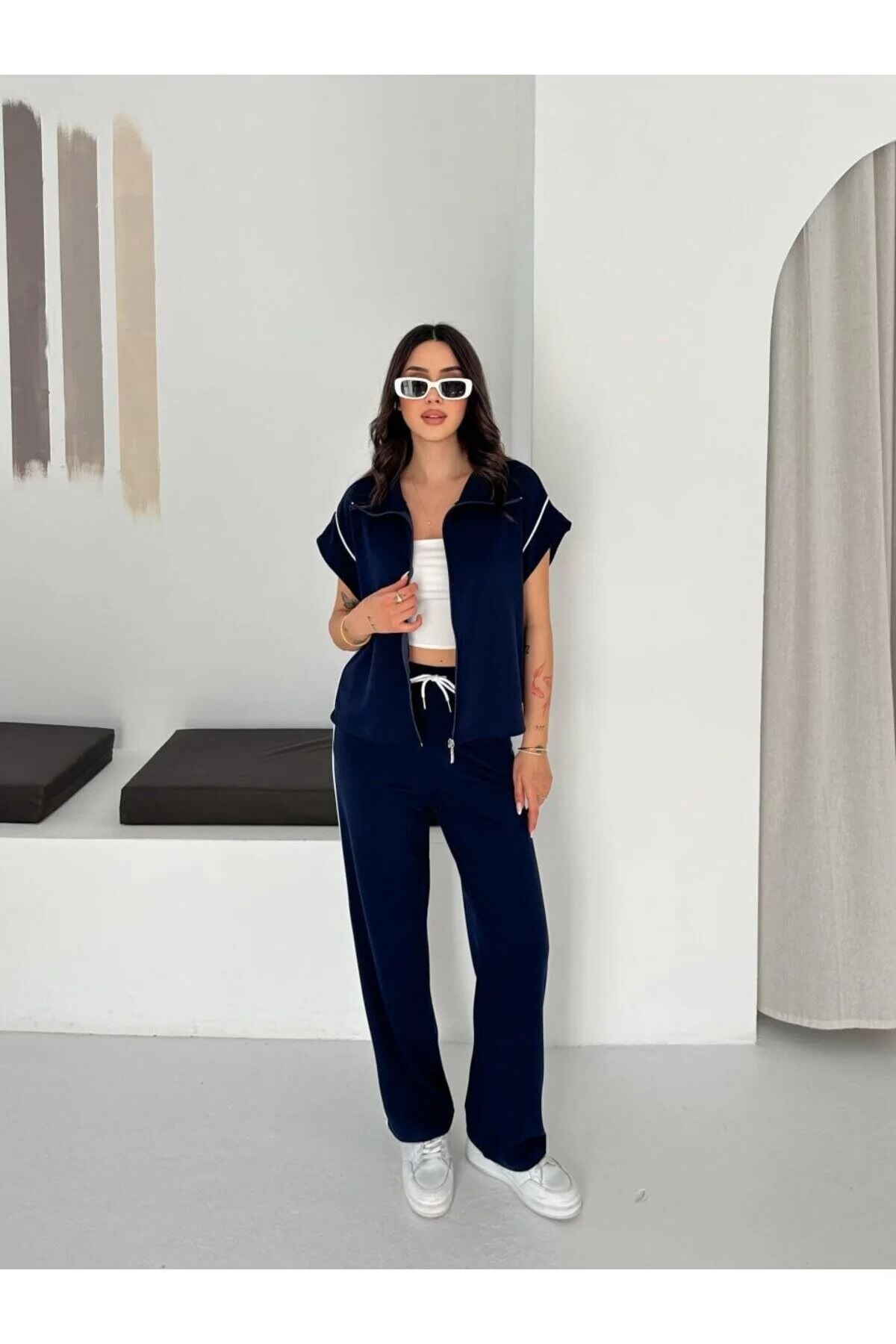 Üst parçada yer alan biyeli detaylar ve fermuar kapama sistemi ürüne sportif ve modern bir hava katarken, kolsuz yelek formu sayesinde katmanlı kombinler için ideal bir seçenek sunar. Geniş paça pantolon tasarımı ise hareket özgürlüğü sağlar ve trend görünümü destekler.