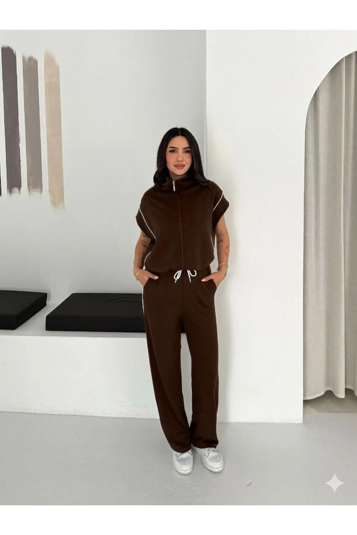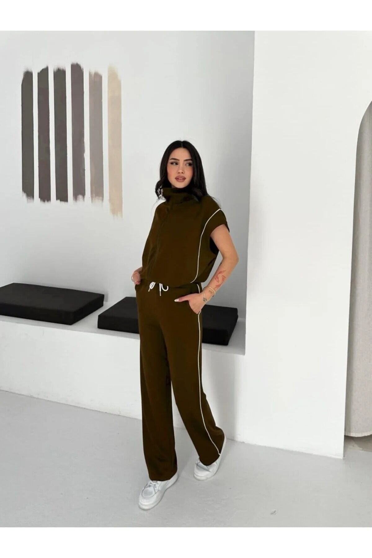 Kadın Modal Kumaş Biyeli Fermuarlı Yelek Takım Bol Paça Modern İkili Takım Günlük Şık Rahat Kombin XL - KAHVE