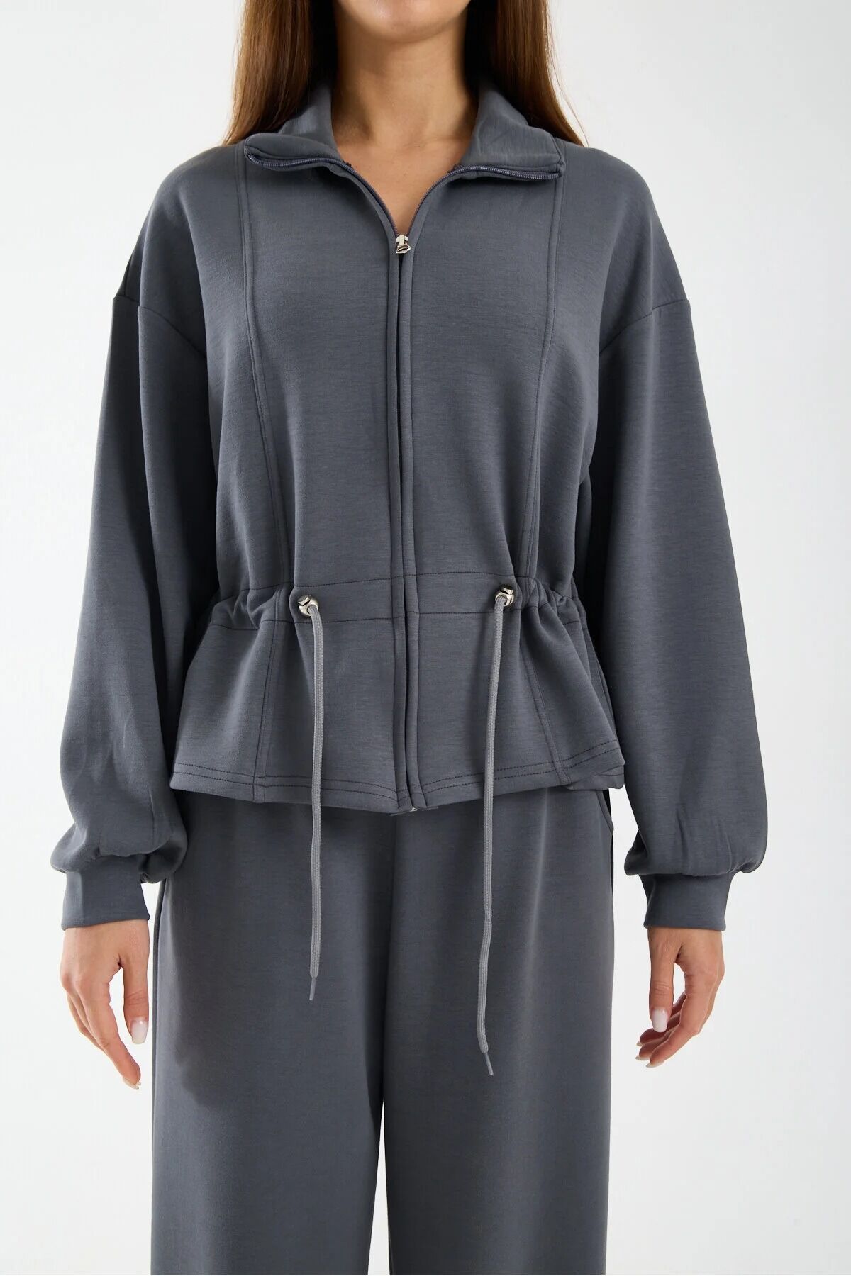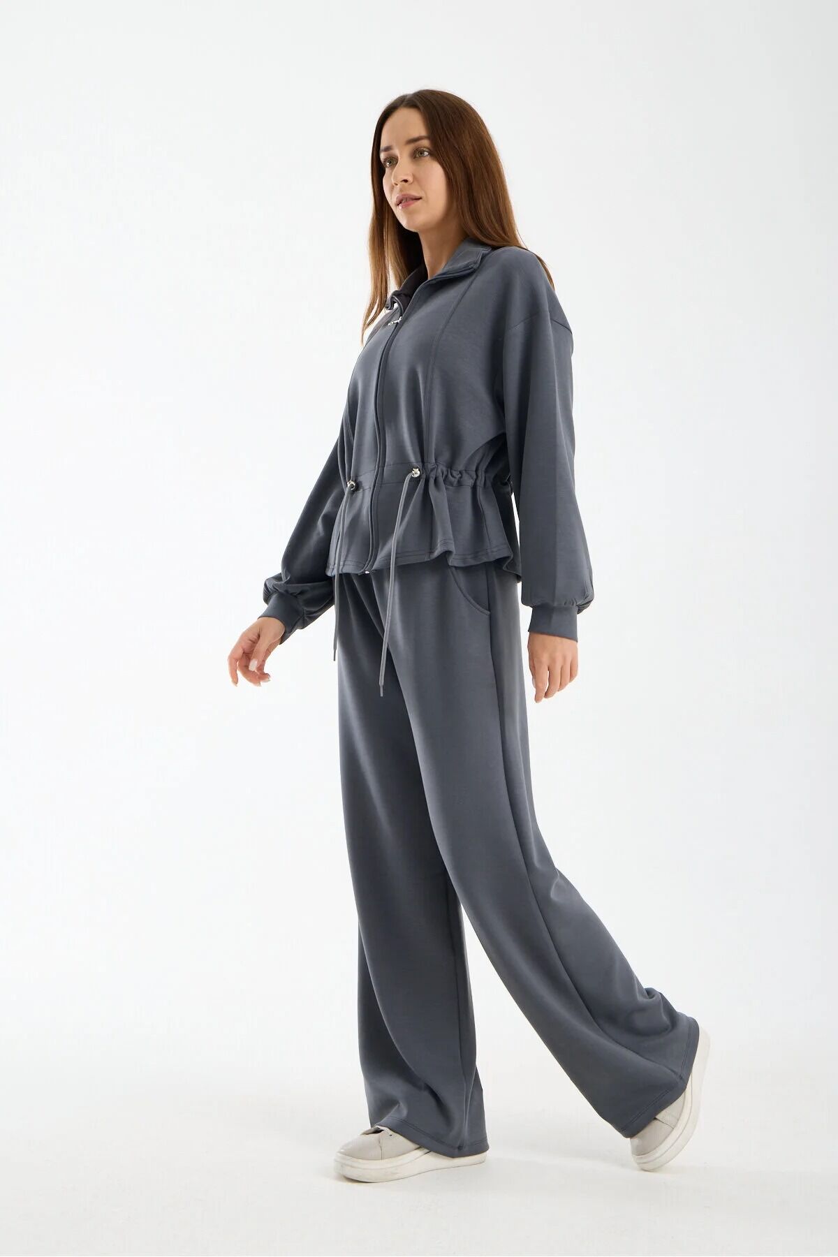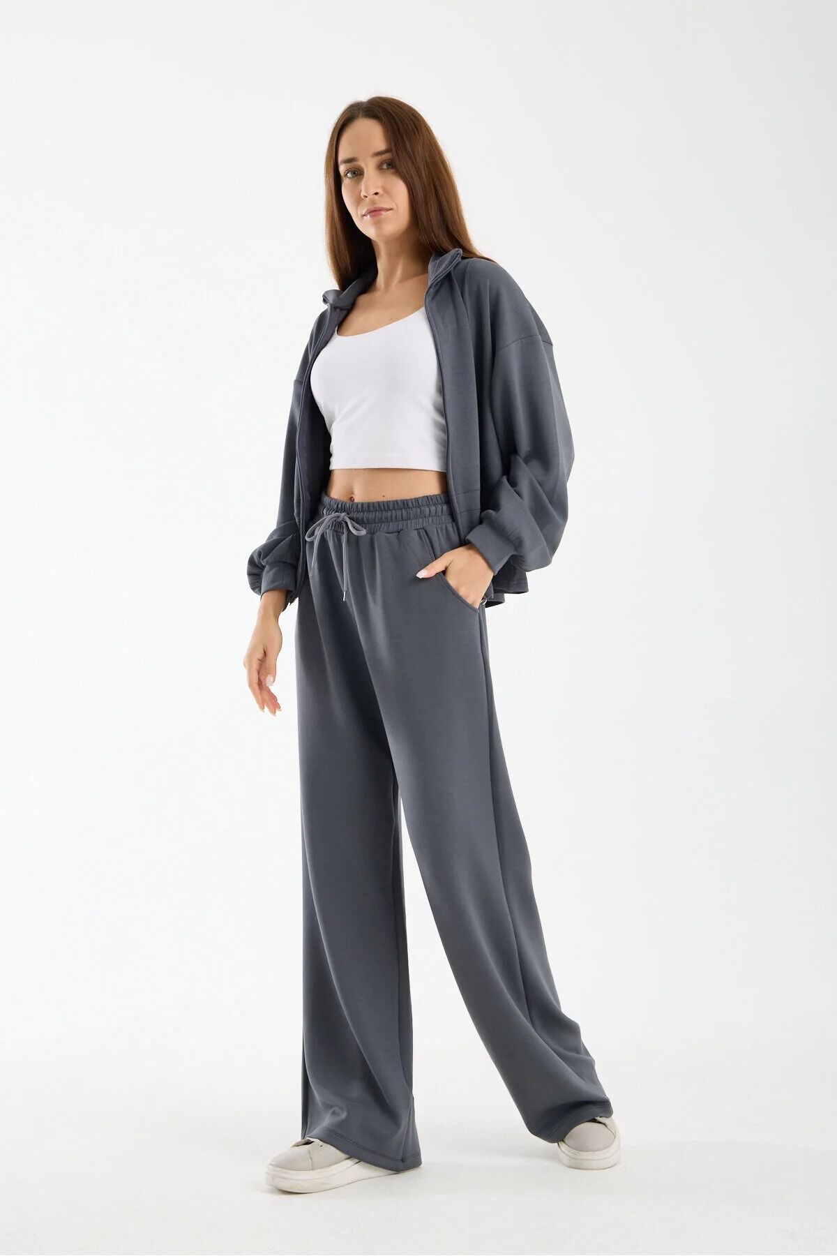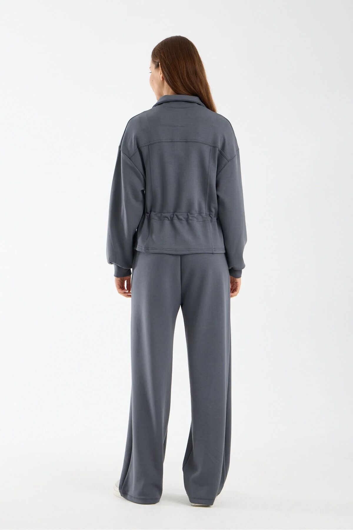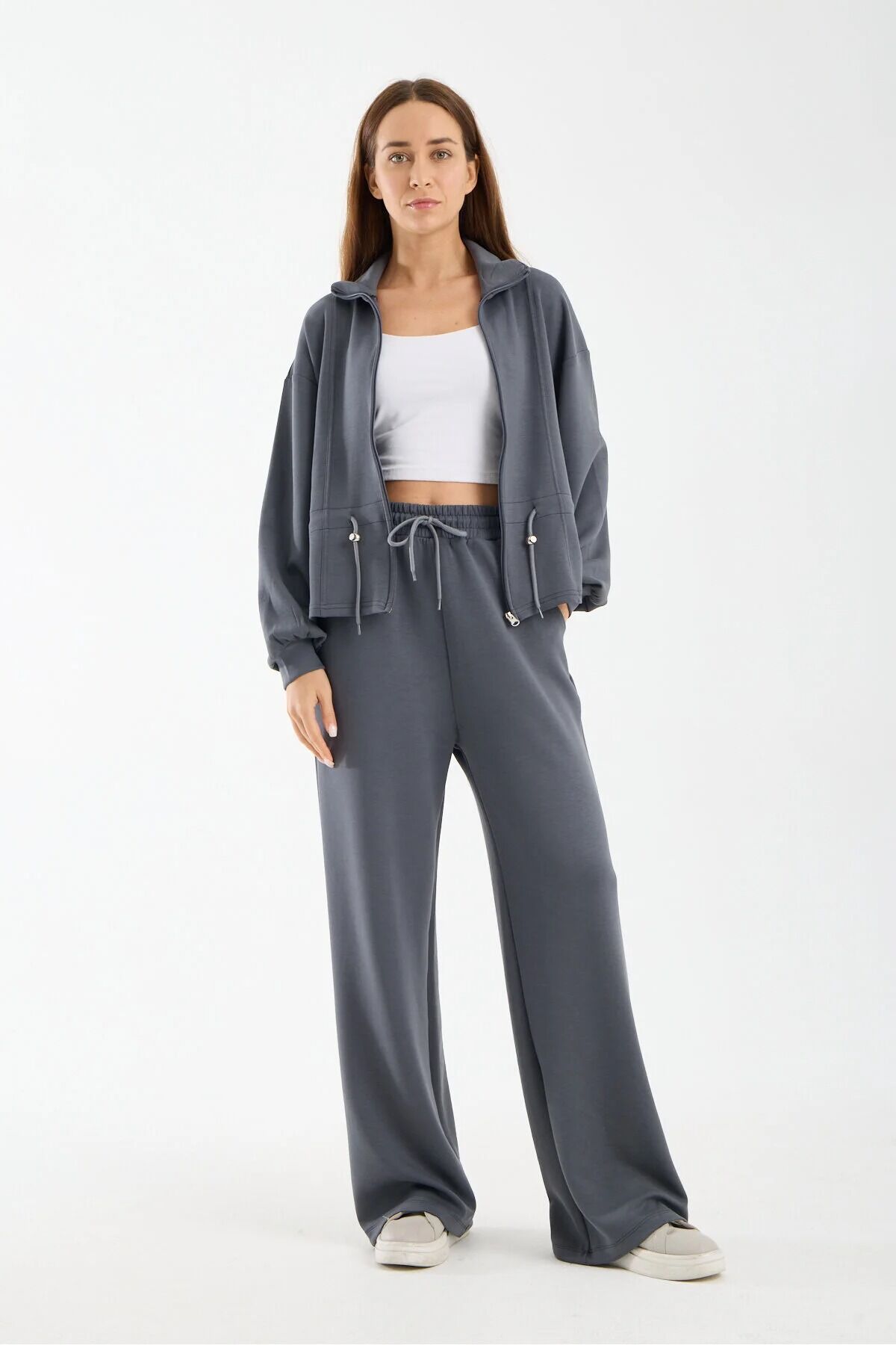 Kadın Modal Kumaş Fermuarlı Eşofman Takımı Bel Büzgülü Baggy Pantolon Rahat Spor Takım 1530 XL - KOYU GRİ