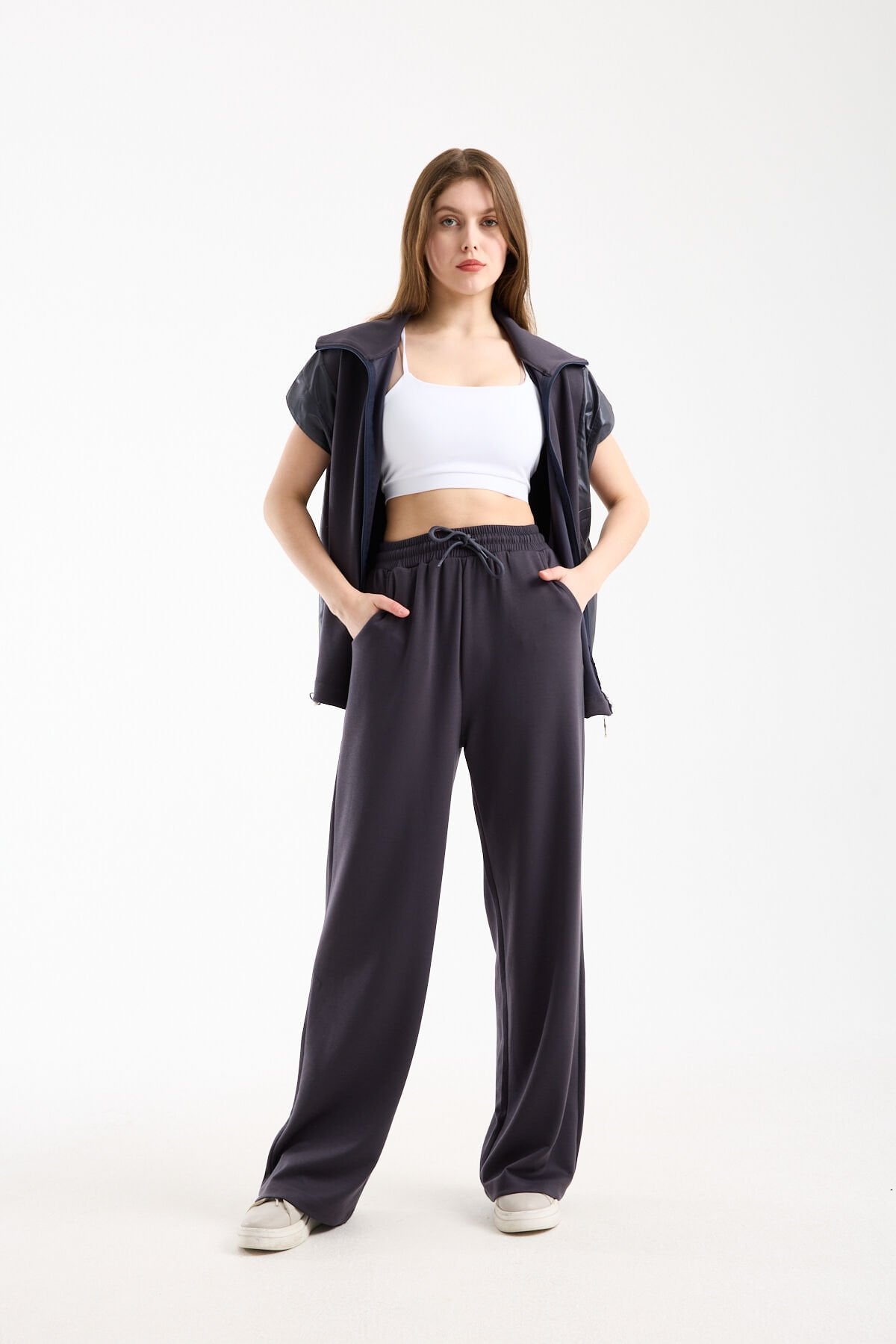 Kadın Modal Oversize Dik Yaka Tam Fermuarlı Kolsuz Salaş Jesica Garnili Eşofman Takımı, hem günlük şıklık hem maksimum konfor sunan modern bir 2’li takımdır. Oversize kesimi sayesinde salaş ve rahat bir duruş kazandırırken wide leg pantolon formu ile trend bir siluet oluşturur.