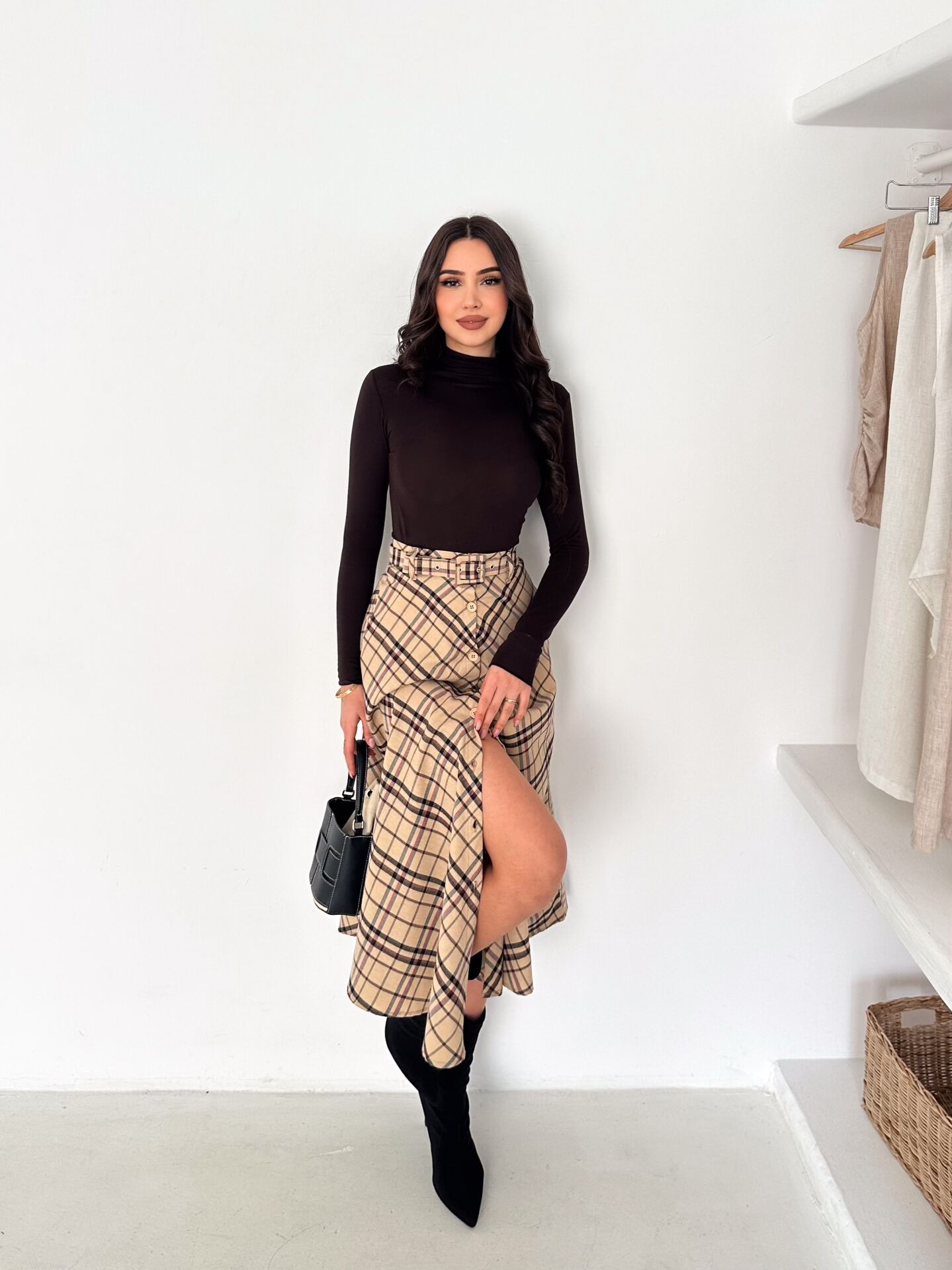 Yüksek bel ve lastikli bel yapısı konfor sağlarken, 88 cm uzunluğu dengeli ve zarif bir siluet oluşturur. Kloş formu hareket özgürlüğü sunar ve her vücut tipine uyum sağlar.