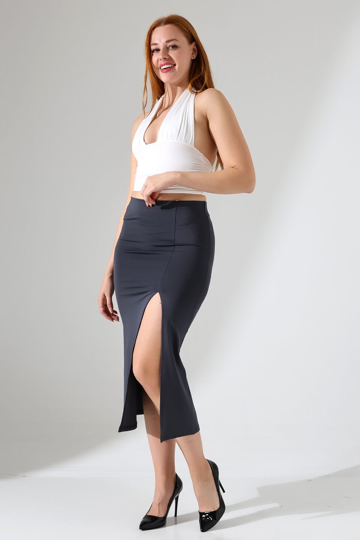 Kadın Önden Yırmaçlı Midi Boy Likralı Etek 2XL - ANTRESİT GRİ