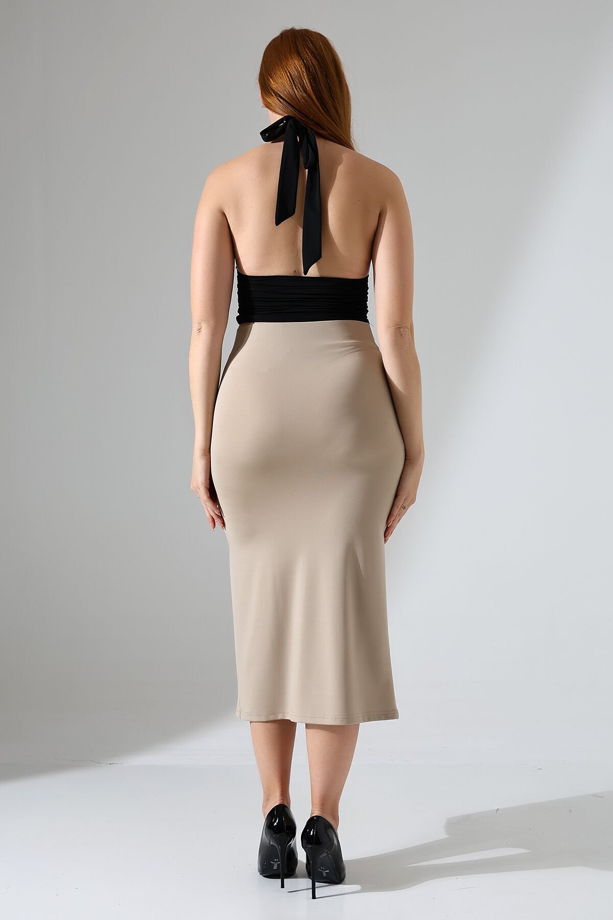 Kadın Önden Yırmaçlı Midi Boy Likralı Etek 2XL - BEJ
