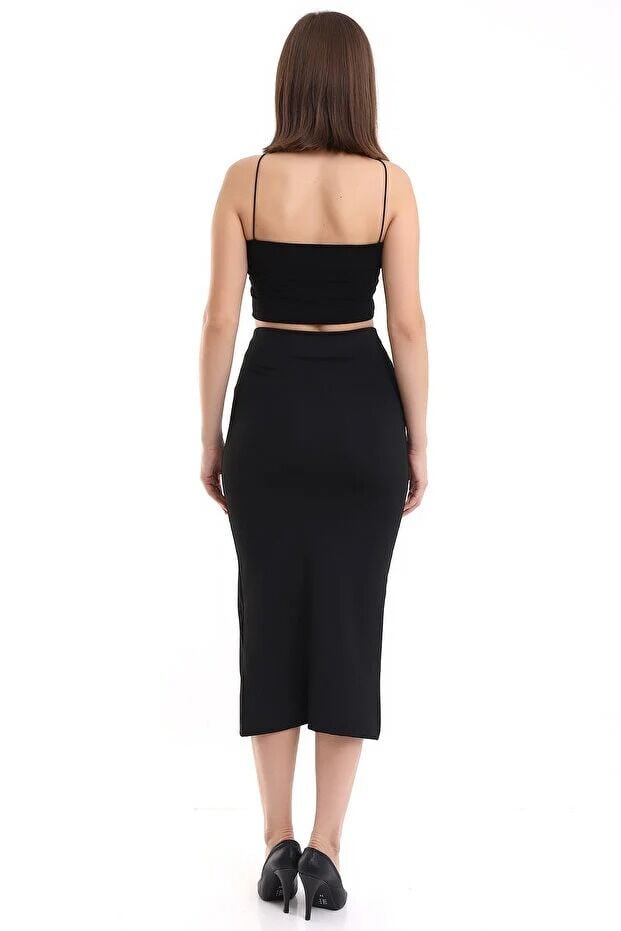 Kadın Önden Yırmaçlı Midi Boy Likralı Etek 2XL - SİYAH