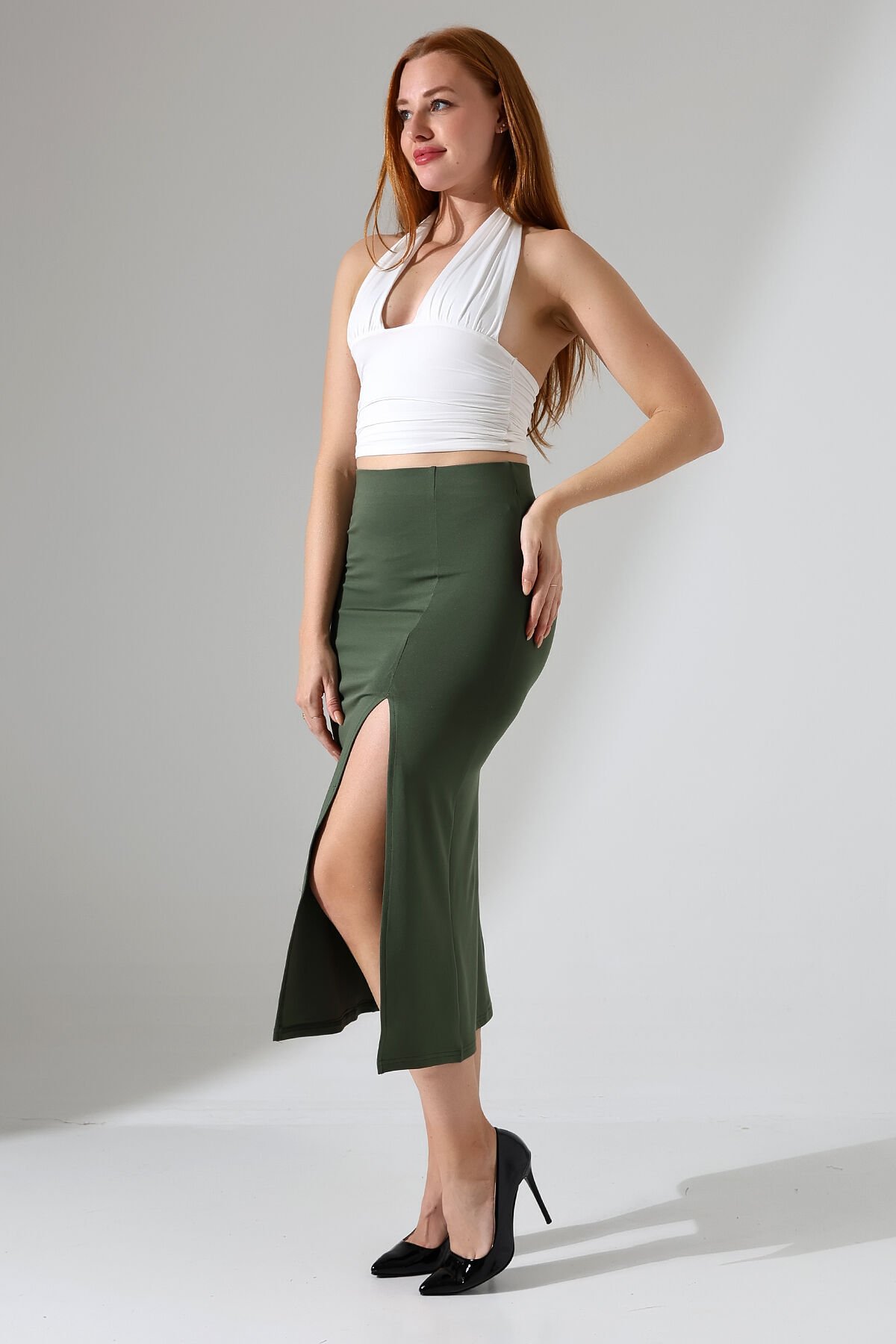 Kadın Önden Yırmaçlı Midi Boy Likralı Etek L - HAKİ YEŞİL