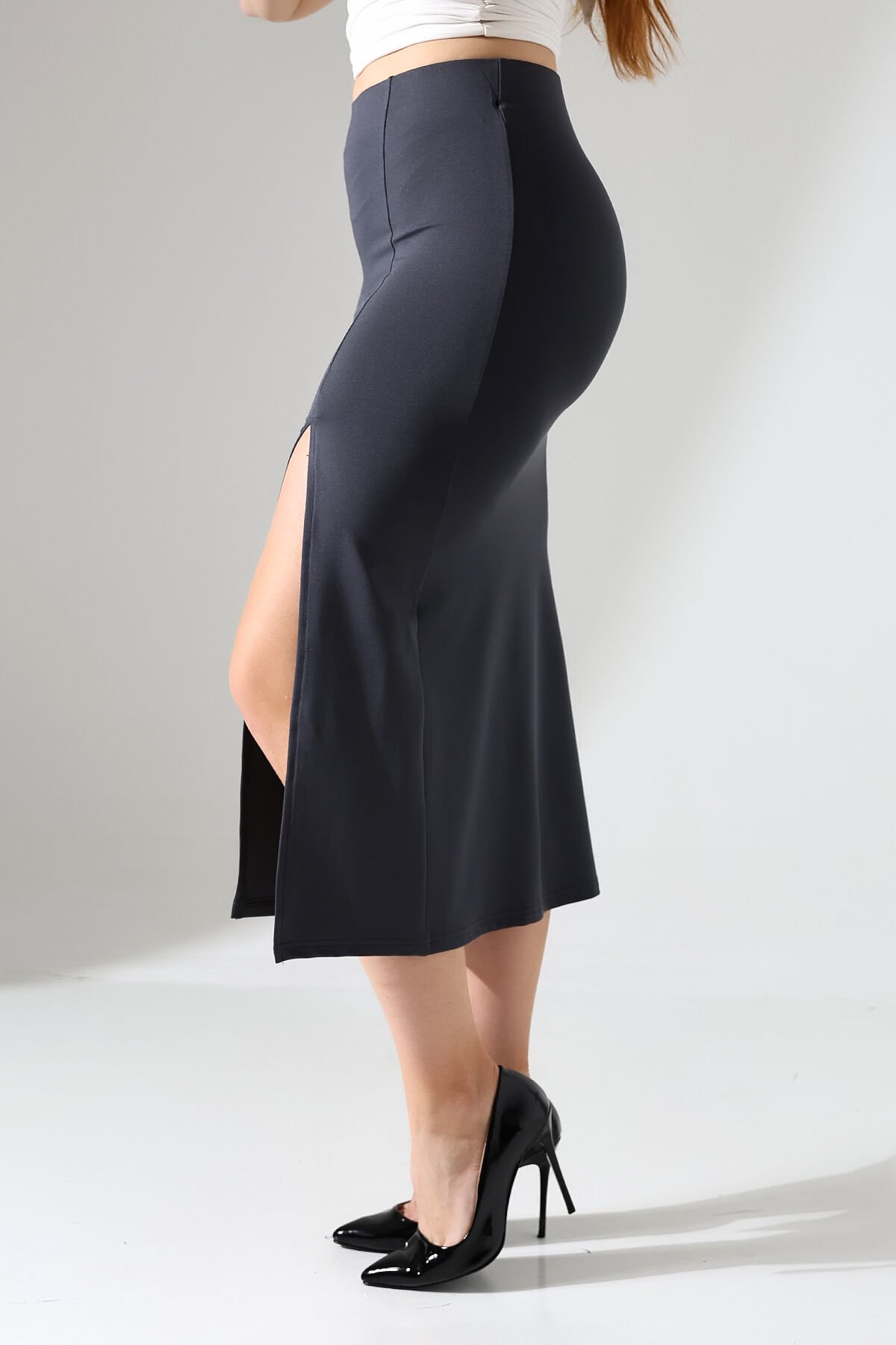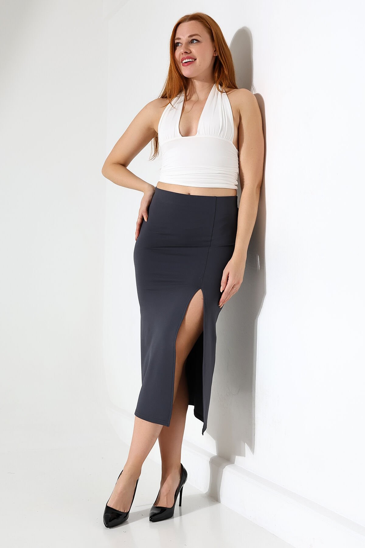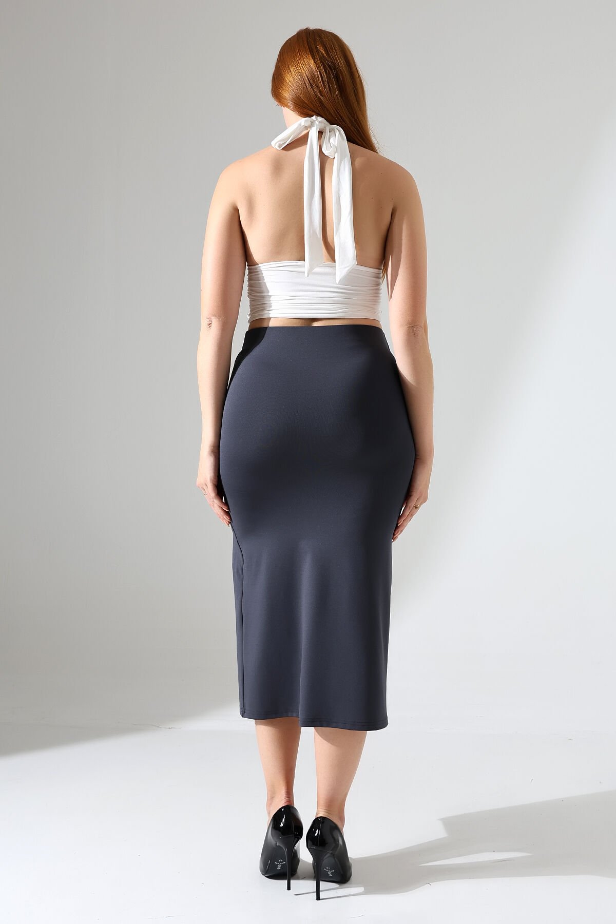 Kadın Önden Yırmaçlı Midi Boy Likralı Etek S - ANTRESİT GRİ