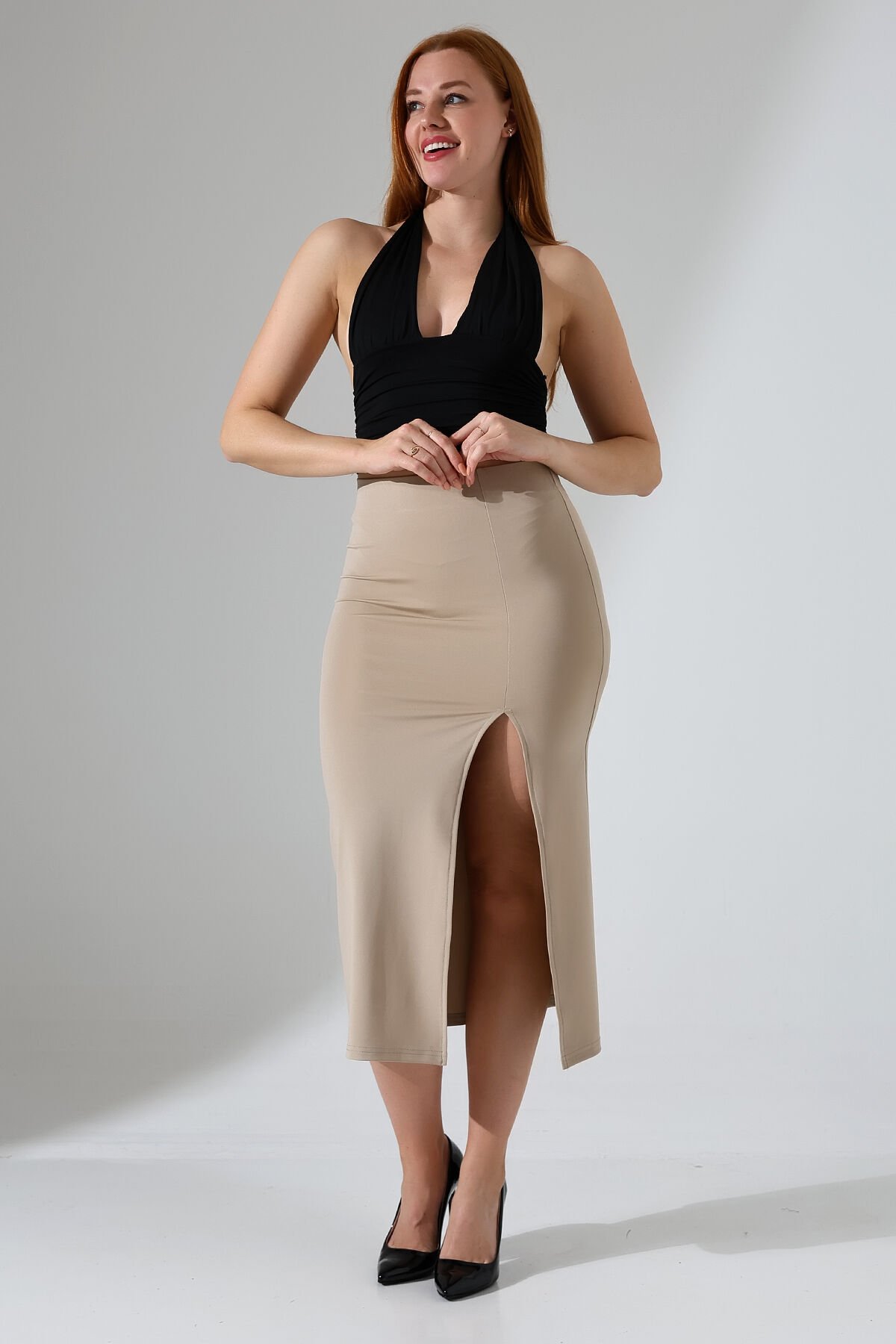 Kadın Önden Yırmaçlı Midi Boy Likralı Etek XL - BEJ