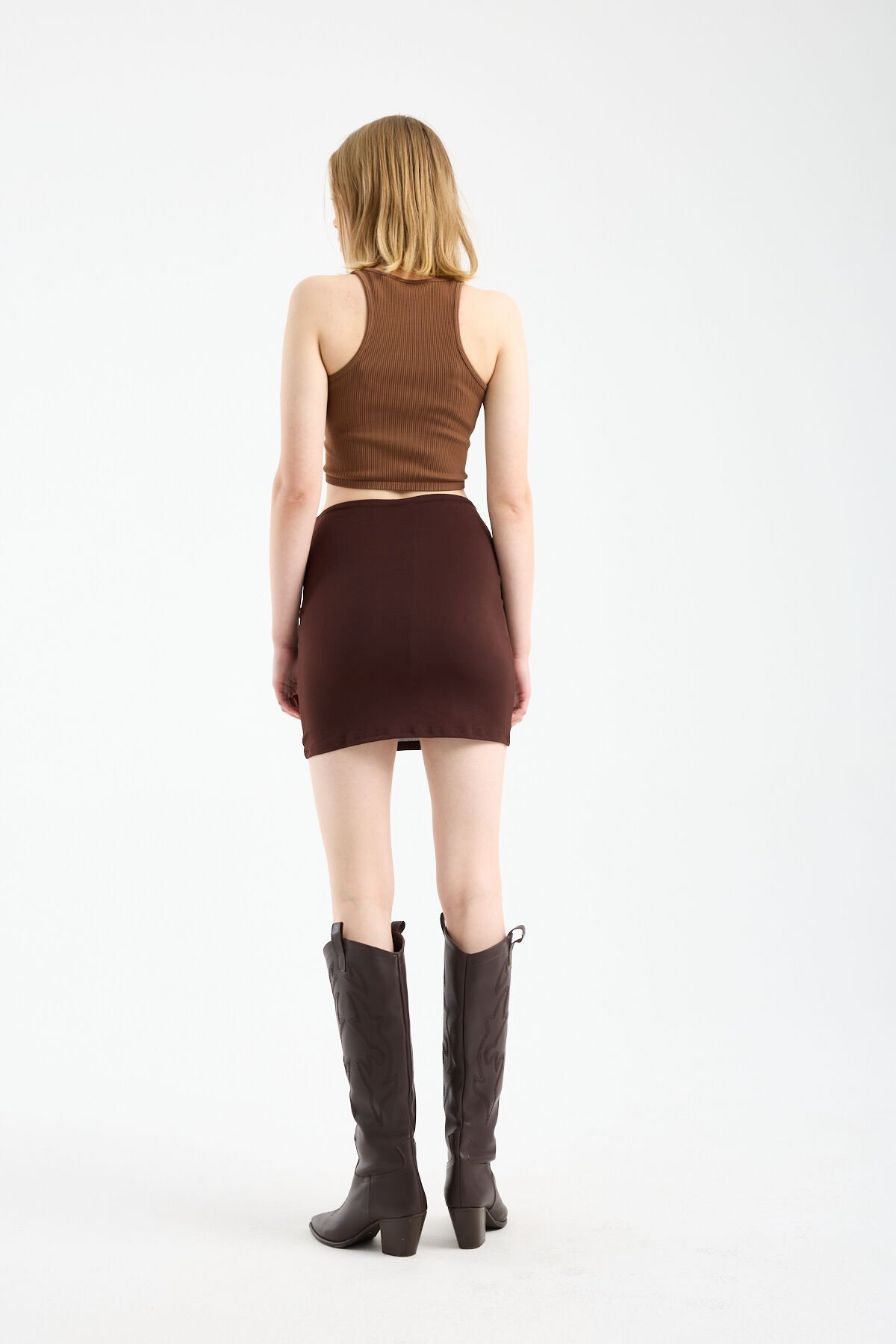 Kadın Önü Büzgülü İçi Astarlı Likralı Drapeli Sandy Kumaş Mini Etek WM 2XL - KAHVE