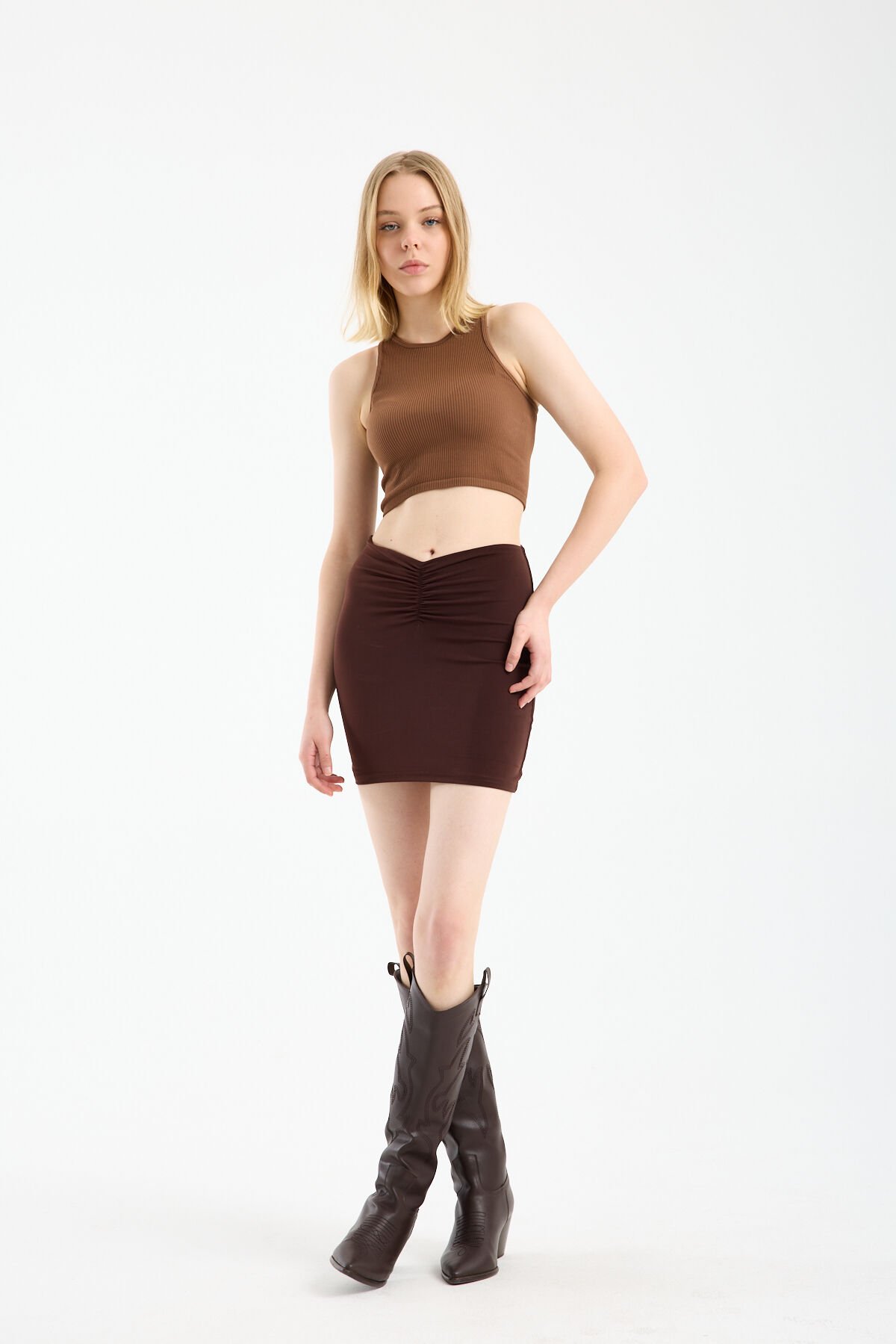 Kadın Önü Büzgülü İçi Astarlı Likralı Drapeli Sandy Kumaş Mini Etek WM XL - KAHVE