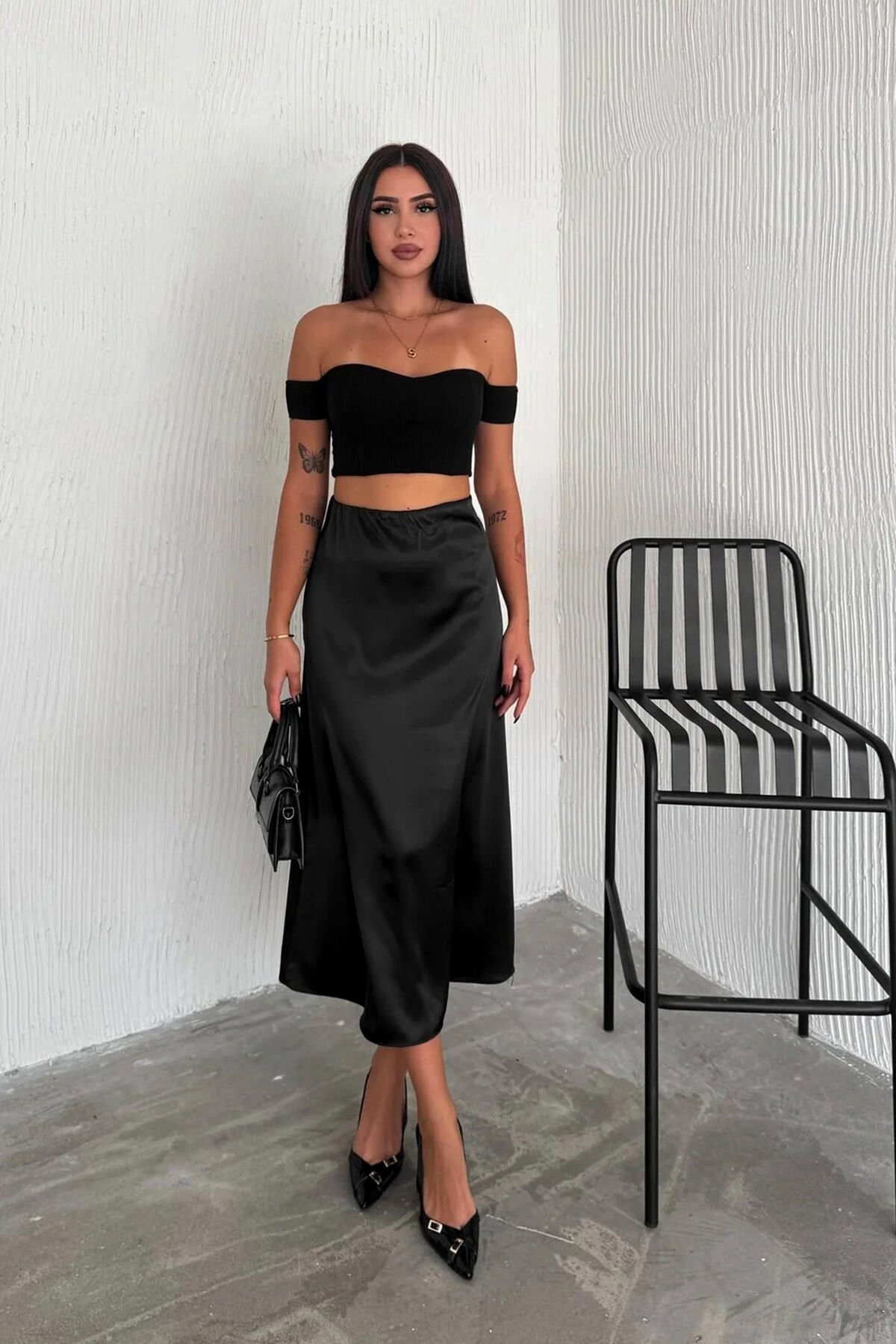 Kadın Saten Yüksek Bel 88cm Dokulu Etek, zarif saten dokusu ve akıcı formuyla günlük ve tesettür kombinlerinde şıklığı ön plana çıkarır. Dokuma saten kumaşı sayesinde parlak ve pürüzsüz bir yüzey sunarken, iç göstermeyen yapısı güvenli bir kullanım sağlar.