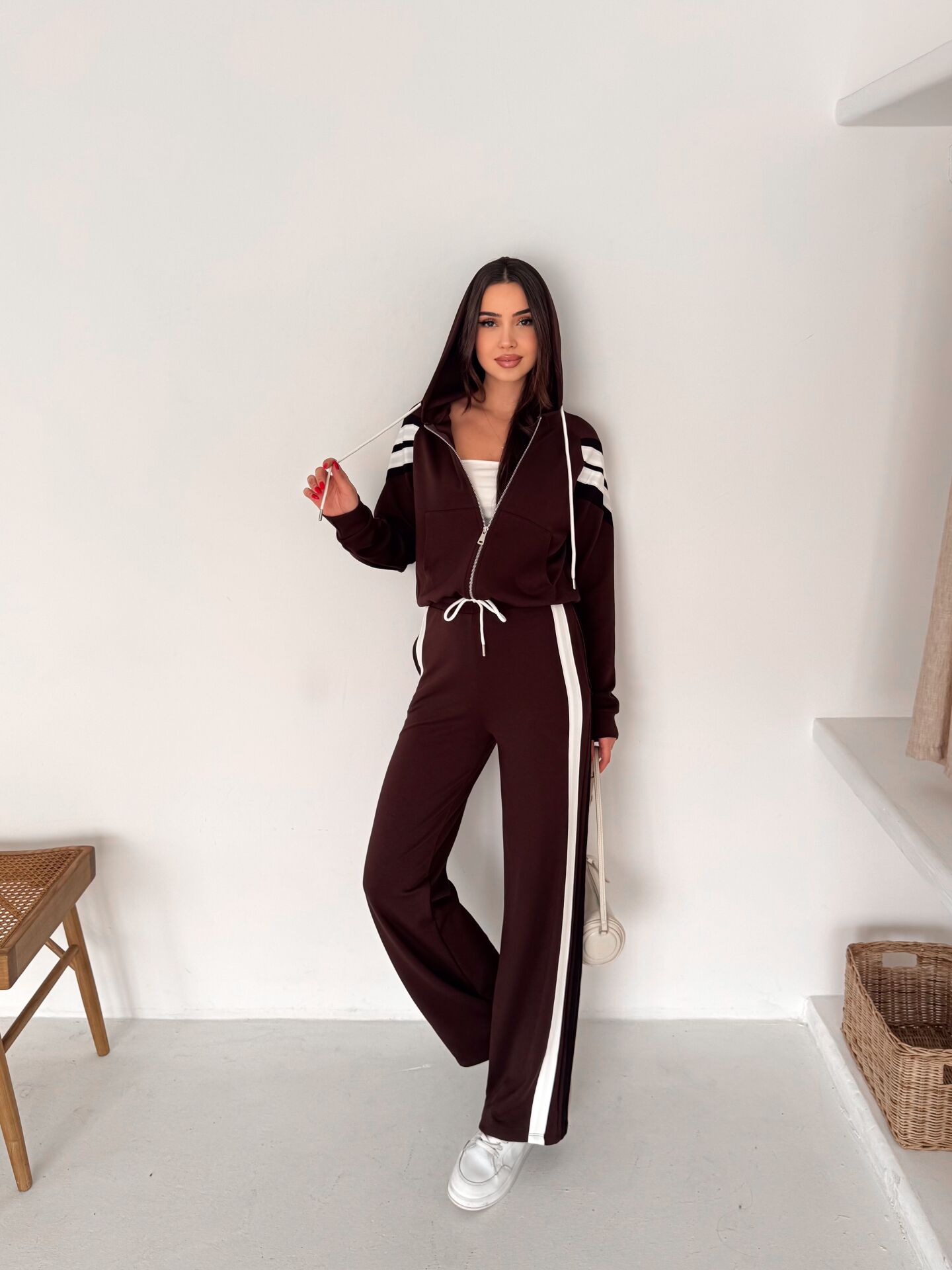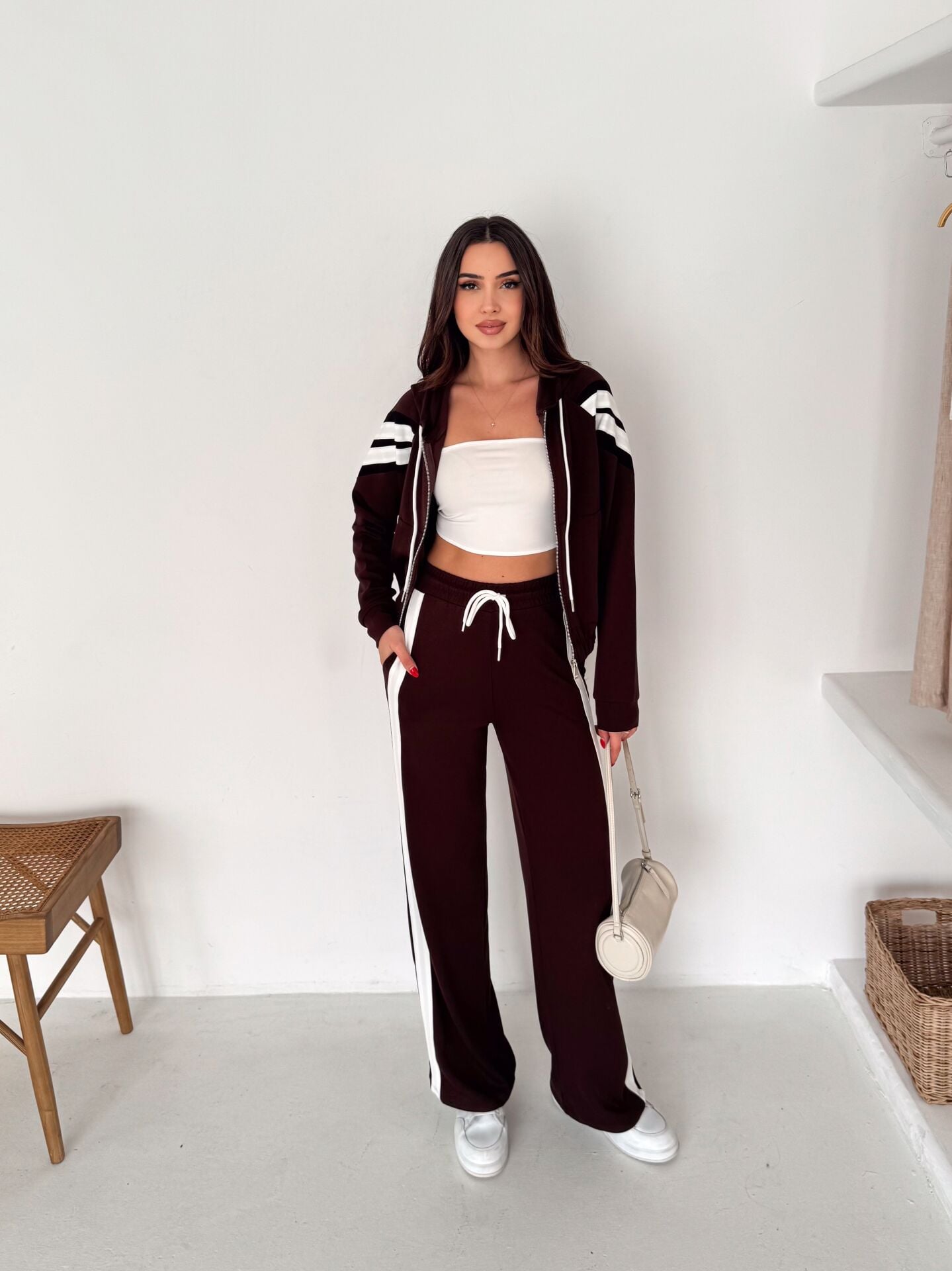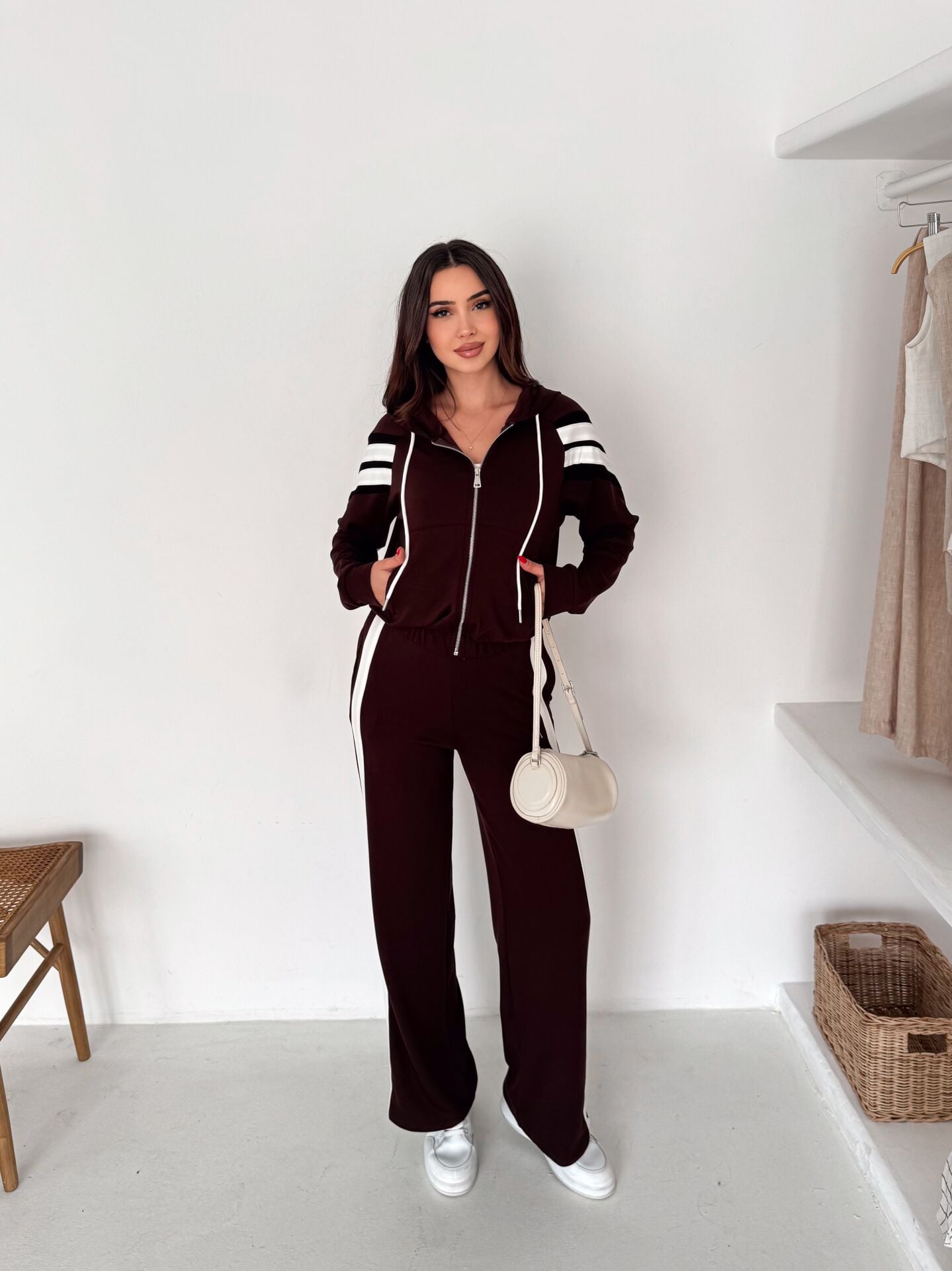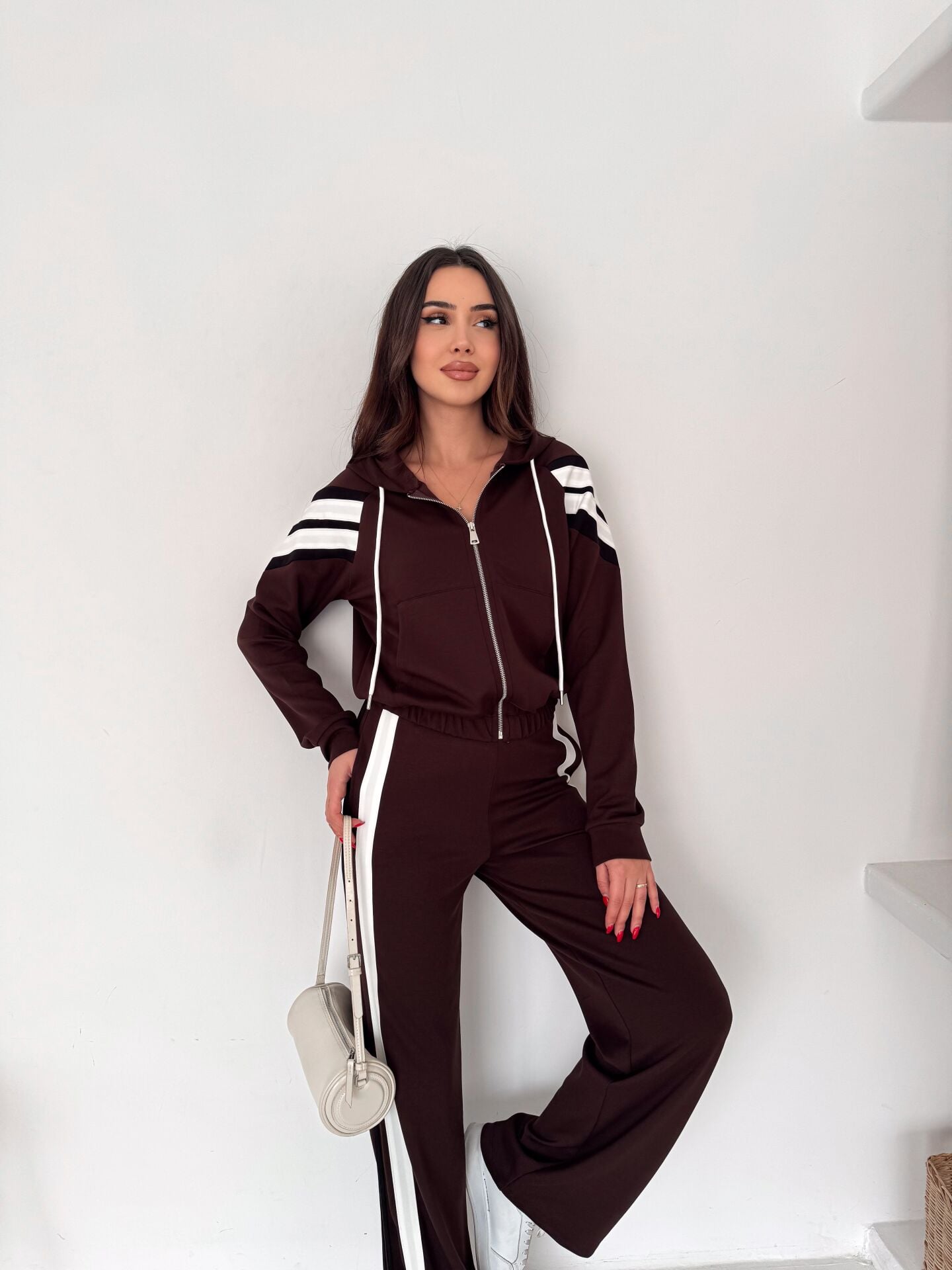 Kahverengi 2’li takım (sweatshirt + wide leg pantolon), “rahatım ama stilim de konuşsun” diyenlerin tam kalbinden vurduğu parça. Viskon karışımlı yumuşak dokusu ve elastan desteğiyle gün boyu konfor sağlar; hareket ettikçe üstünde duran bir takım değil, seninle akan bir stil gibi durur. Pantolon tarafında yüksek bel kesim beli toparlar, wide leg / geniş paça siluet bacak boyunu uzun gösterir ve salaş şıklığı tek hamlede verir. Sweatshirt tarafındaki fermuarlı yaka detayı ise takımı “basic”ten çıkarıp premium bir çizgiye taşır. Üstteki şeritli tasarım modern bir enerji katar; spor-şık kombinlerde tam oyun değiştirici. %65 viskon %30 polyester %5 elastan karışımı; yumuşaklık + form koruma + esneklik dengesini kurar. 2 iplik vortex örme yapısı daha tok bir duruş sağlarken, çift cepli tasarım günlük kullanımda pratiklik verir. Ofiste sneaker’la cool, şehirde botla iddialı, evde ise “konfor kraliçesi” vibe… Bu takım, dolabında “ne giysem” krizini bitiren kurtarıcı set. Winmoda çizgisinde, tek paketle komple kombin: sepete at – çıkar giy – gün senin.