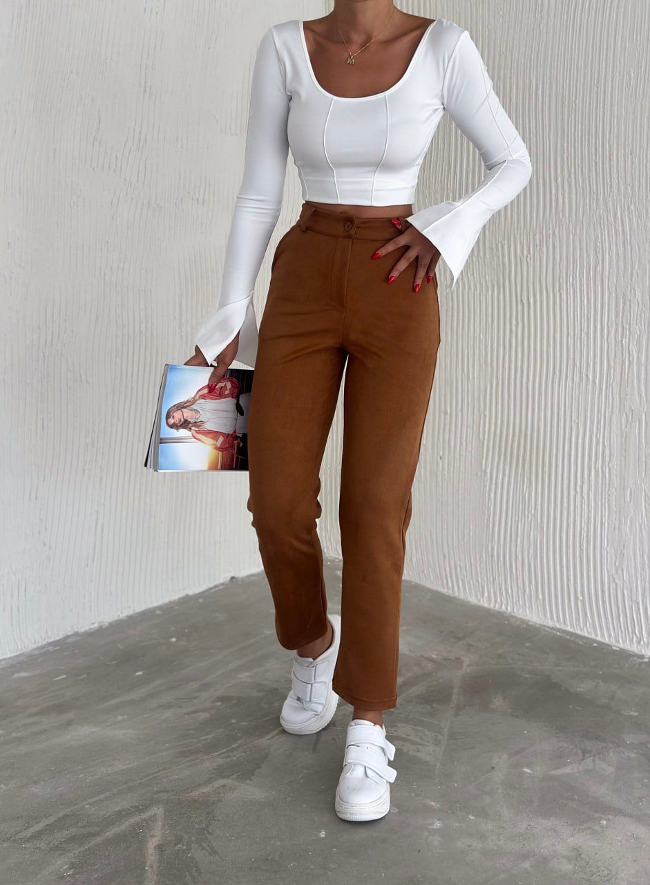 Kadın Süet Yüksek Bel Havuç Pantolon / women suede fabric high waist trousers S - KAHVERENGİ