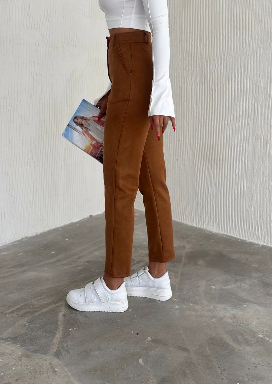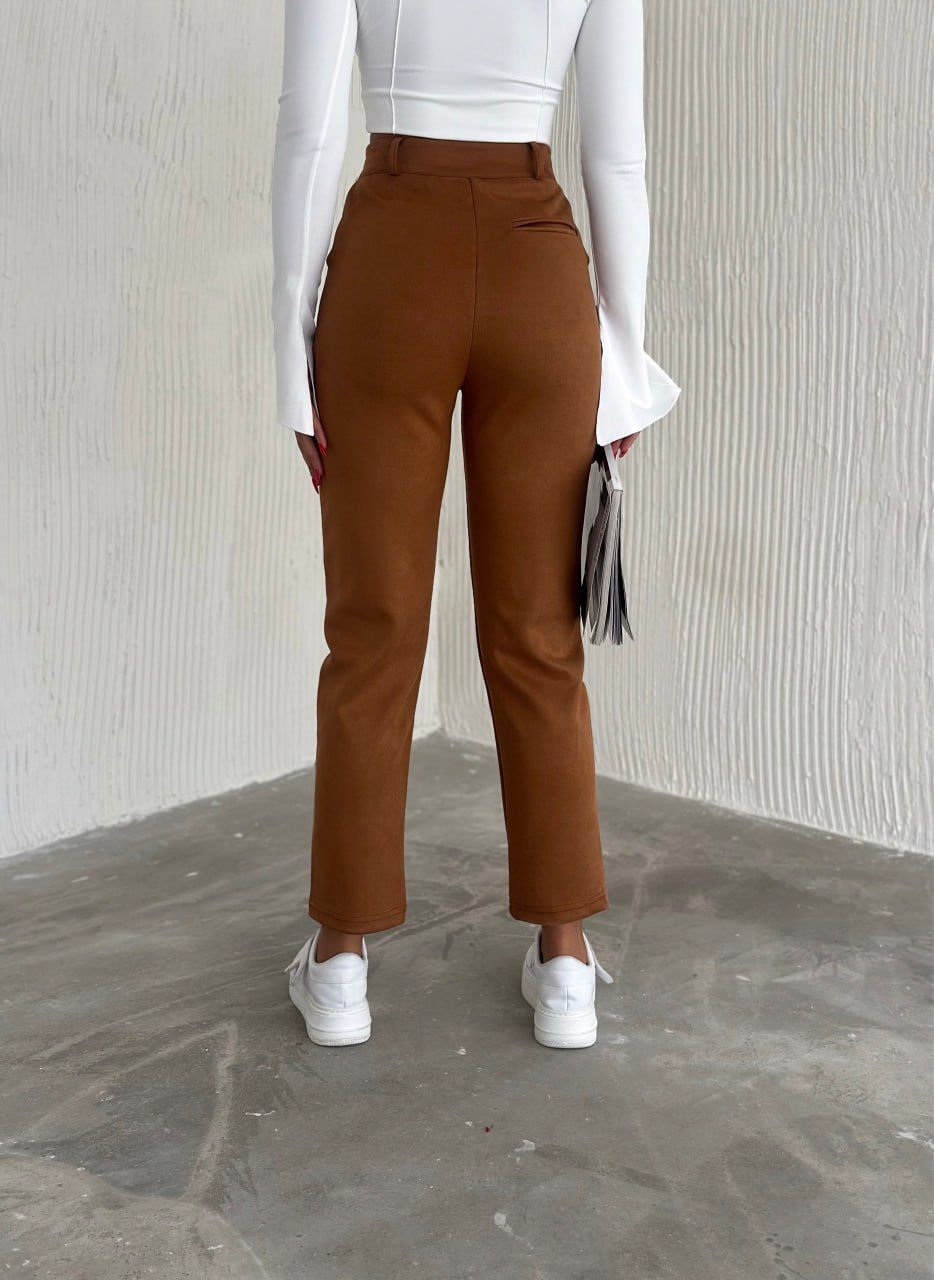 Kadın Süet Yüksek Bel Havuç Pantolon / women suede fabric high waist trousers XL - KAHVERENGİ