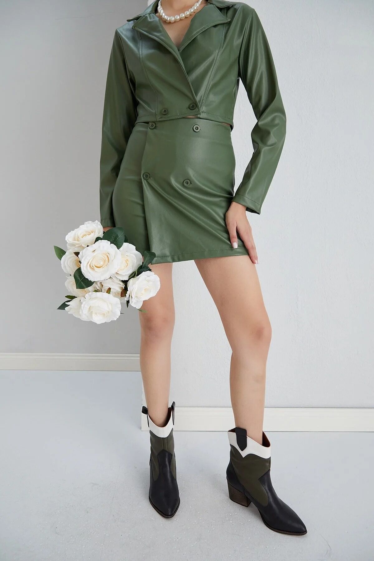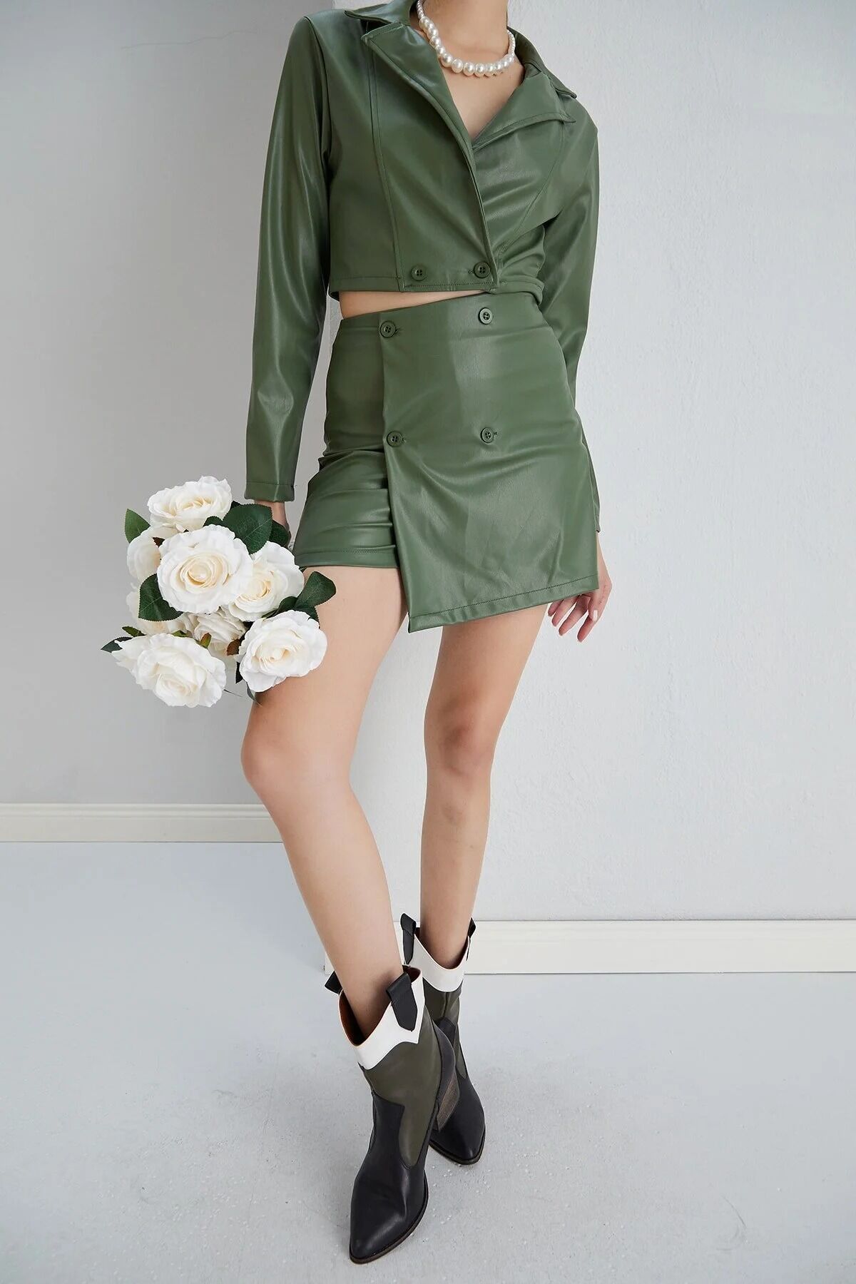 Gömlek yaka hırka ve uyumlu alt parçadan oluşan bu set, yüksek bel tasarımı ve kısa boyuyla dinamik bir siluet çizer. Kırışmaya dayanıklı ek özelliği ve düğmeli detaylarıyla öne çıkan suni deri şort kombinli bu takım, Basic koleksiyonun en özel parçalarındandır.