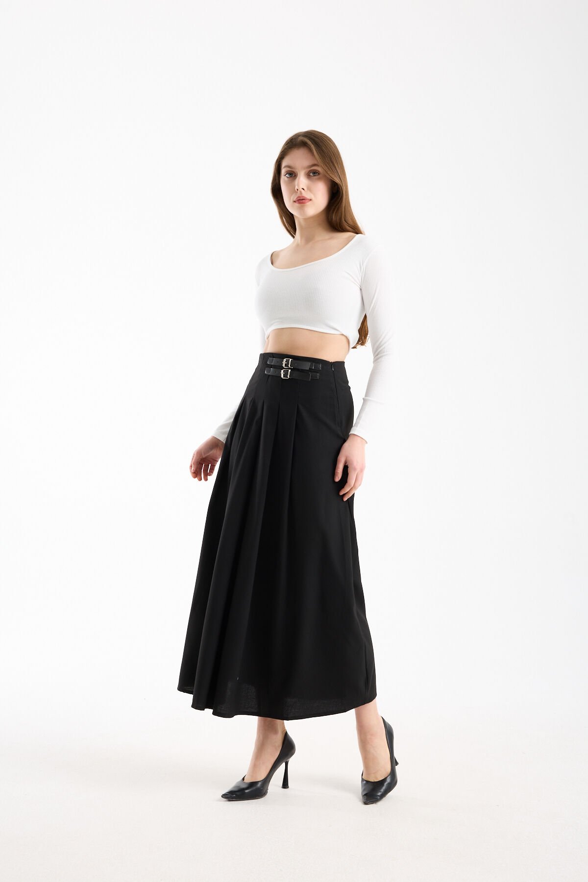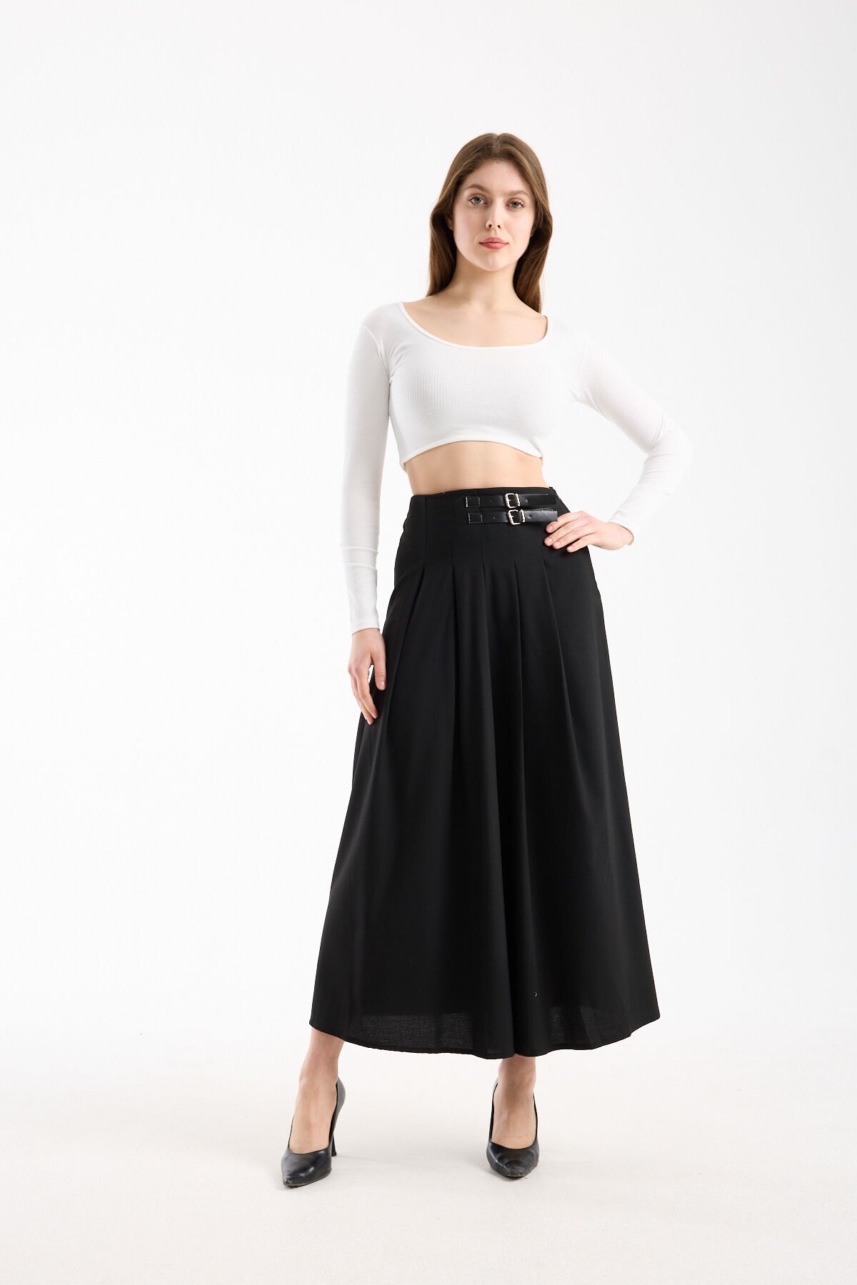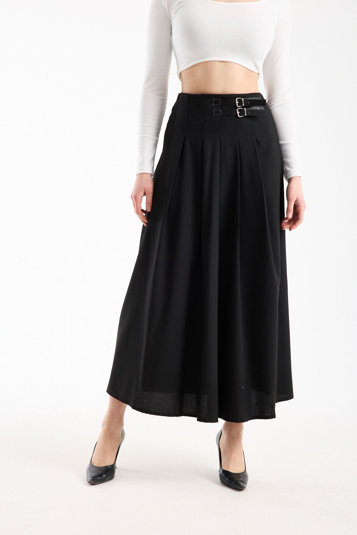 Kadın Uzun Maxi Etek 94 Cm Yan Kemer Detaylı Pileli Tesettür Siyah Kahve S/XL XL - SİYAH