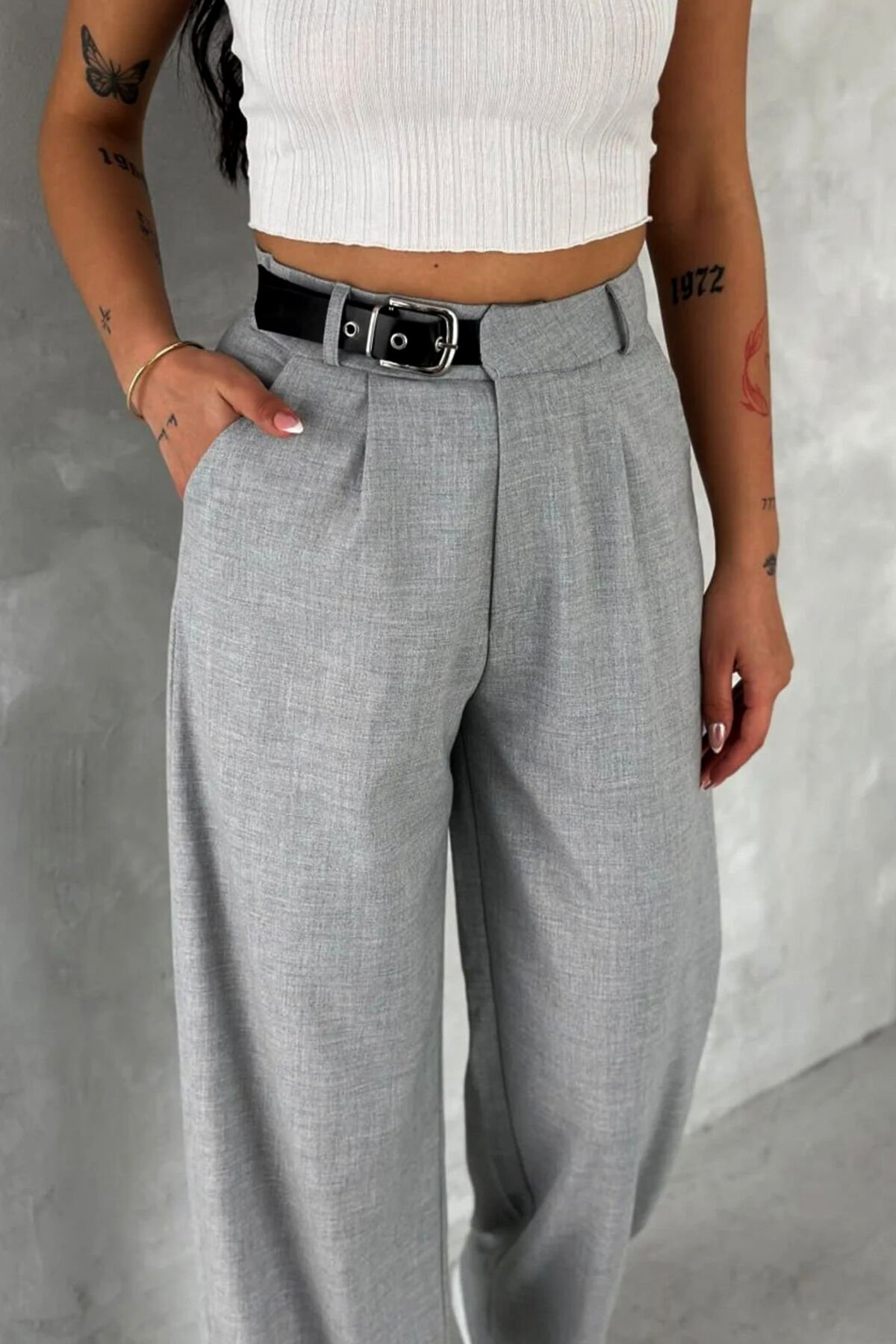 Kadın Yan Kemerli Toka Detaylı Baggy Kumaş Pantolon 2492 L - AÇIK GRİ