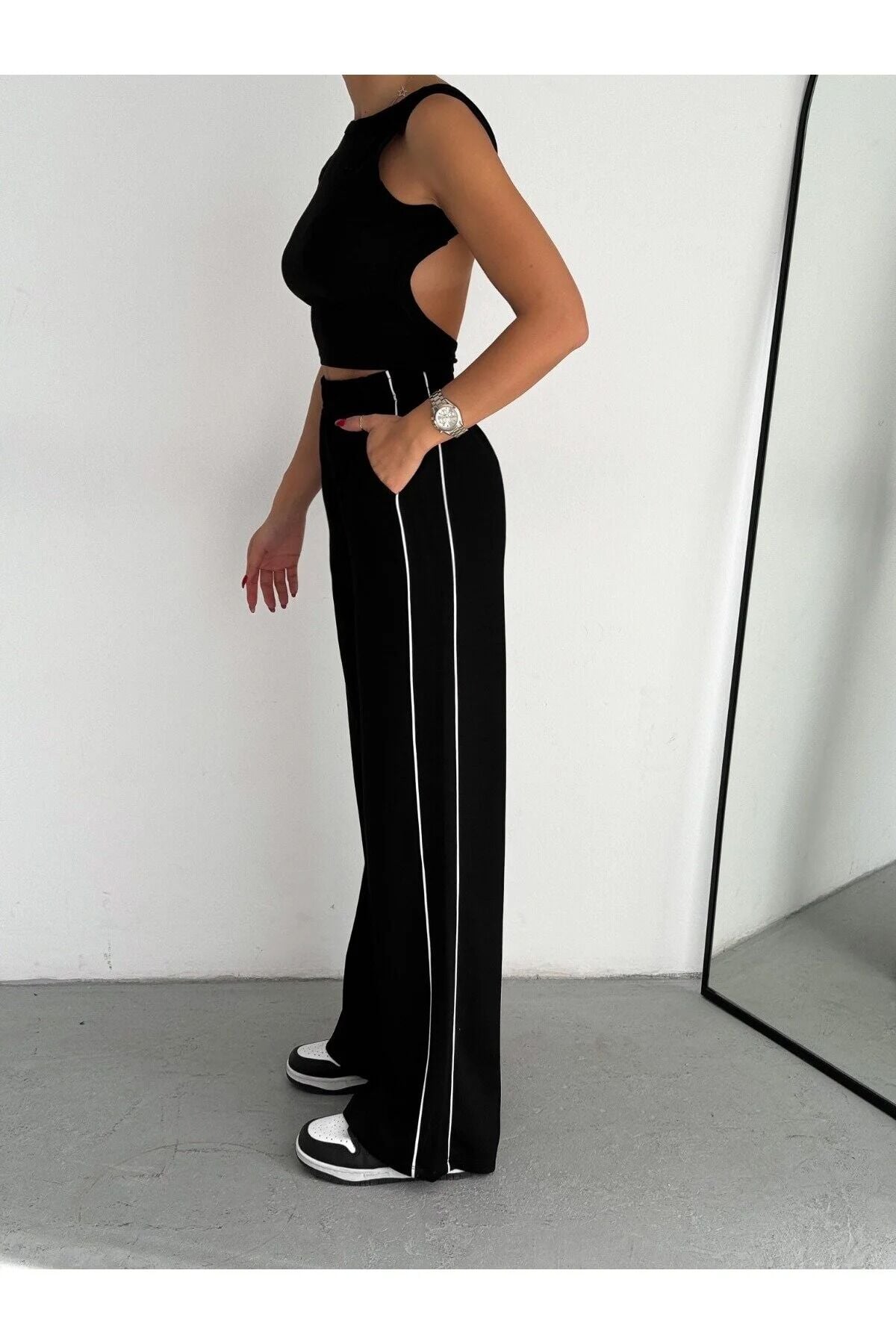Sportif çizgileriyle öne çıkan yandan şeritli eşofman altı tasarımı, dinamik bir görünüm oluşturur. Biyeli detaylar sade yüzeyi hareketlendirir ve estetik bir bütünlük sağlar. Günlük kombinlerde spor ayakkabı ya da basic üstlerle kolayca tamamlanabilir.