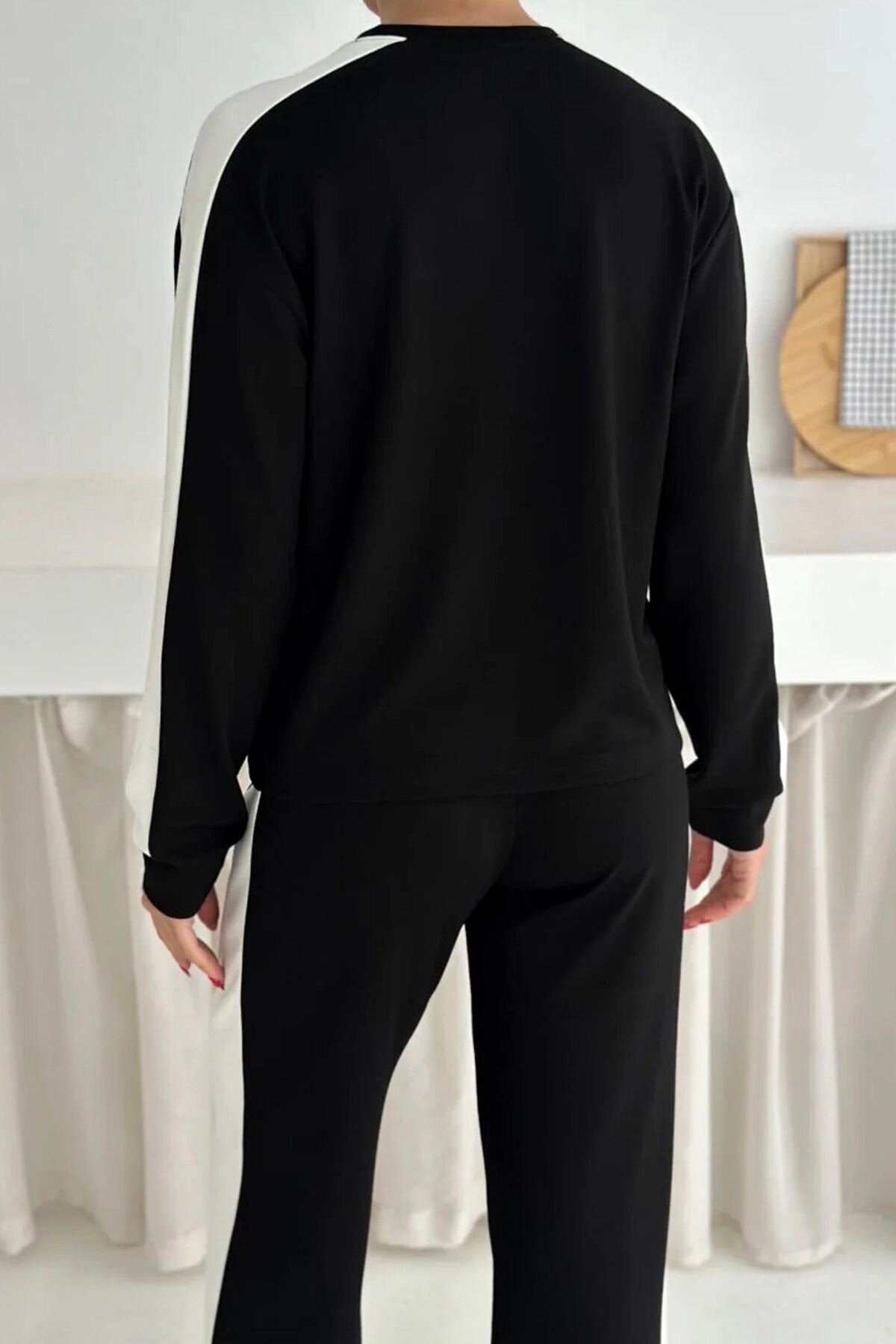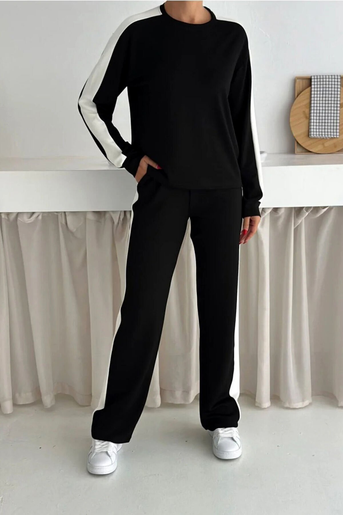 Baggy kalıp ve wide leg paça formu rahat bir duruş sunarken, yanlardaki beyaz şerit detayları takıma sportif ve dinamik bir hava kazandırır. Yüksek bel ve ayarlanabilir bel yapısı vücudu sıkmadan konforlu bir kullanım sağlar. Uzun kollu bisiklet yaka sweatshirt tasarımı, serin havalarda ideal bir koruma sunar.